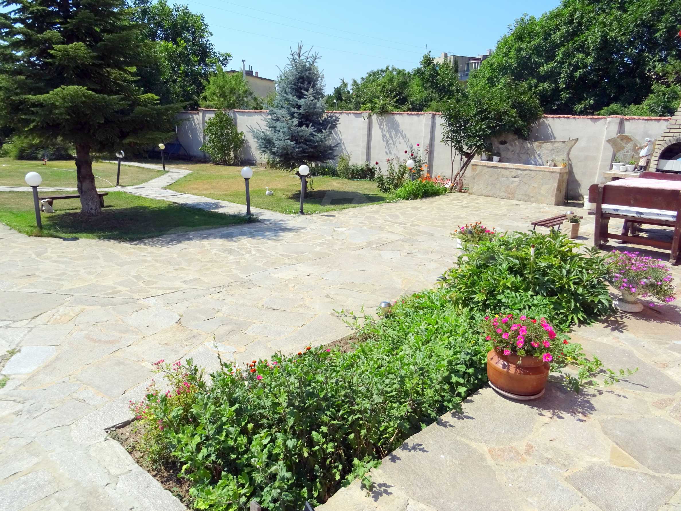The yard is perfectly maintained and very well landscaped, there are seating areas, a summer kitchen with barbecue.