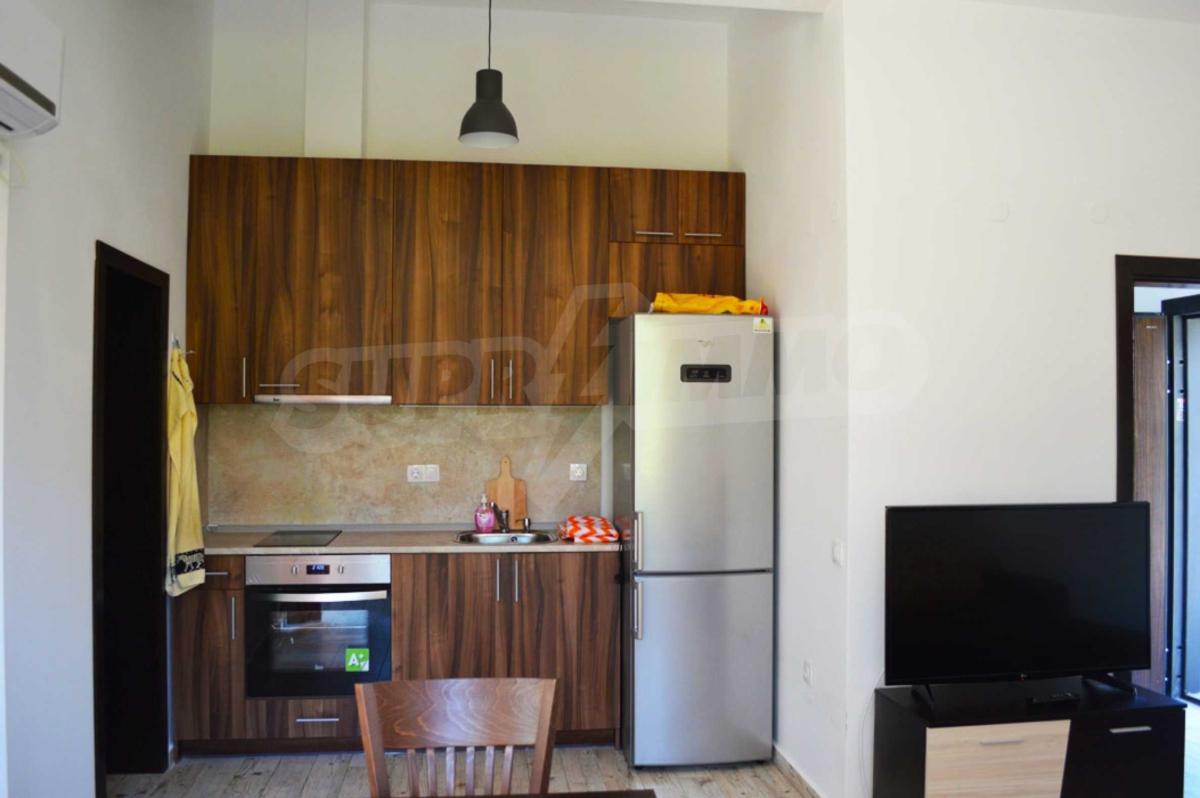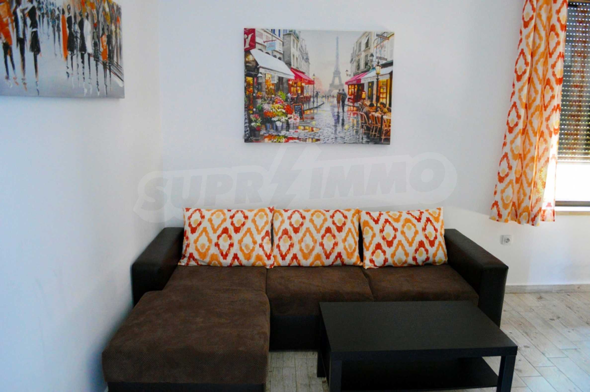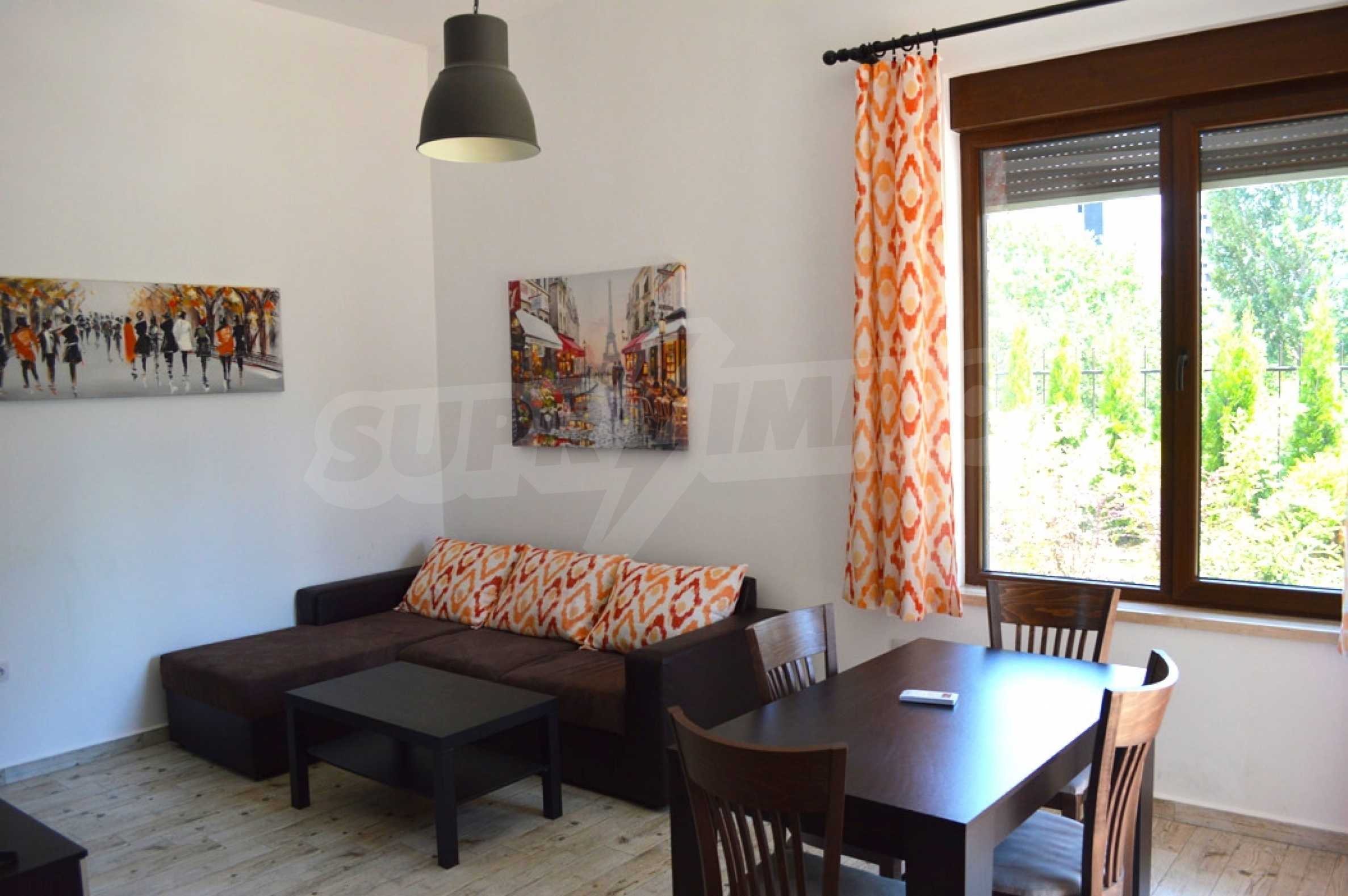 The apartment of 59sq. m. - terrace and garden of 28sq. m., common garden and alleys of 1372 square meters in the complex. Possible parking spaces in the underground part, an elevator providing a warm connection between garages and apartments.