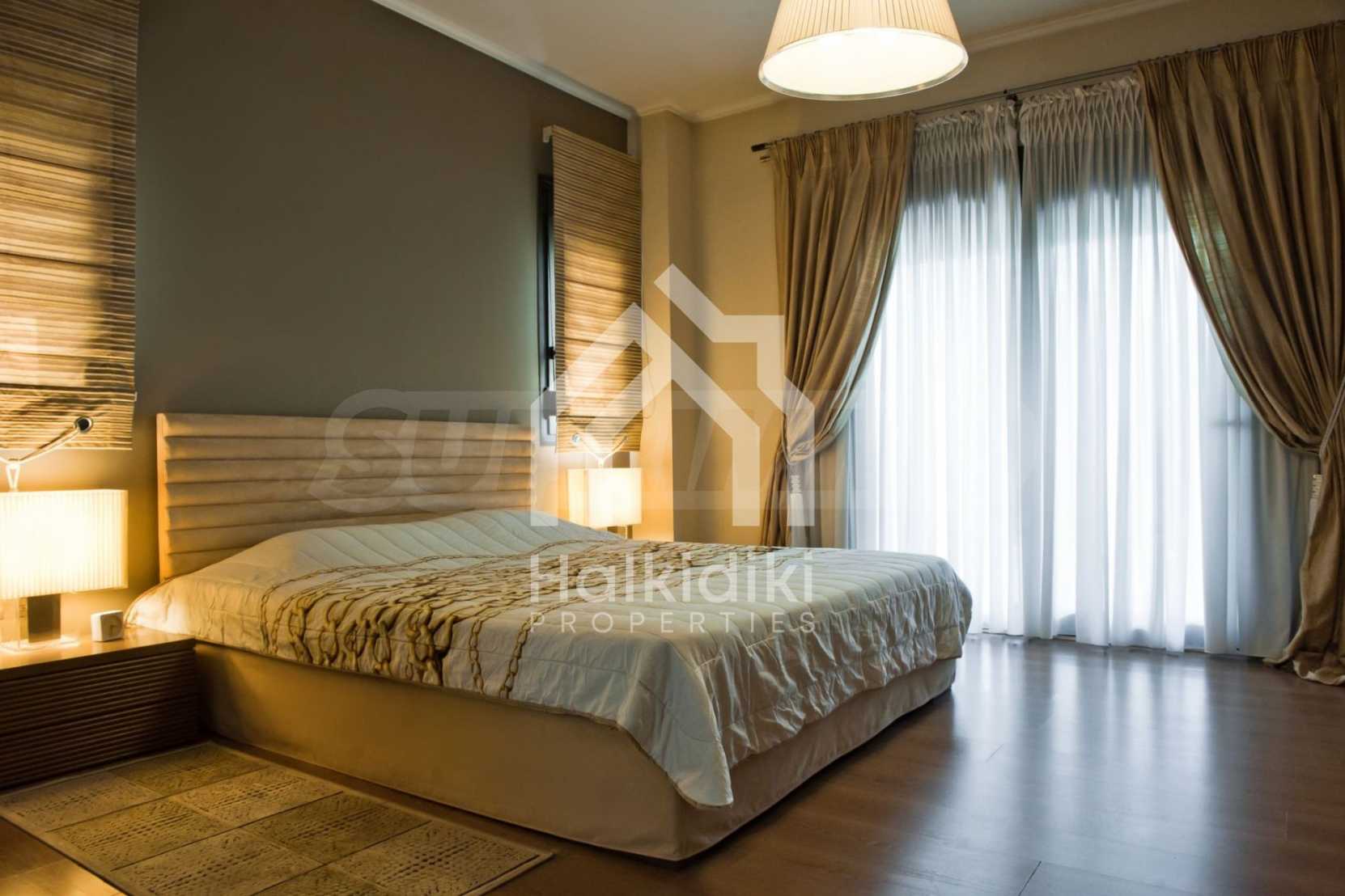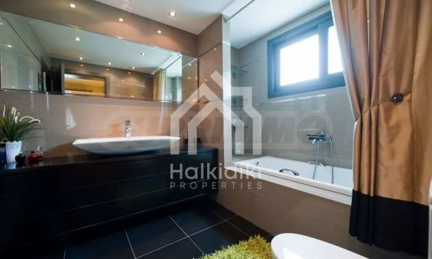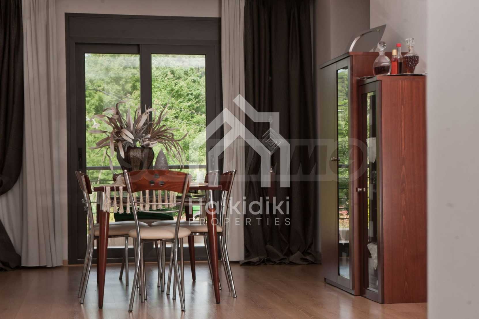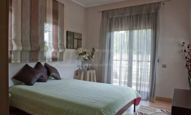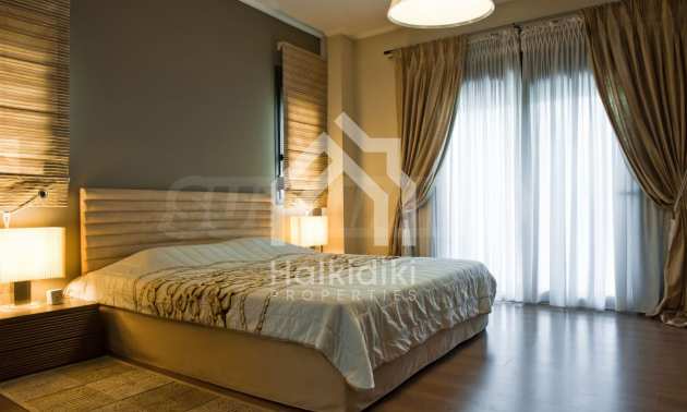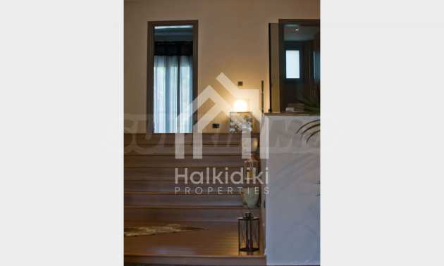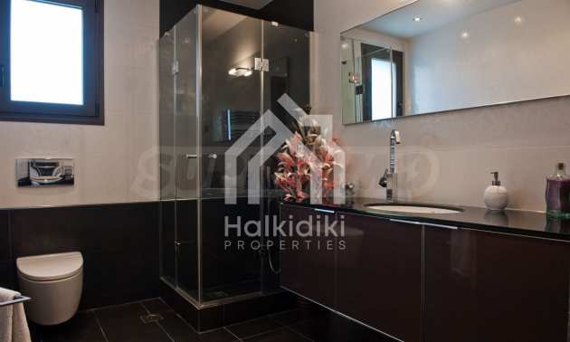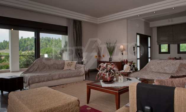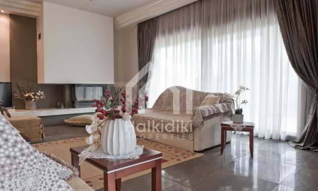 Beautiful,luxurious villa,600 m²,in Kassandra,Halkidiki with an eastern orientation and with unobstructed permanent view.The property is 700 m. away from the center of the village and it is surrounded by 1.300m² plot.The villa is split in three different apartments,consisted of two living rooms connected with the kitchens,six bedrooms,five bathrooms and three storage rooms.The property,also,has big balconies,aluminum joinery,security door,boiler,garage,jacuzzi,energy fireplace and alarm system pre-installation.The villa is fully equipped and furnished.