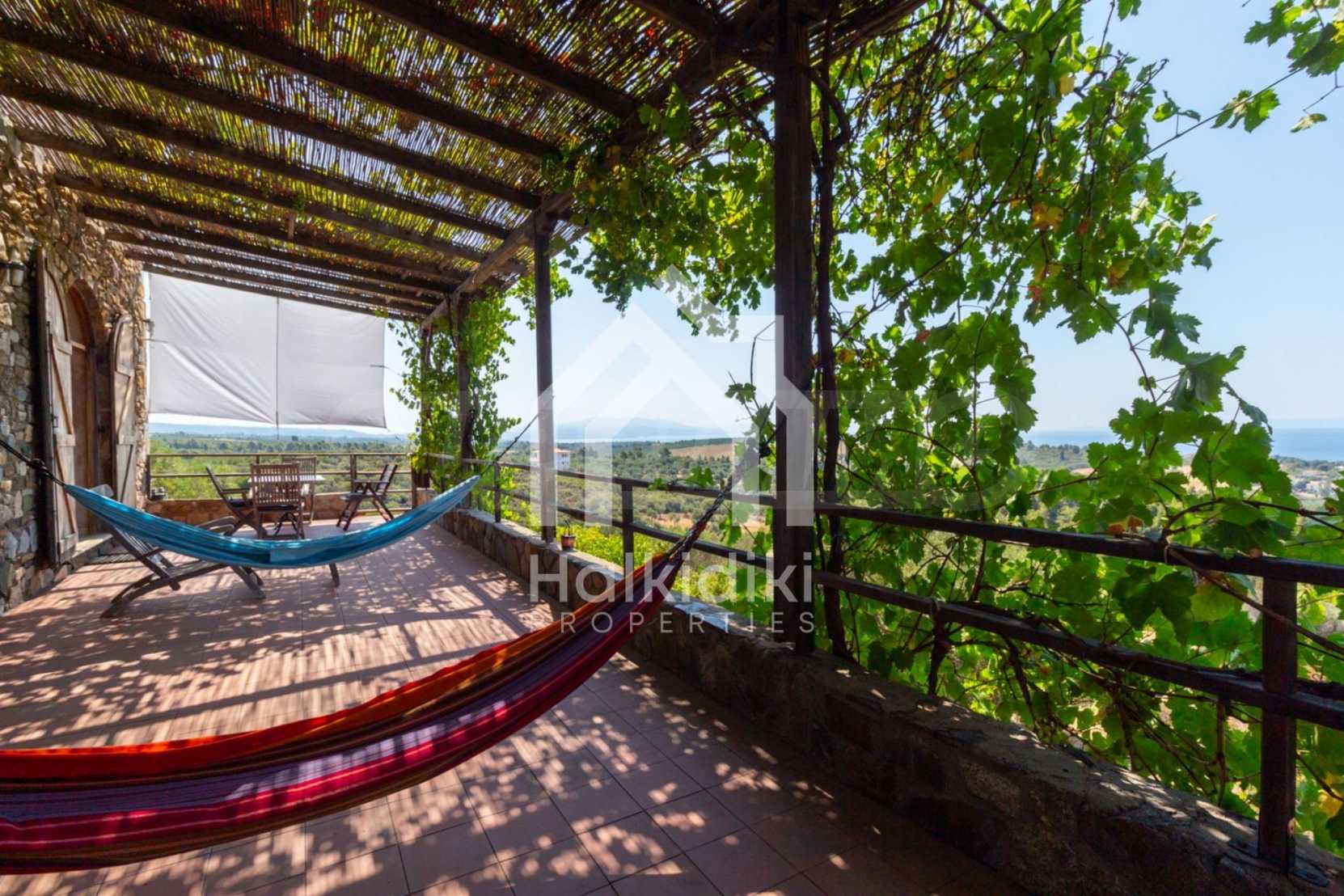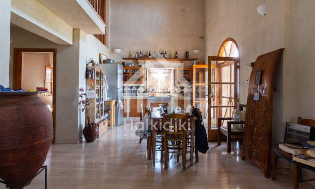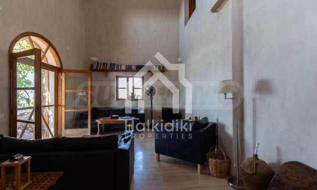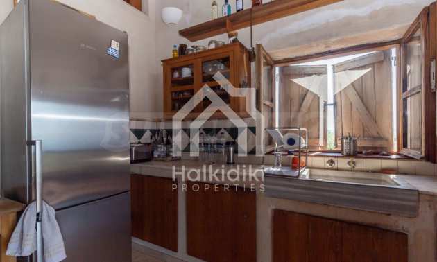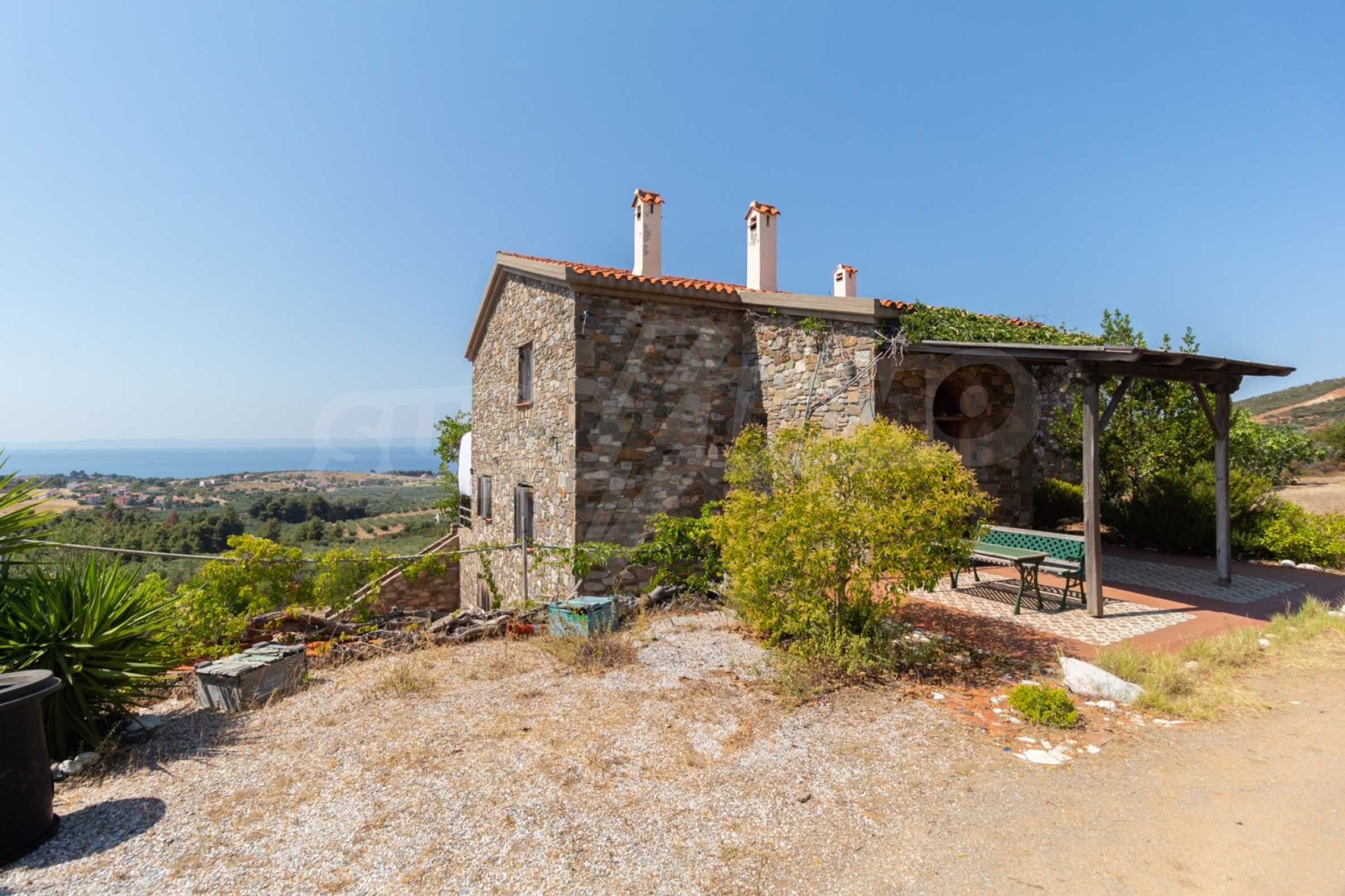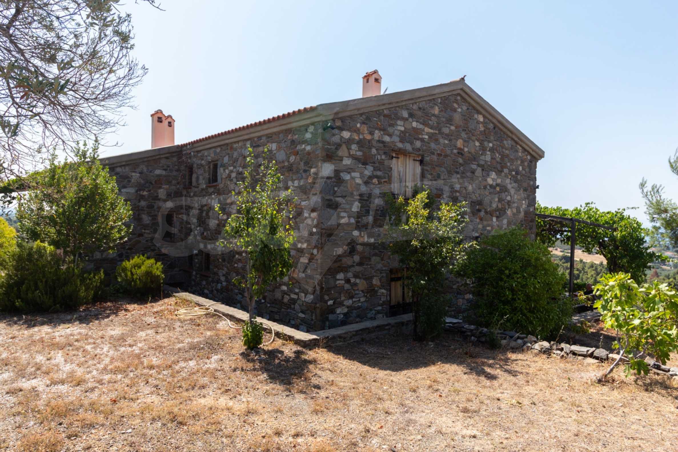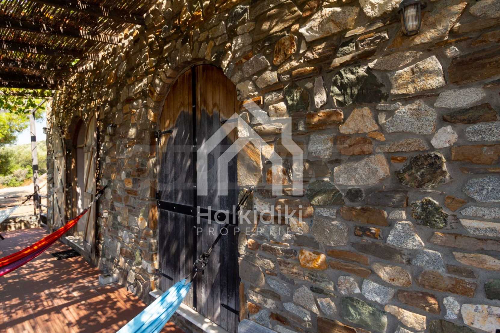Stone-built detached house,302 m²,in Sithonia,Halkidiki with a western orientation and with unobstructed permanent sea view.The property is 2 km. away from the beach,3 km. away from the center of the village and is surrounded by 13,5 acres plot.The house is split in three levels, consisted of a living room connected with the kitchen and the dining room,two bedrooms and two bathrooms on the ground floor,two bedrooms and a bathroom on the first floor and a storage room with boiler room on the basement.The property,also,has big balconies and alarm system.The house is fully equipped and furnished.