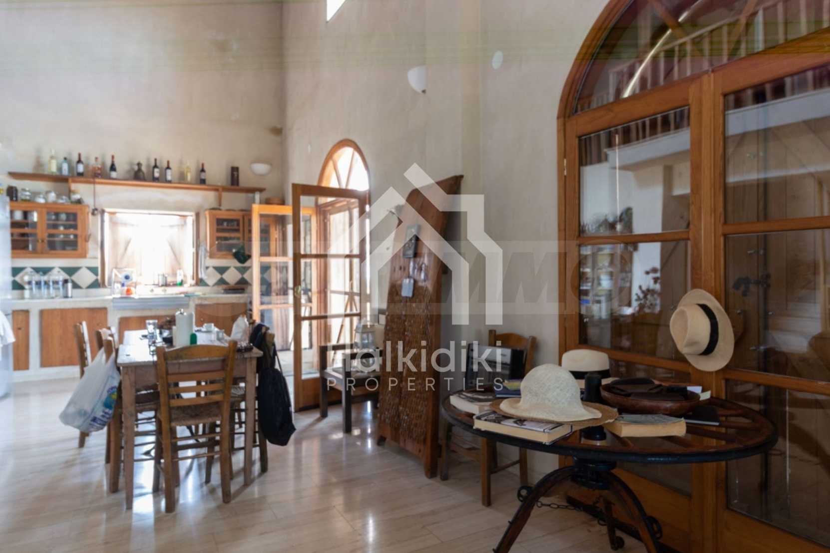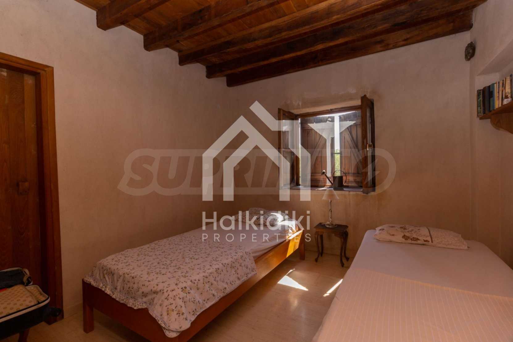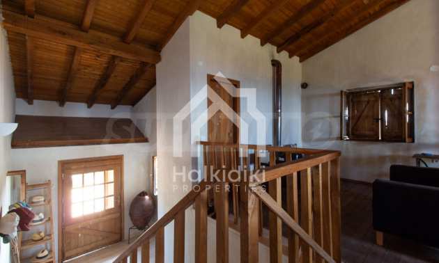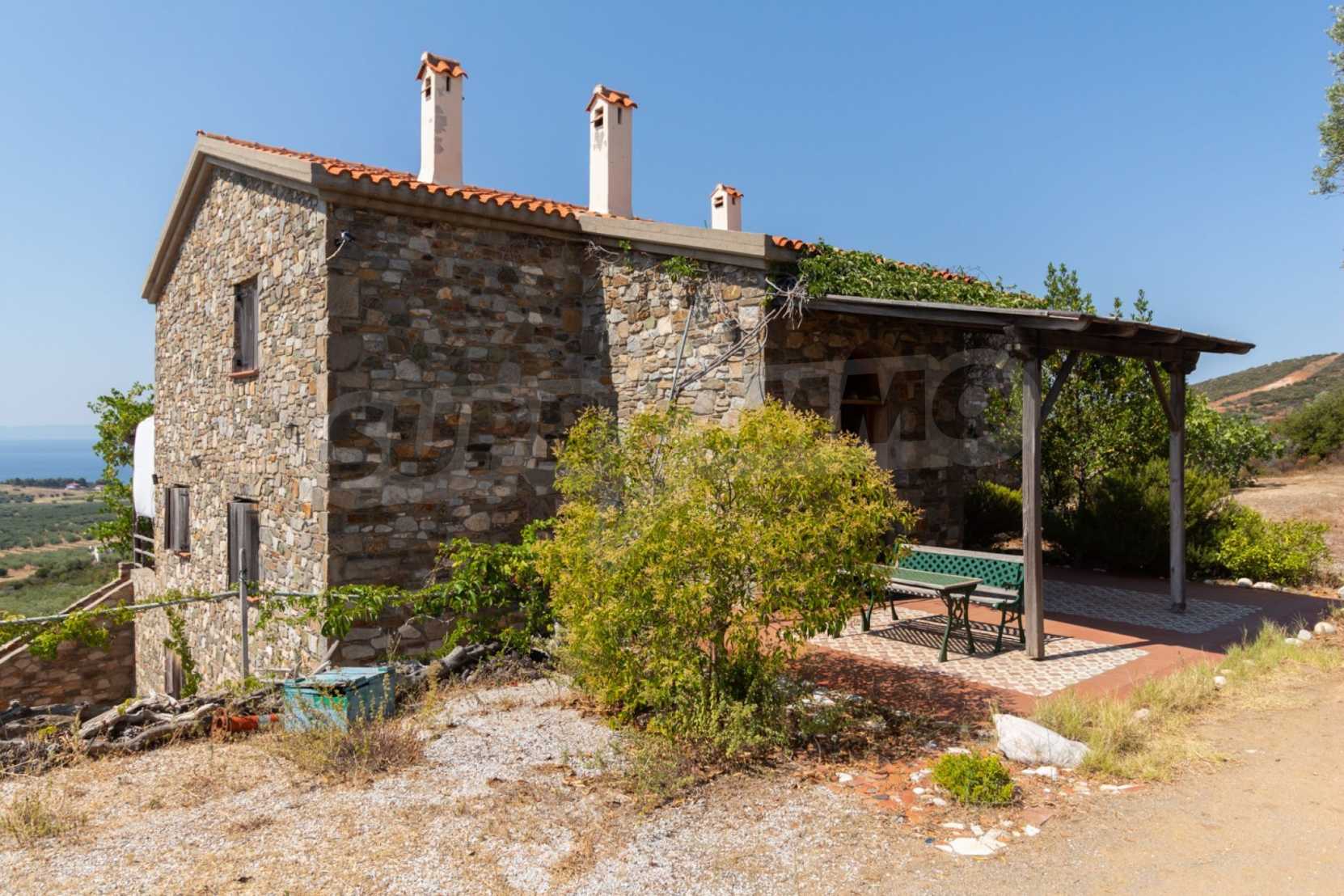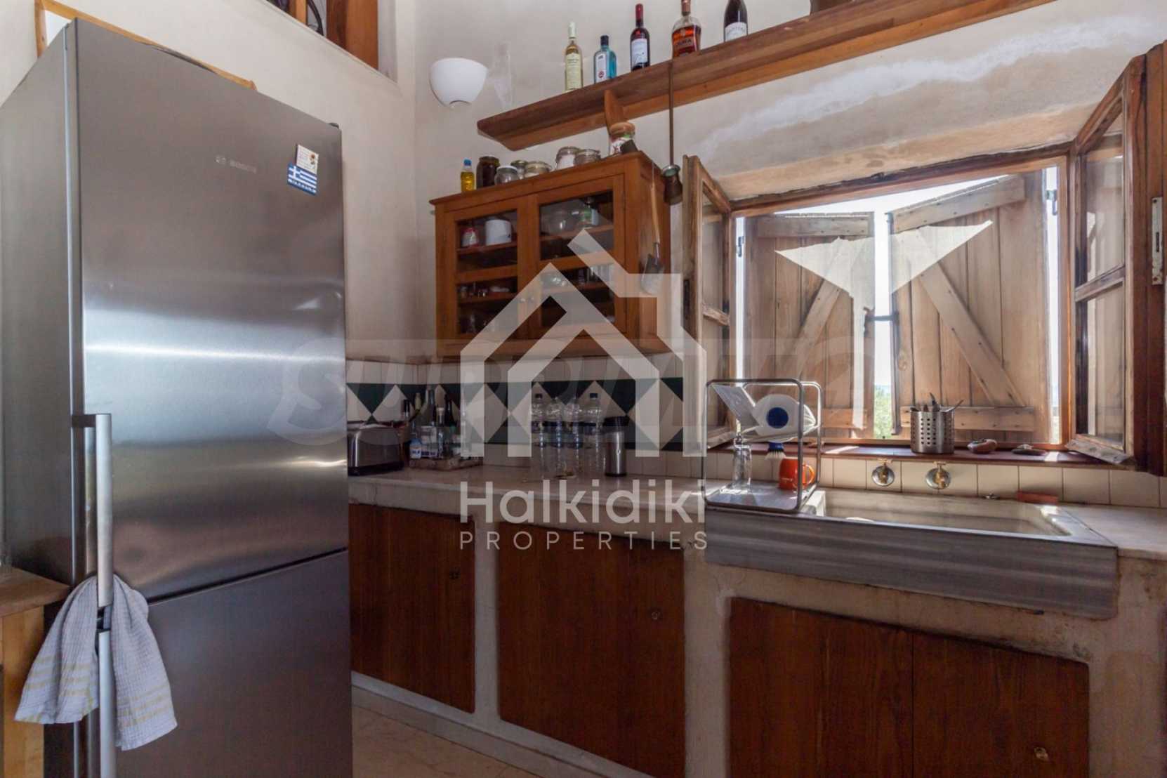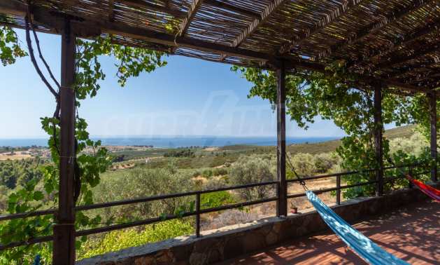 Stone-built detached house,302 m²,in Sithonia,Halkidiki with a western orientation and with unobstructed permanent sea view.The property is 2 km. away from the beach,3 km. away from the center of the village and is surrounded by 13,5 acres plot.The house is split in three levels, consisted of a living room connected with the kitchen and the dining room,two bedrooms and two bathrooms on the ground floor,two bedrooms and a bathroom on the first floor and a storage room with boiler room on the basement.The property,also,has big balconies and alarm system.The house is fully equipped and furnished.