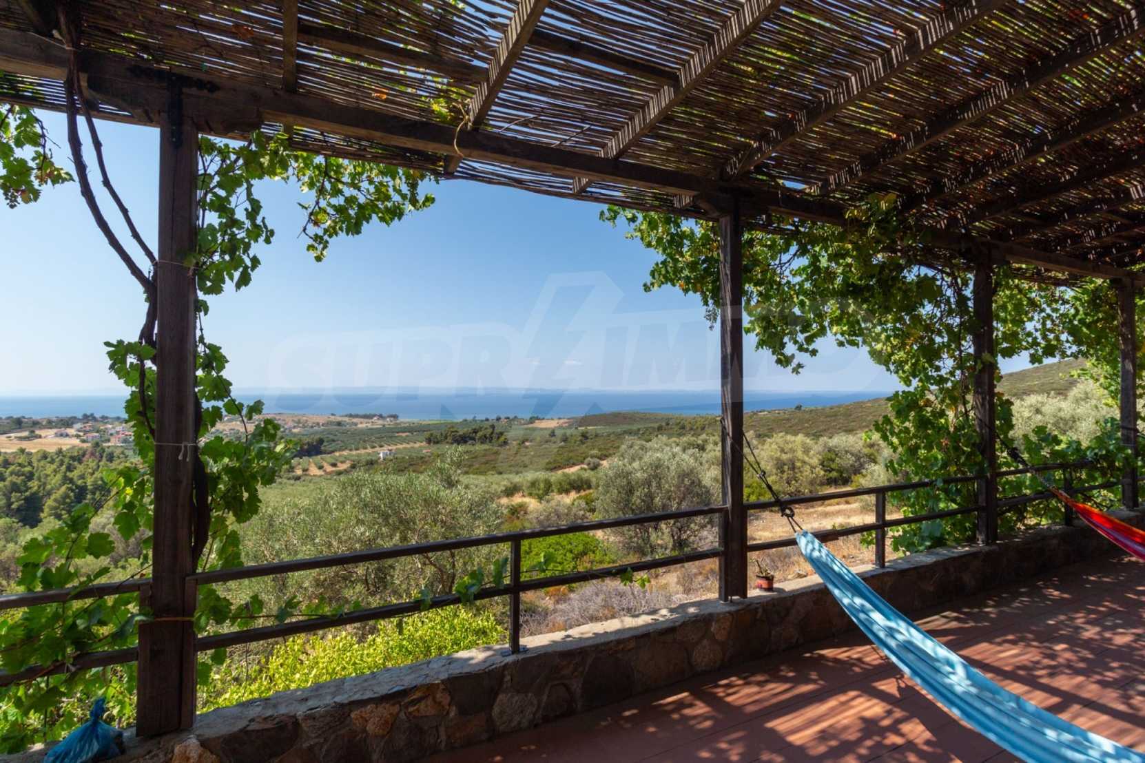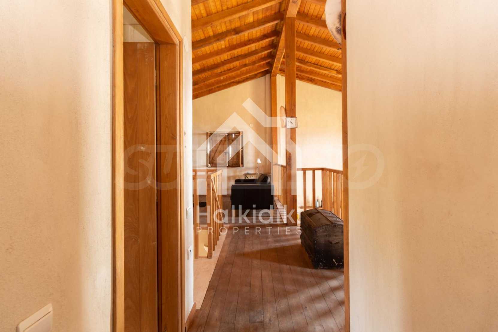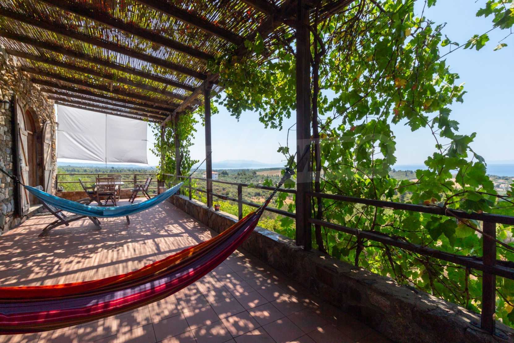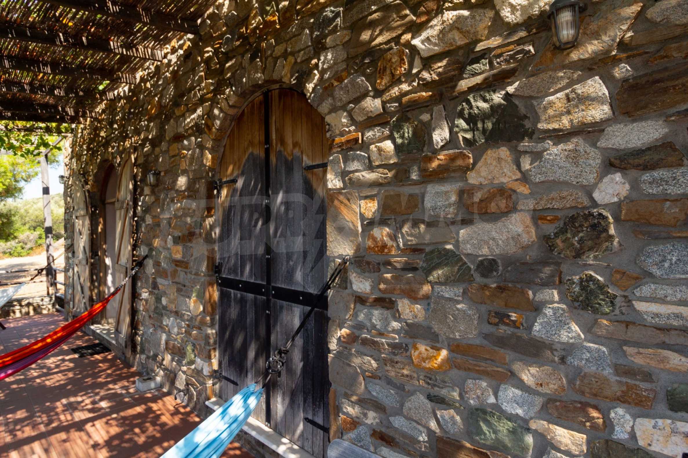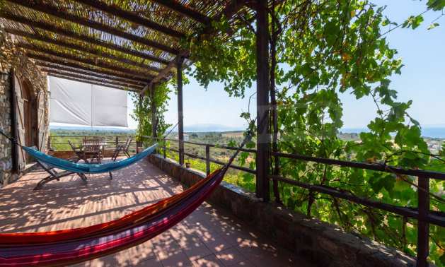 Stone-built detached house,302 m²,in Sithonia,Halkidiki with a western orientation and with unobstructed permanent sea view.The property is 2 km. away from the beach,3 km. away from the center of the village and is surrounded by 13,5 acres plot.The house is split in three levels, consisted of a living room connected with the kitchen and the dining room,two bedrooms and two bathrooms on the ground floor,two bedrooms and a bathroom on the first floor and a storage room with boiler room on the basement.The property,also,has big balconies and alarm system.The house is fully equipped and furnished.