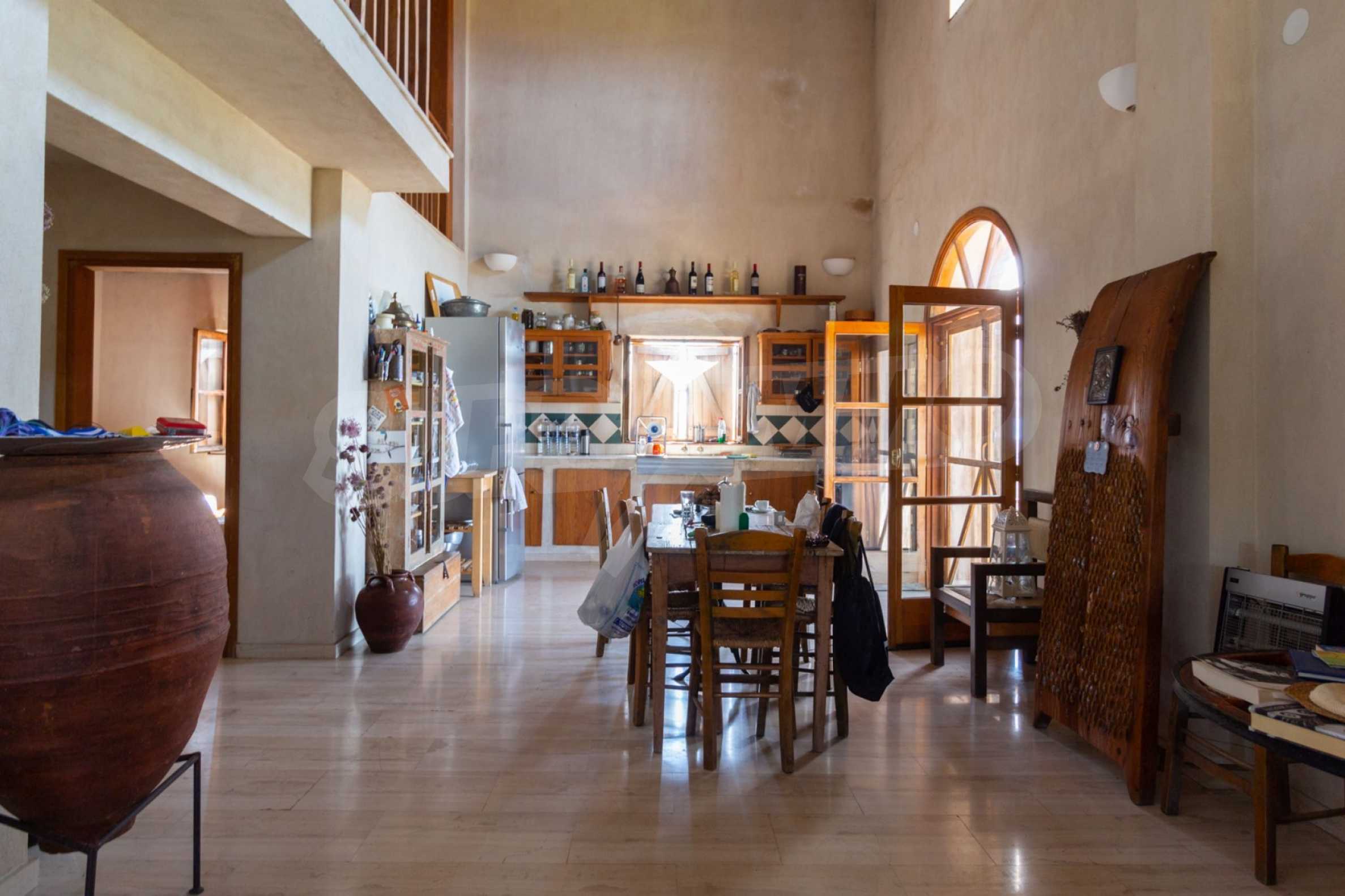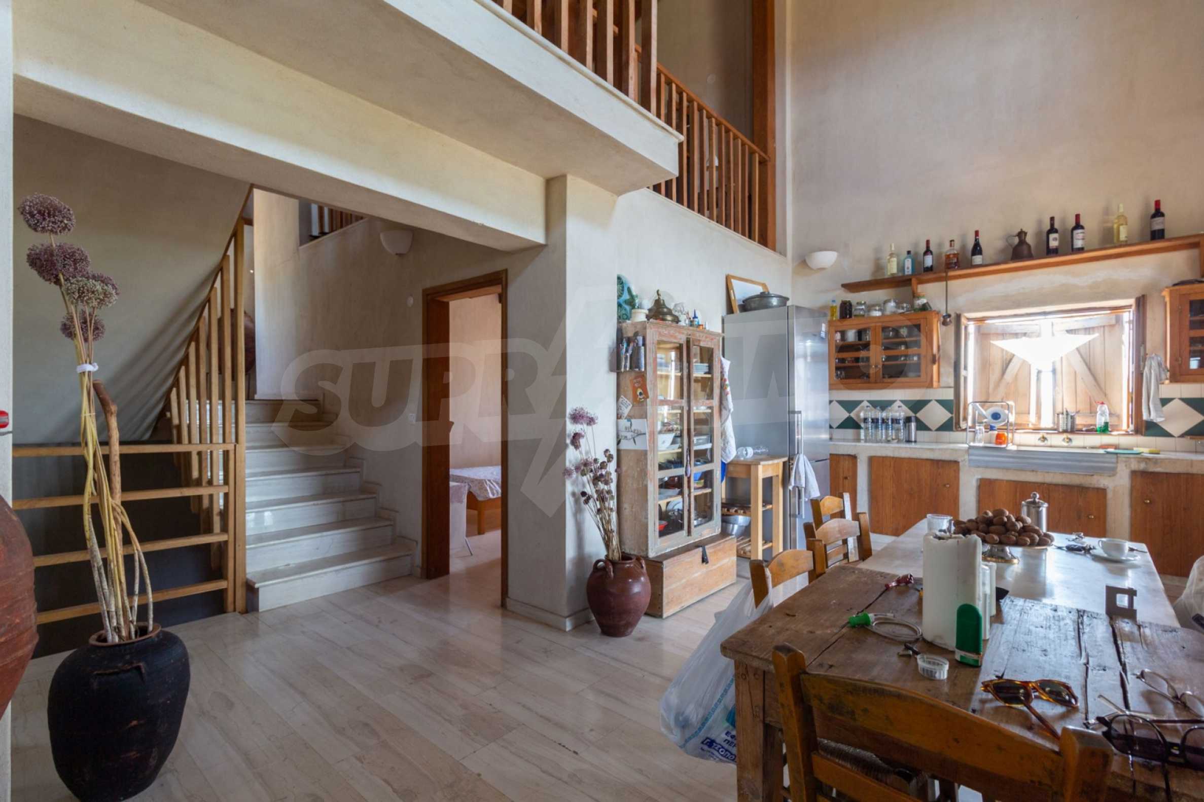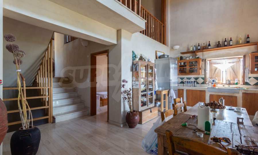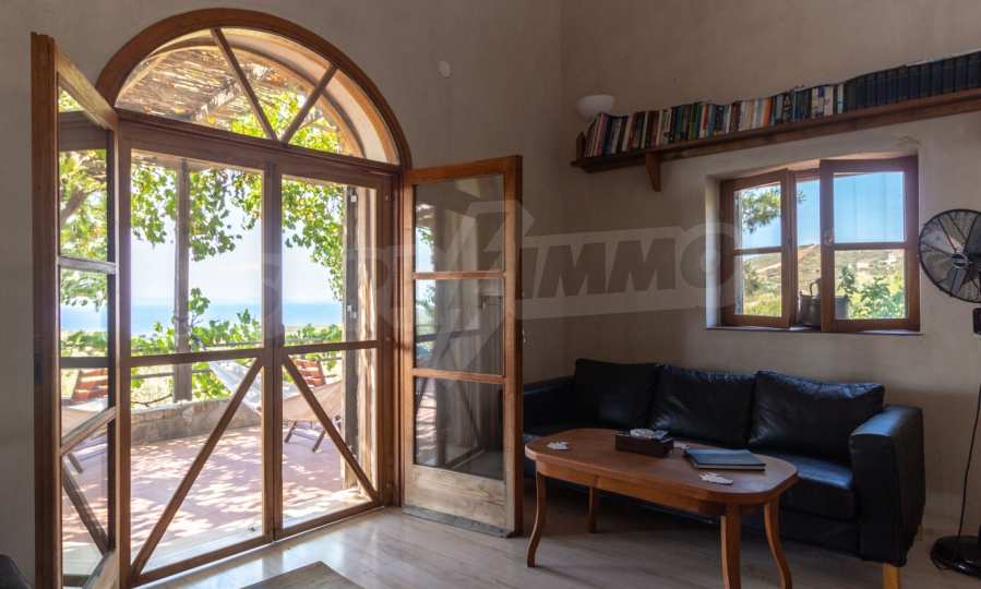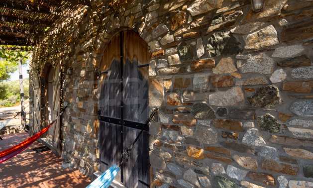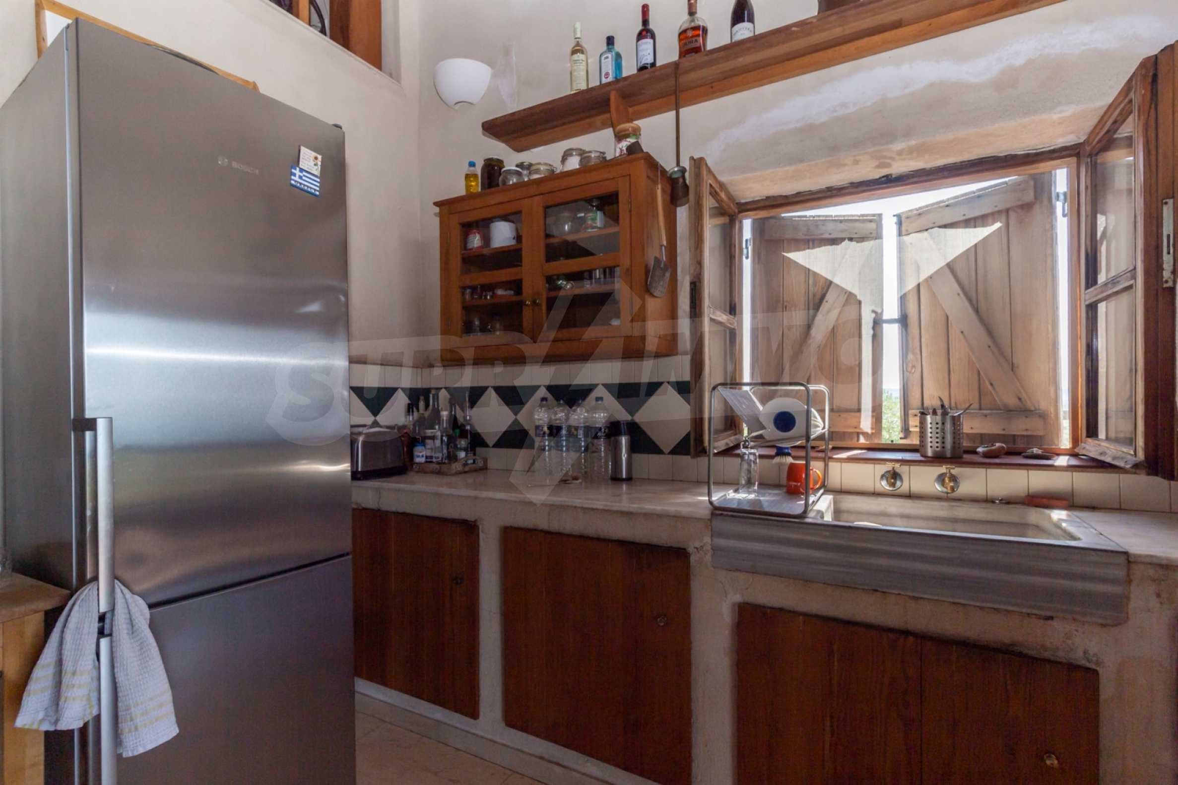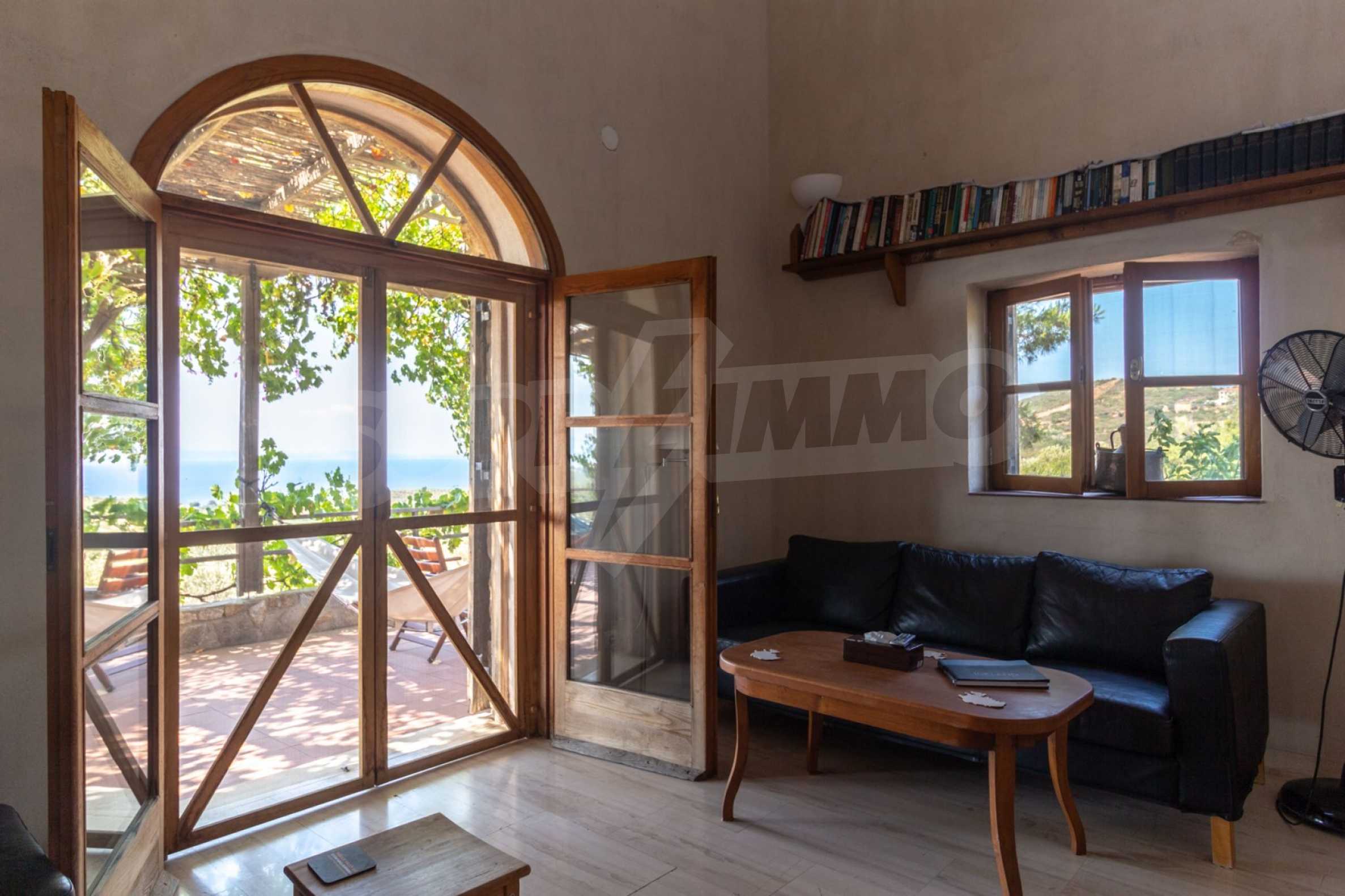 Stone-built detached house,302 m²,in Sithonia,Halkidiki with a western orientation and with unobstructed permanent sea view.The property is 2 km. away from the beach,3 km. away from the center of the village and is surrounded by 13,5 acres plot.The house is split in three levels, consisted of a living room connected with the kitchen and the dining room,two bedrooms and two bathrooms on the ground floor,two bedrooms and a bathroom on the first floor and a storage room with boiler room on the basement.The property,also,has big balconies and alarm system.The house is fully equipped and furnished.