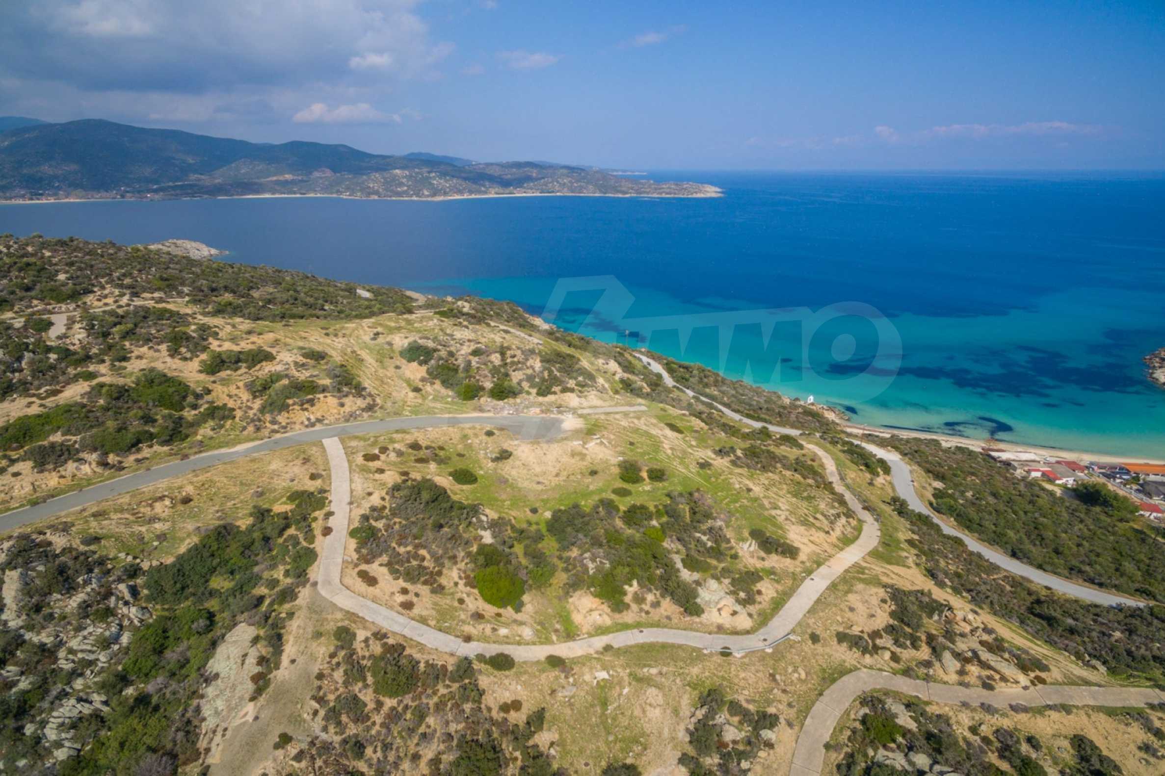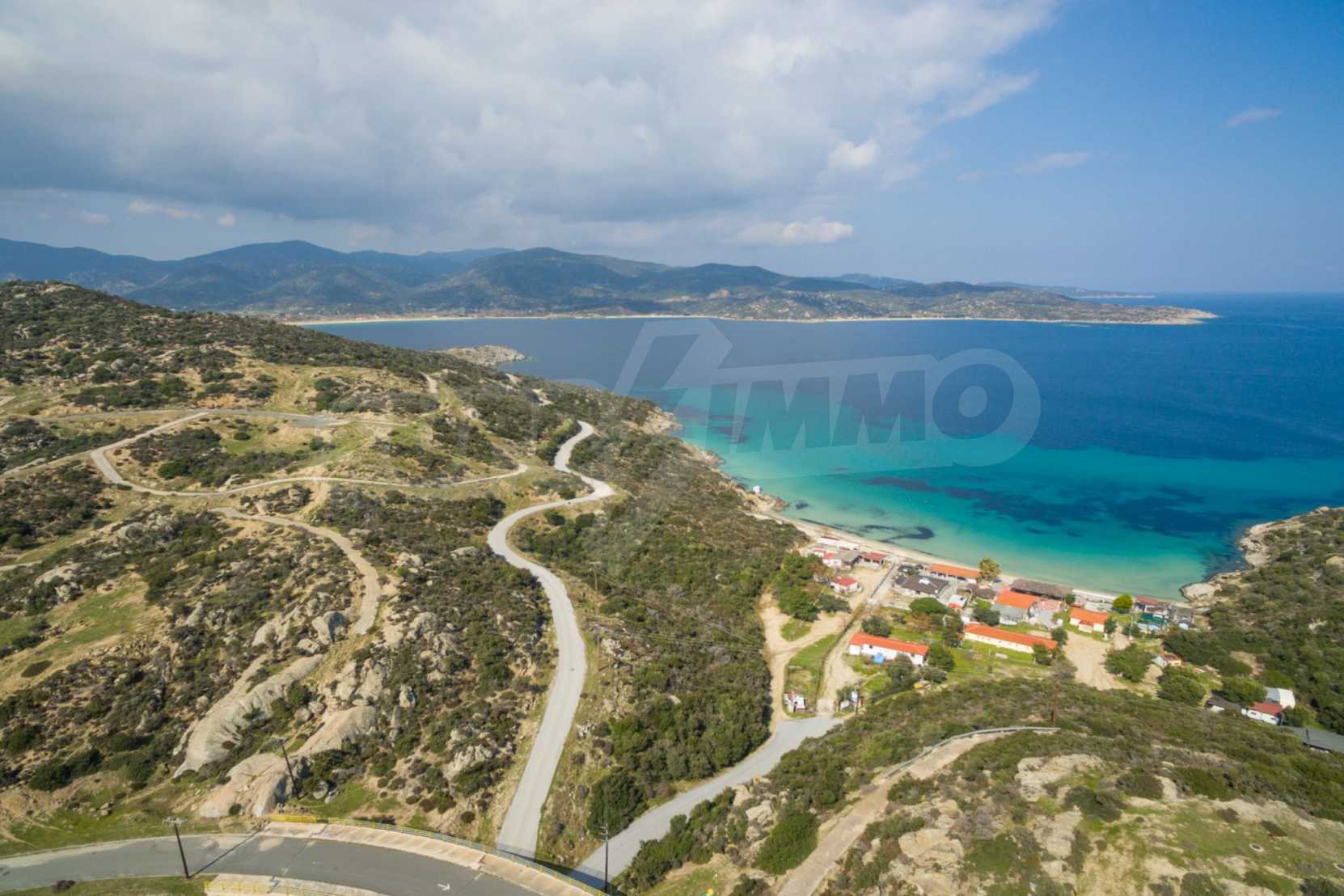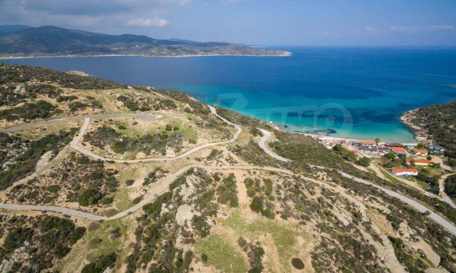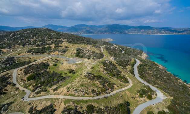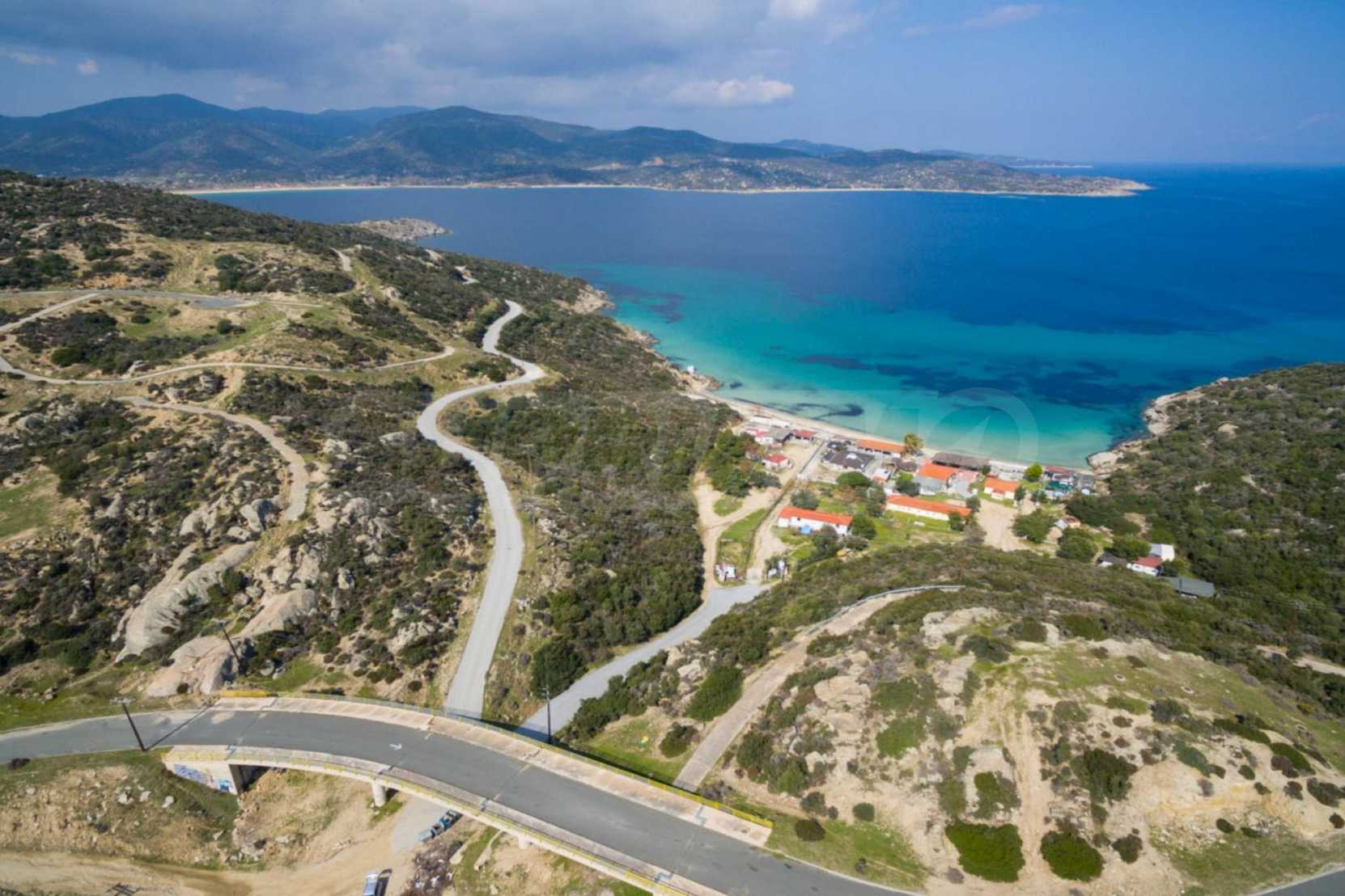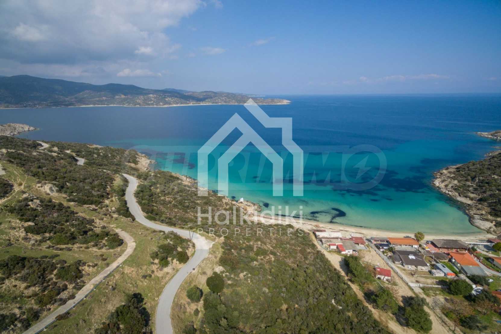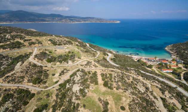 Corner,slanted plot,500 m², in Sithonia,Halkidiki with unobstructed permanent view and with an eastern orientation.The property is only 100m. away from a beautiful beach and faces the main road.The plot is complete and buildable(120m² can be built).The property is perfect for the construction of a villa.