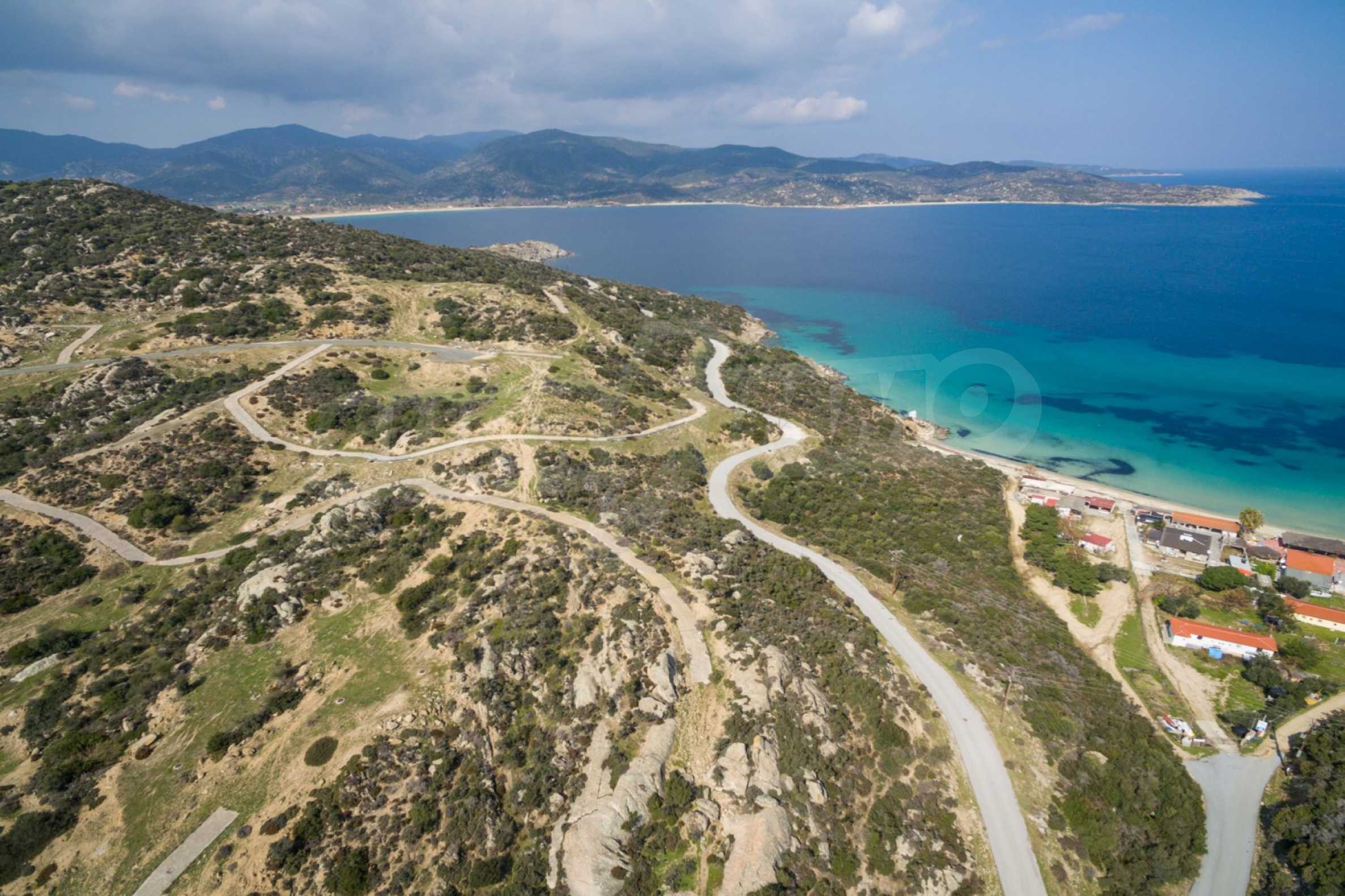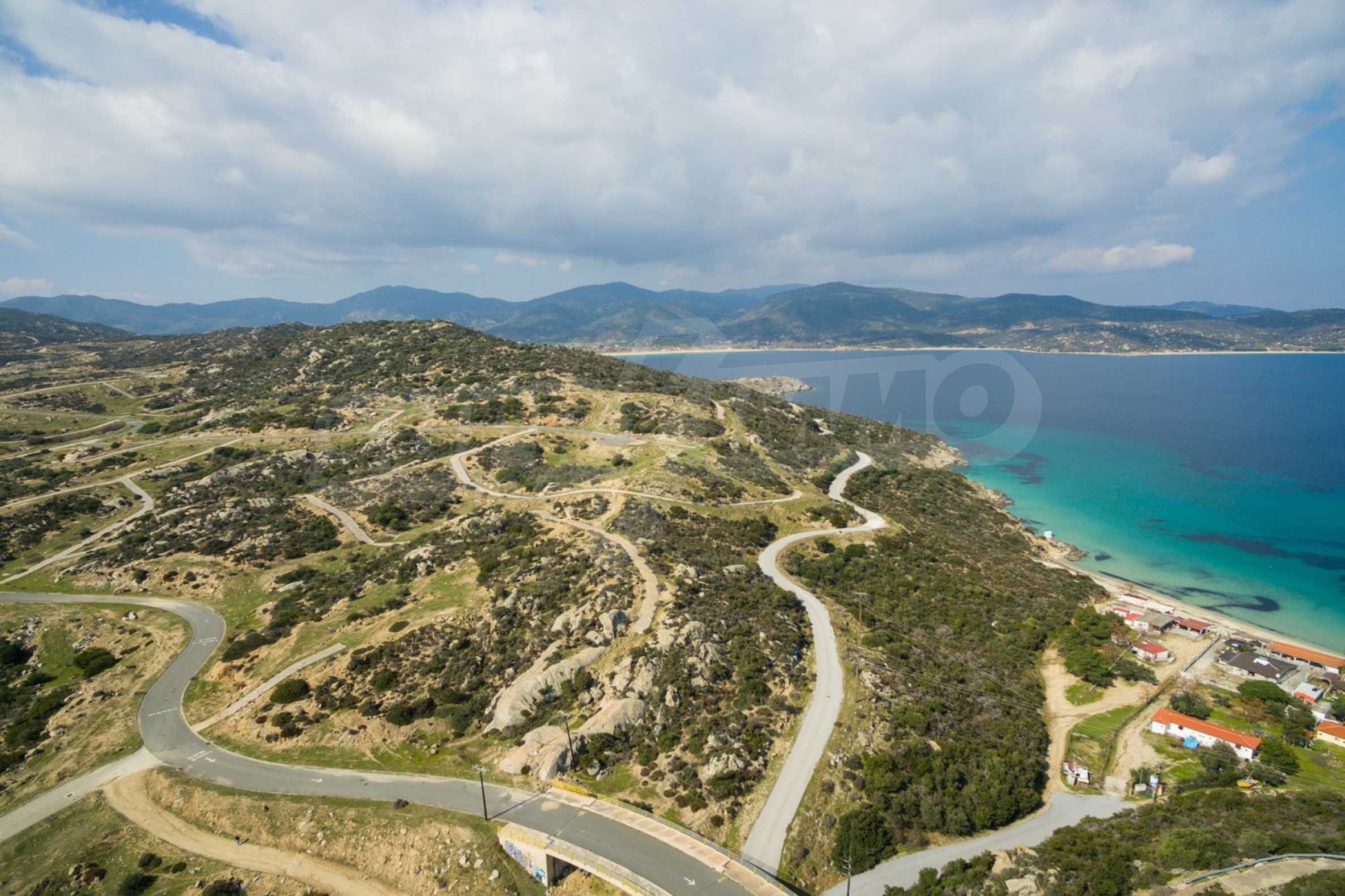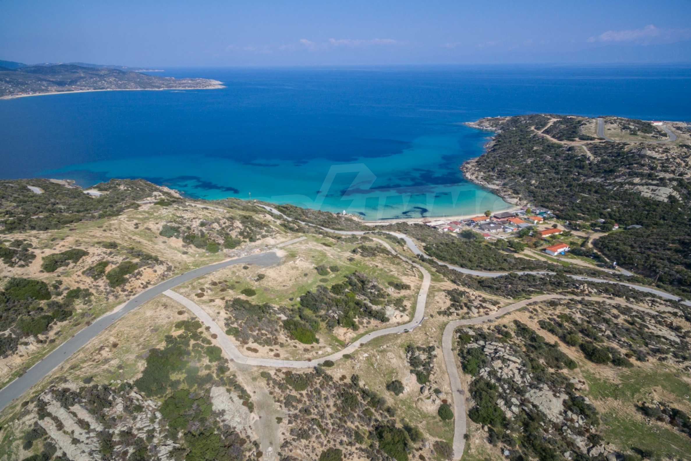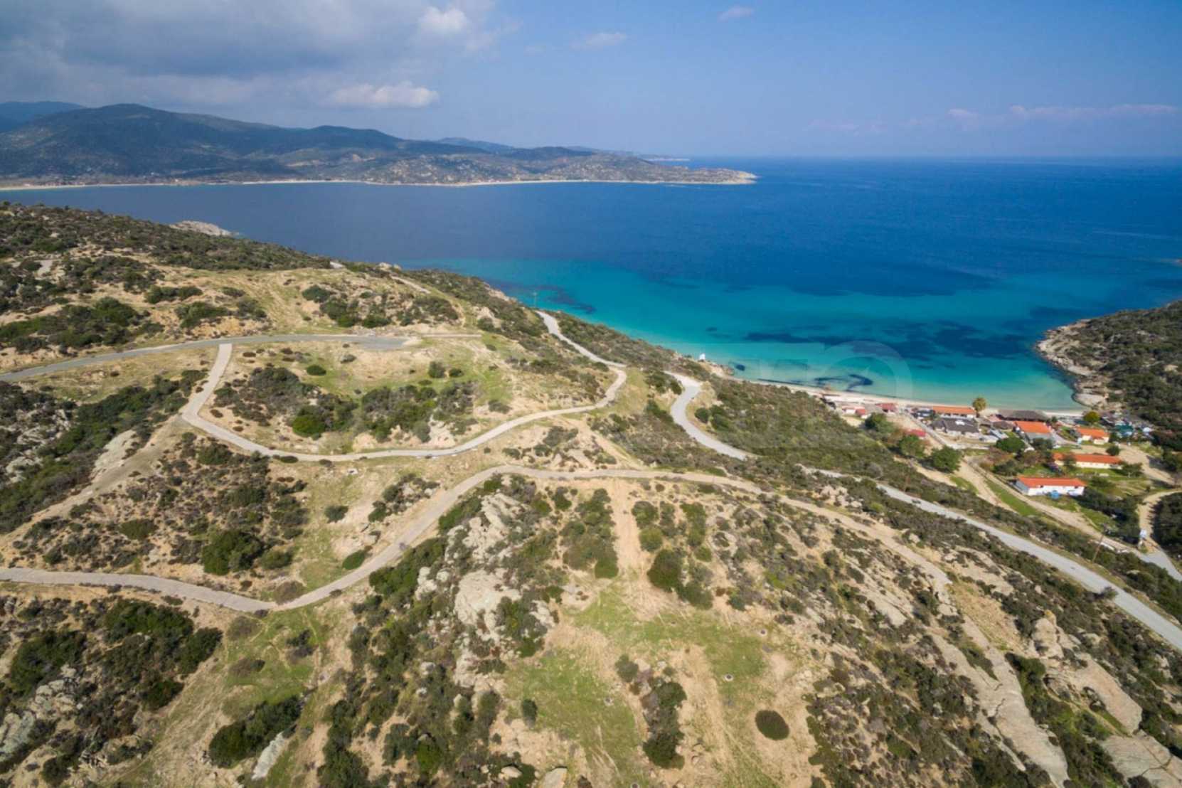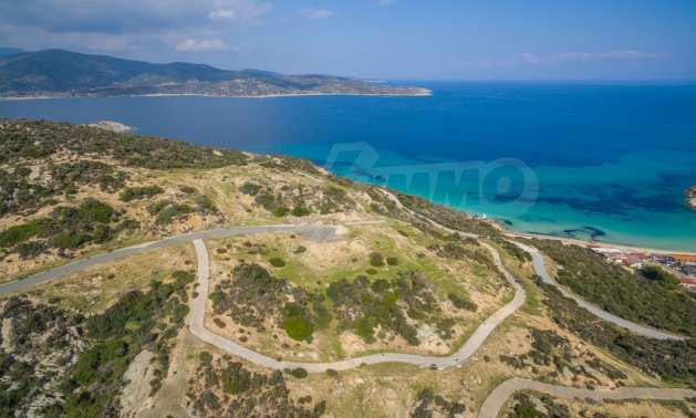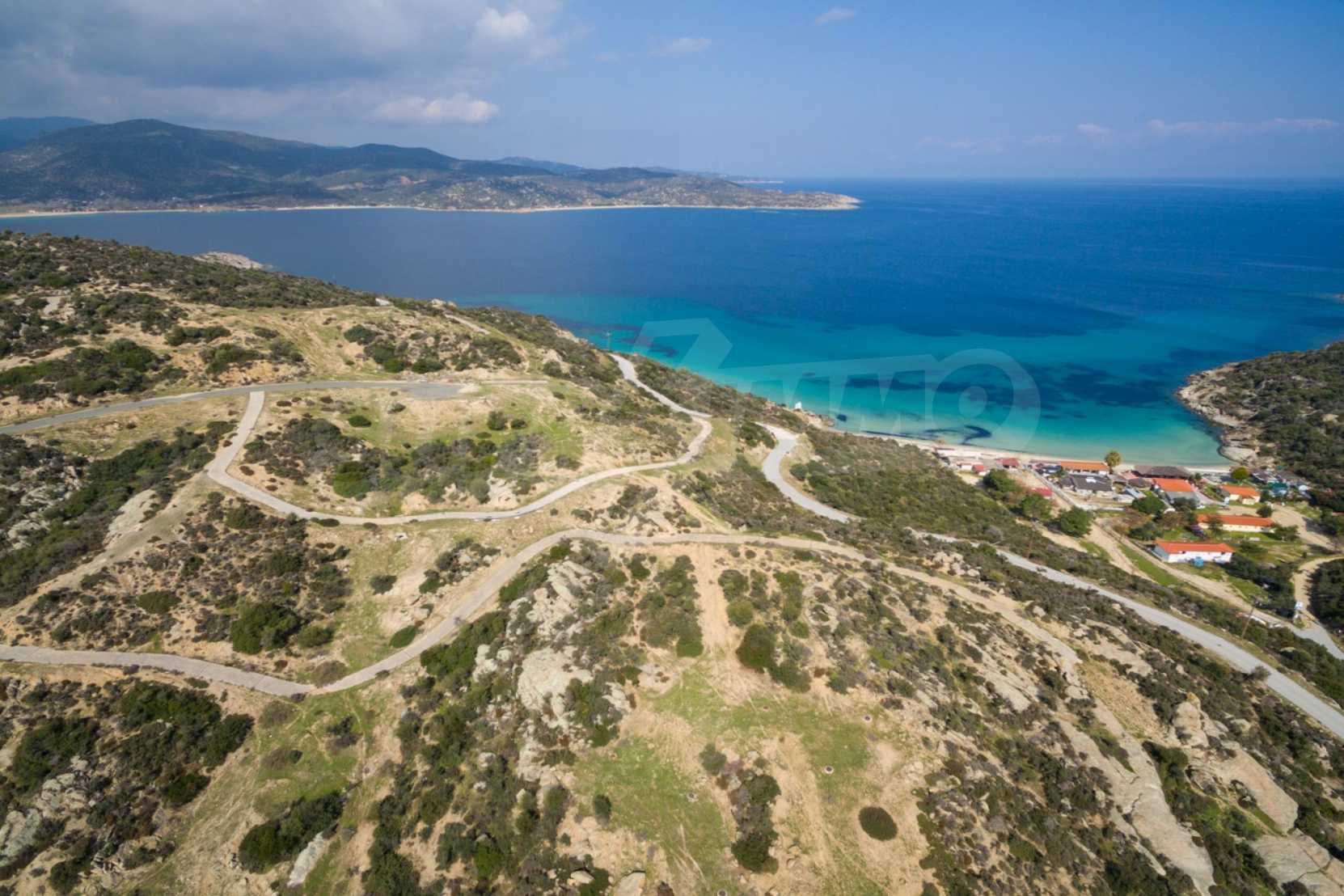 Corner,slanted plot,500 m², in Sithonia,Halkidiki with unobstructed permanent view and with an eastern orientation.The property is only 100m. away from a beautiful beach and faces the main road.The plot is complete and buildable(120m² can be built).The property is perfect for the construction of a villa.