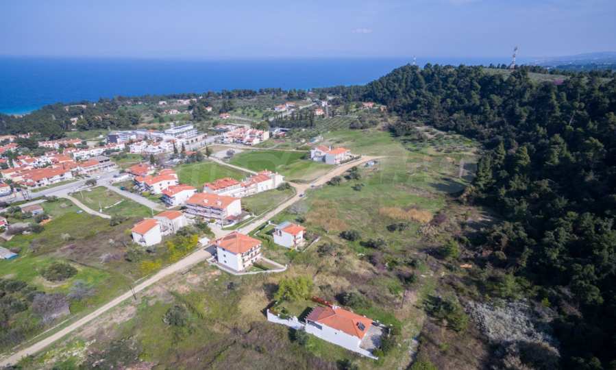 Slanted plot,354 m², in Kassandra,Halkidiki with unobstructed permanent view and with an eastern orientation.The property is 600 m. away from center of the village.The fenced plot is complete,buildable and its building factor is 0.6(212 m² can be built).