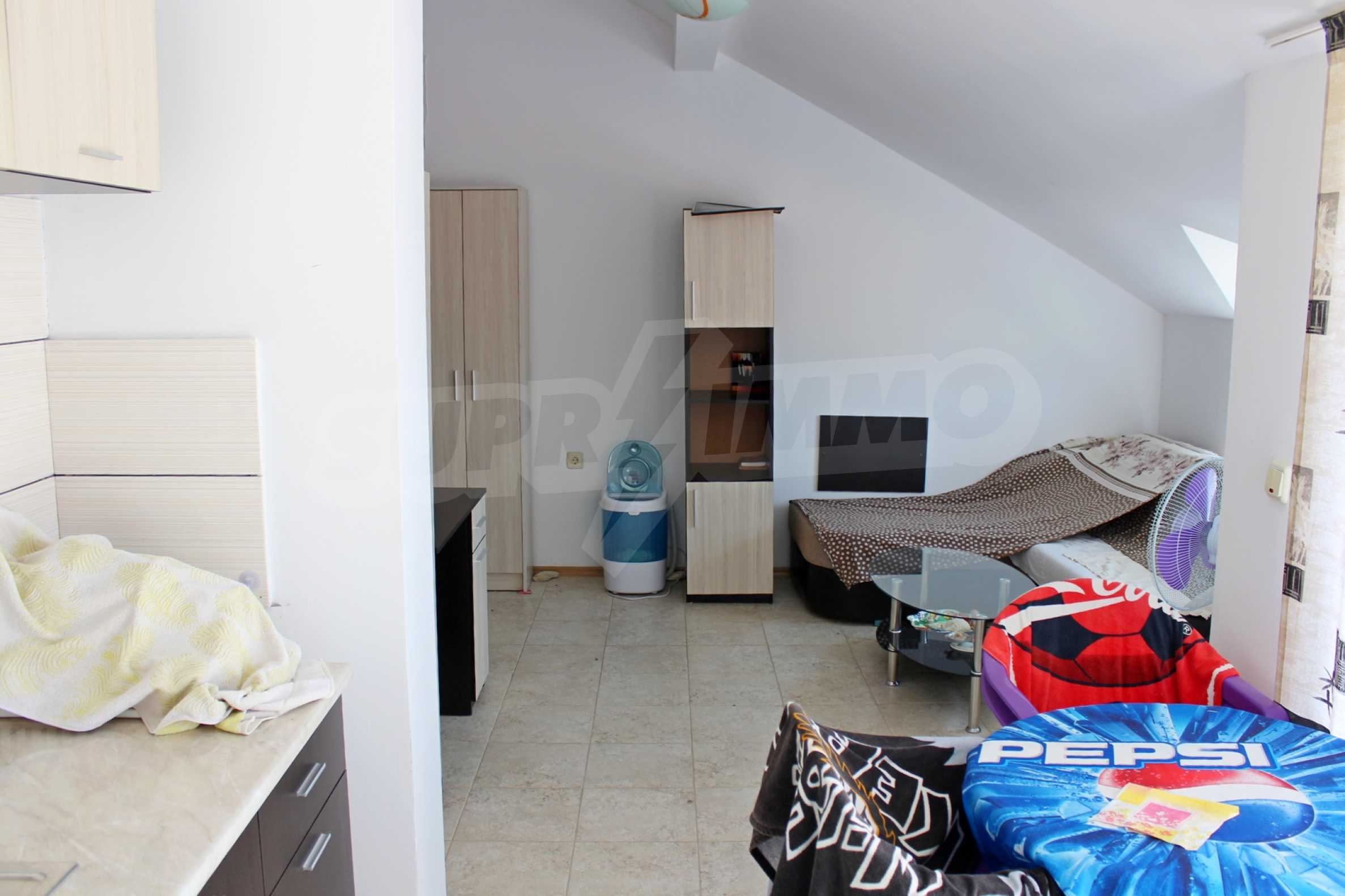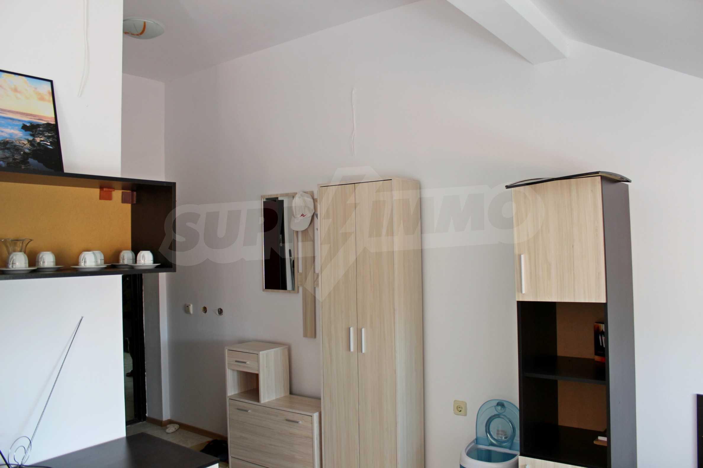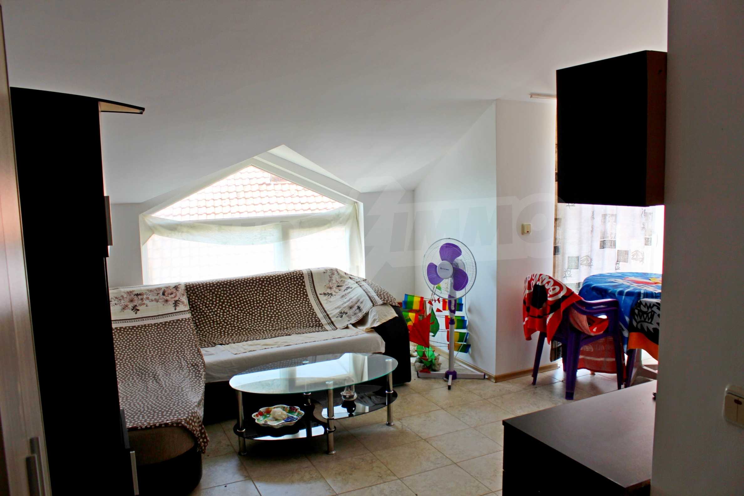 It has a fully equipped kitchen and bathroom, ceramic flooring and laminated parquet in the bedroom, interior doors and latex painted walls. The living room is designed in such a way that there are two zones - kitchen and relaxation area. The ceilings of the dwelling follow the slope of the building, which gives coziness and charm to the premises. Although it is middle-class furniture and appliances, the home has everything you need and can practically serve the future owner.