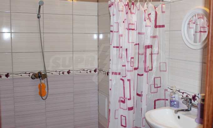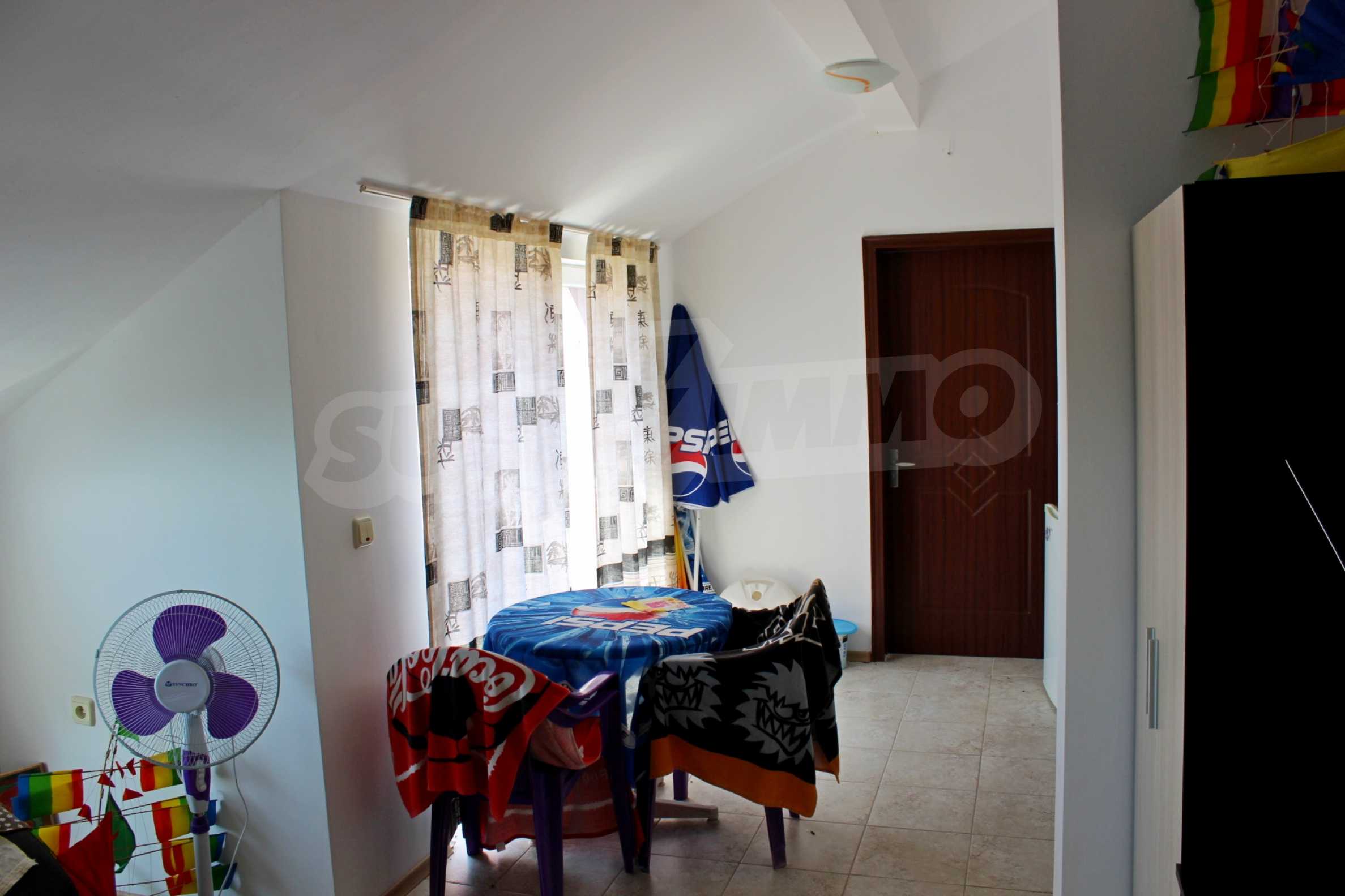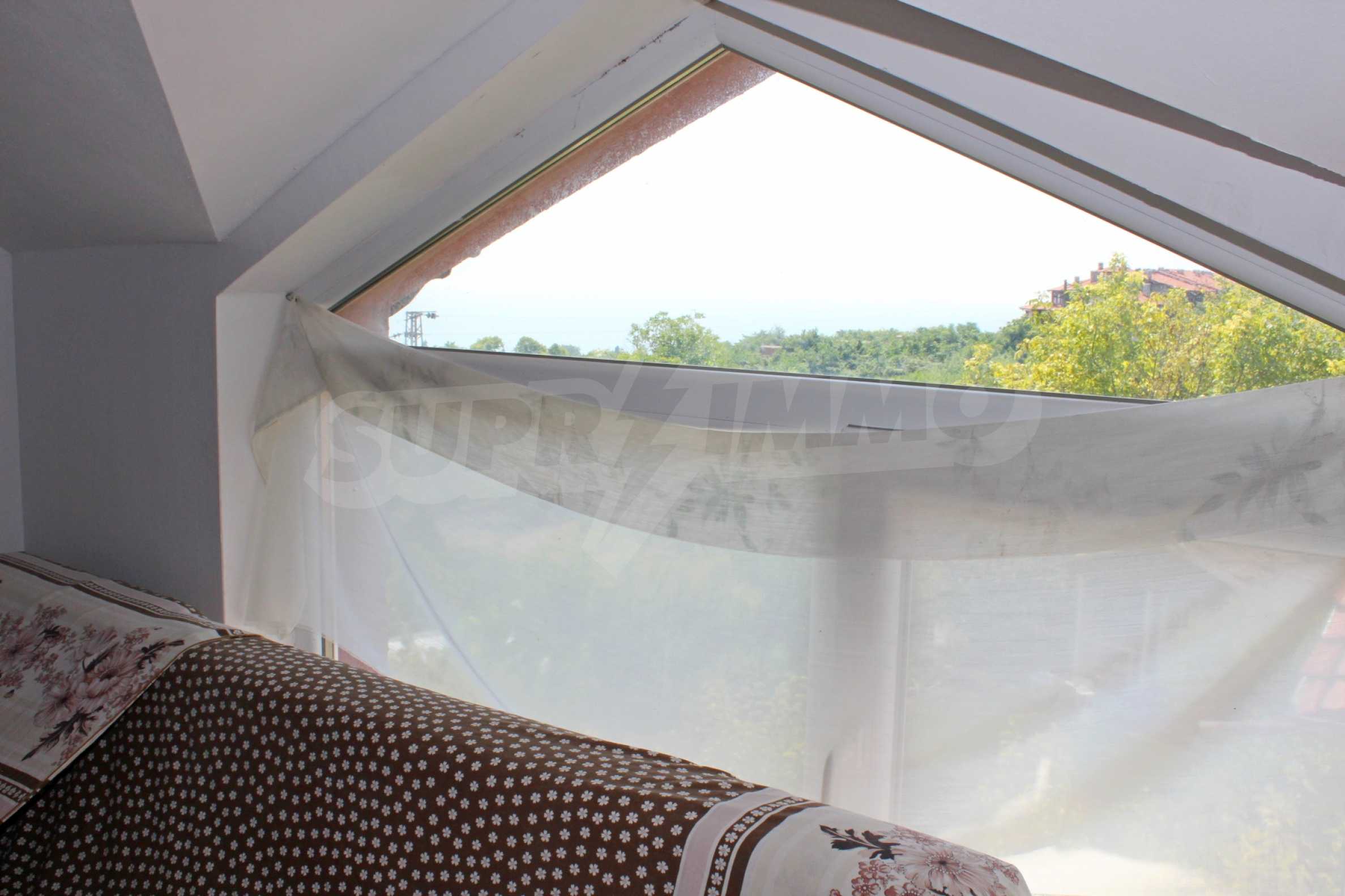 It has a fully equipped kitchen and bathroom, ceramic flooring and laminated parquet in the bedroom, interior doors and latex painted walls. The living room is designed in such a way that there are two zones - kitchen and relaxation area. The ceilings of the dwelling follow the slope of the building, which gives coziness and charm to the premises. Although it is middle-class furniture and appliances, the home has everything you need and can practically serve the future owner.