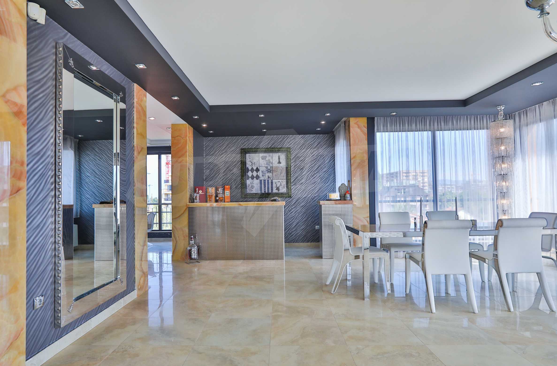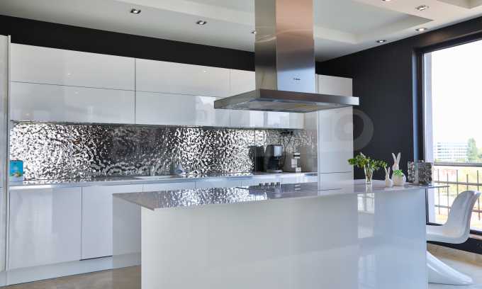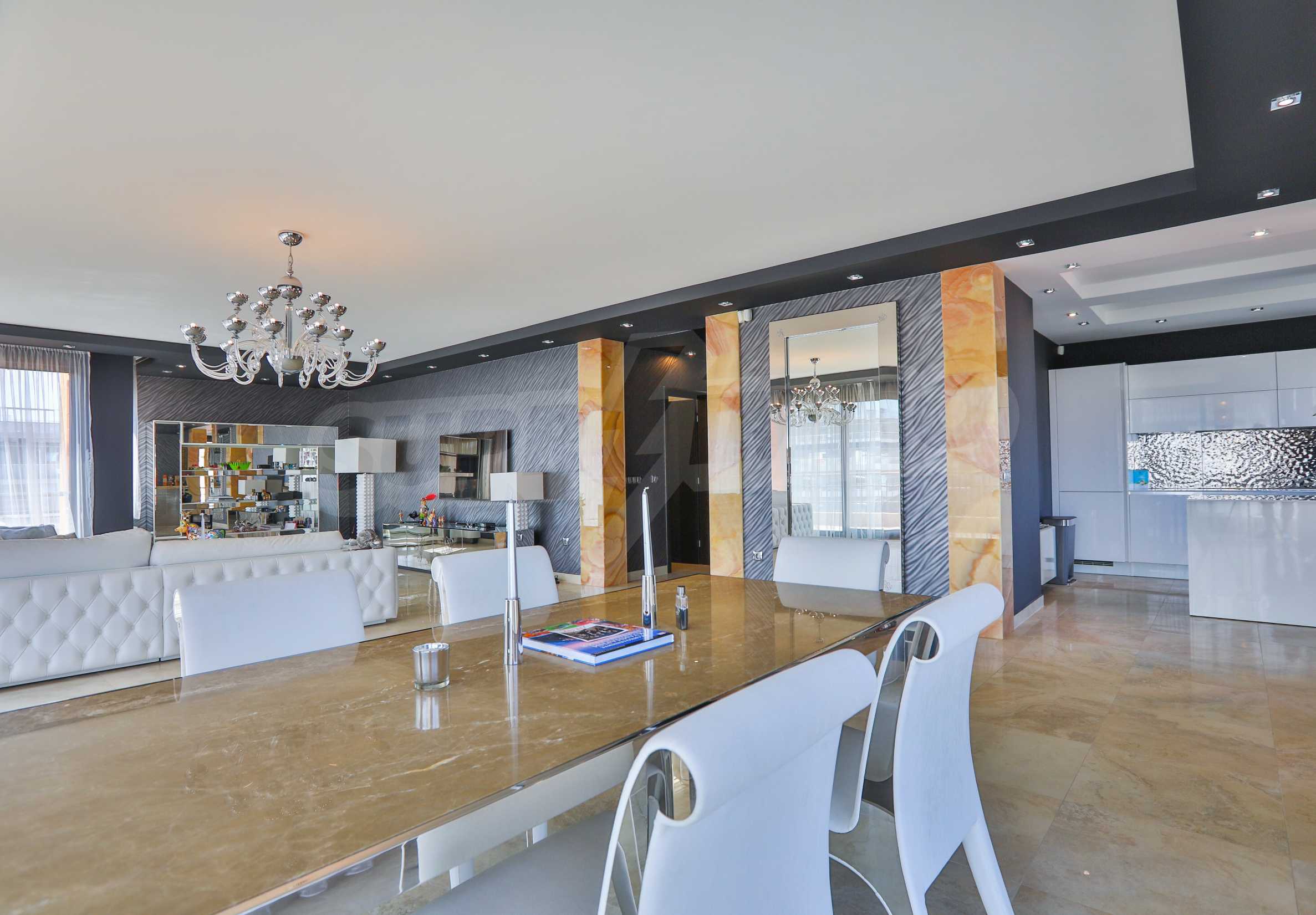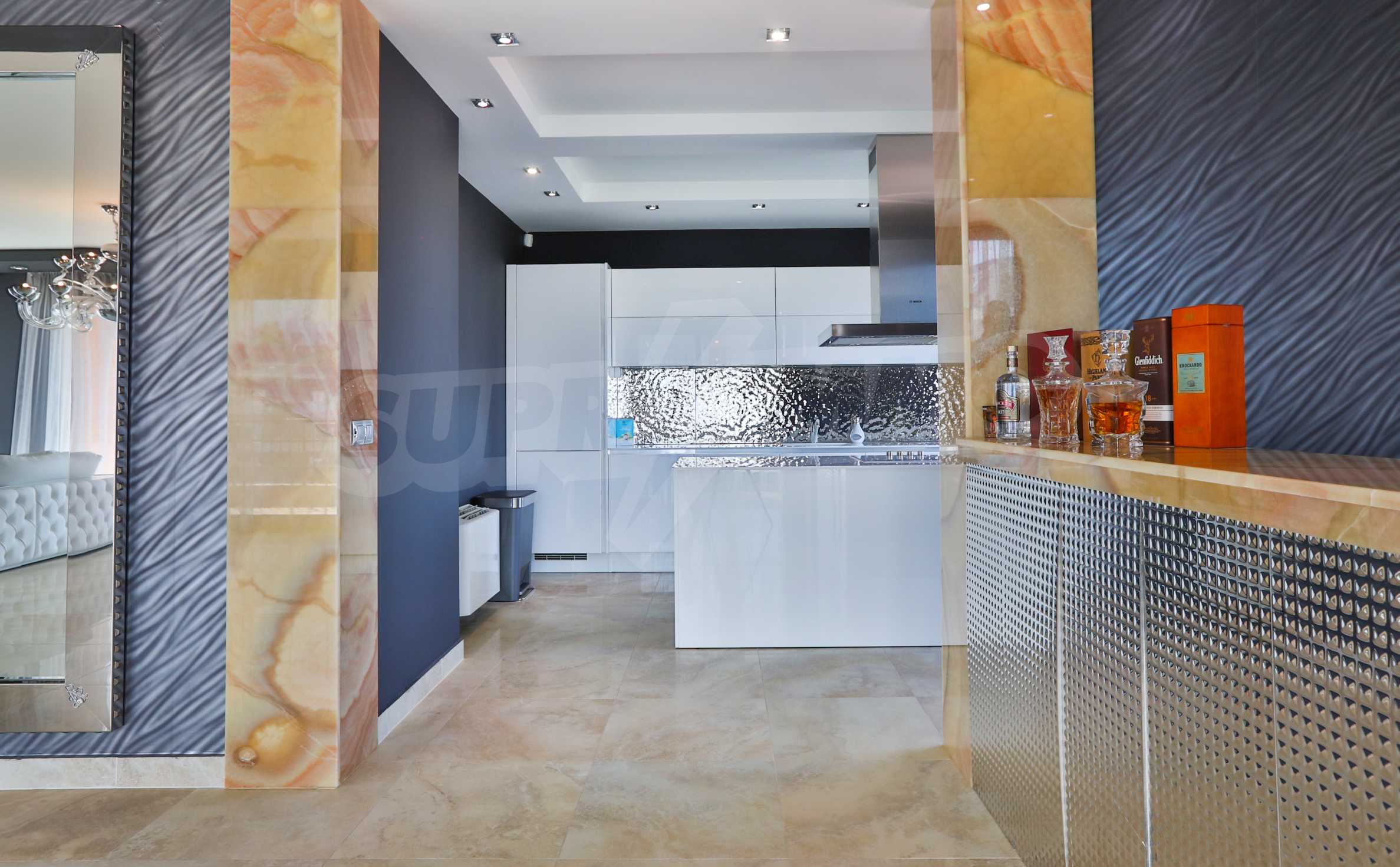 - Living room: The living room has an area of 90 m2., fully glazed on three sides and furnished with elite Italian brands in the field of design. In the dining room, the table with a marble top makes a special impression, the color of which is repeated in the granite tiles on the floor. The polished surface of the flooring creates a sense of luxury, complemented by the crystal light fixtures, the huge mirror on one of the walls and the onyx paneling that frames the bar, the entry to the kitchen and the hall. The entrance to the kitchen and the bar are clad in onyx. The large mirror from IPE CAVALLI - VISIONNAIRE doubles the lightness and space in this part of the apartment. The corner sofa upholstered in white leather forms a comfortable corner for conversations and rest in the living room. All the furniture and the two lamps in the sitting area are by IPE CAVALLI - VISIONNAIRE. Low stainless steel TV cabinet with the VISIONNAIRE logo and TETI lamp in white ceramic from the same brand. The wallpapers from ALEXANDRA COLLECTION add dynamism to the interior. All furnitures are by VISIONNAIRE.