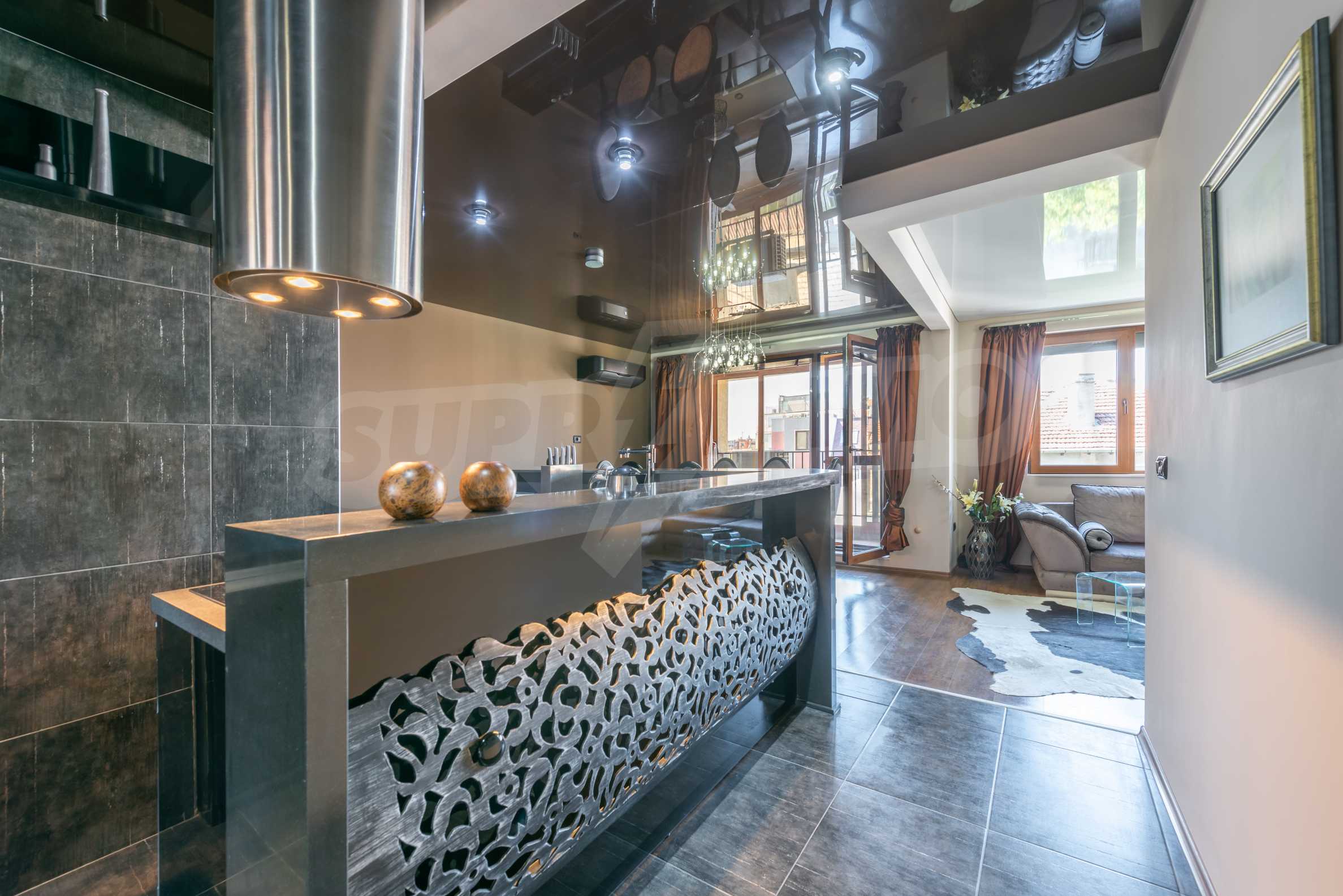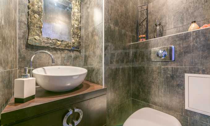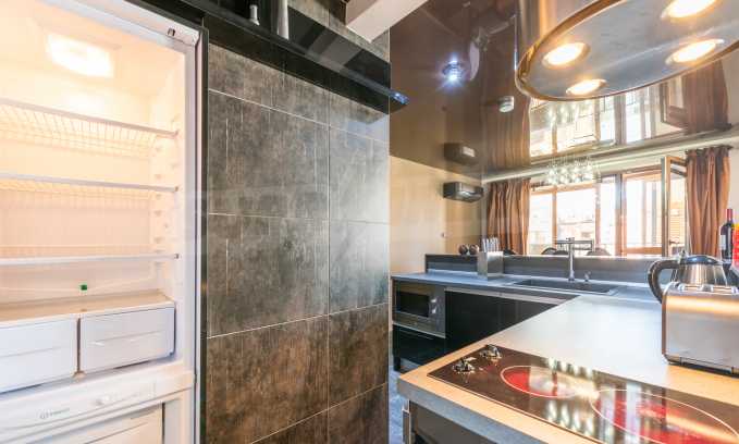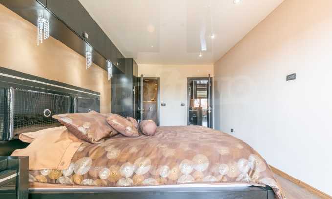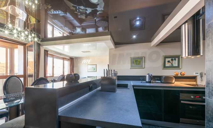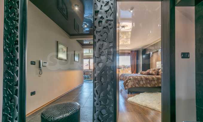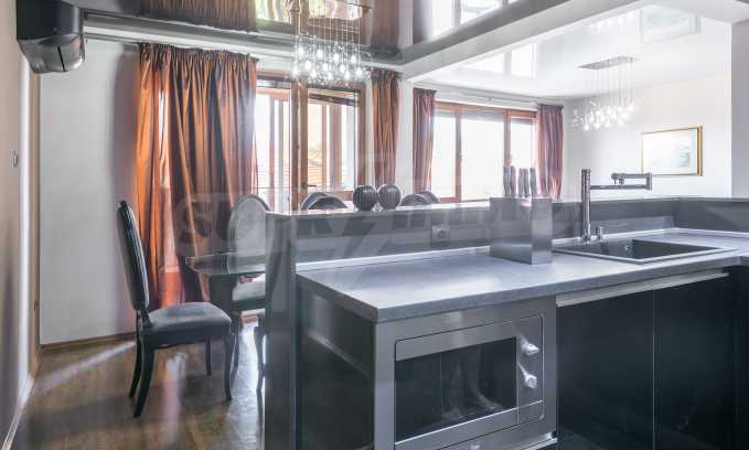 The apartment is stylishly and designerly furnished with massive custom furniture, with attention to every detail and non-standard interior solutions, creating at the same time a sense of exotic, cozy and balanced luxury. The color scheme is cleverly selected with a sense of harmony and refined taste.