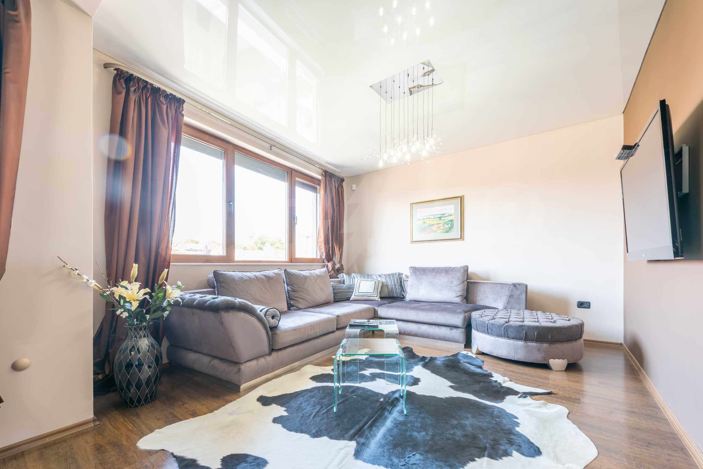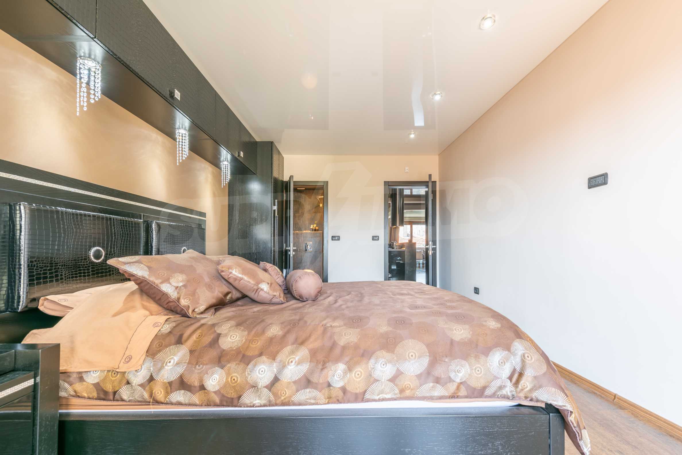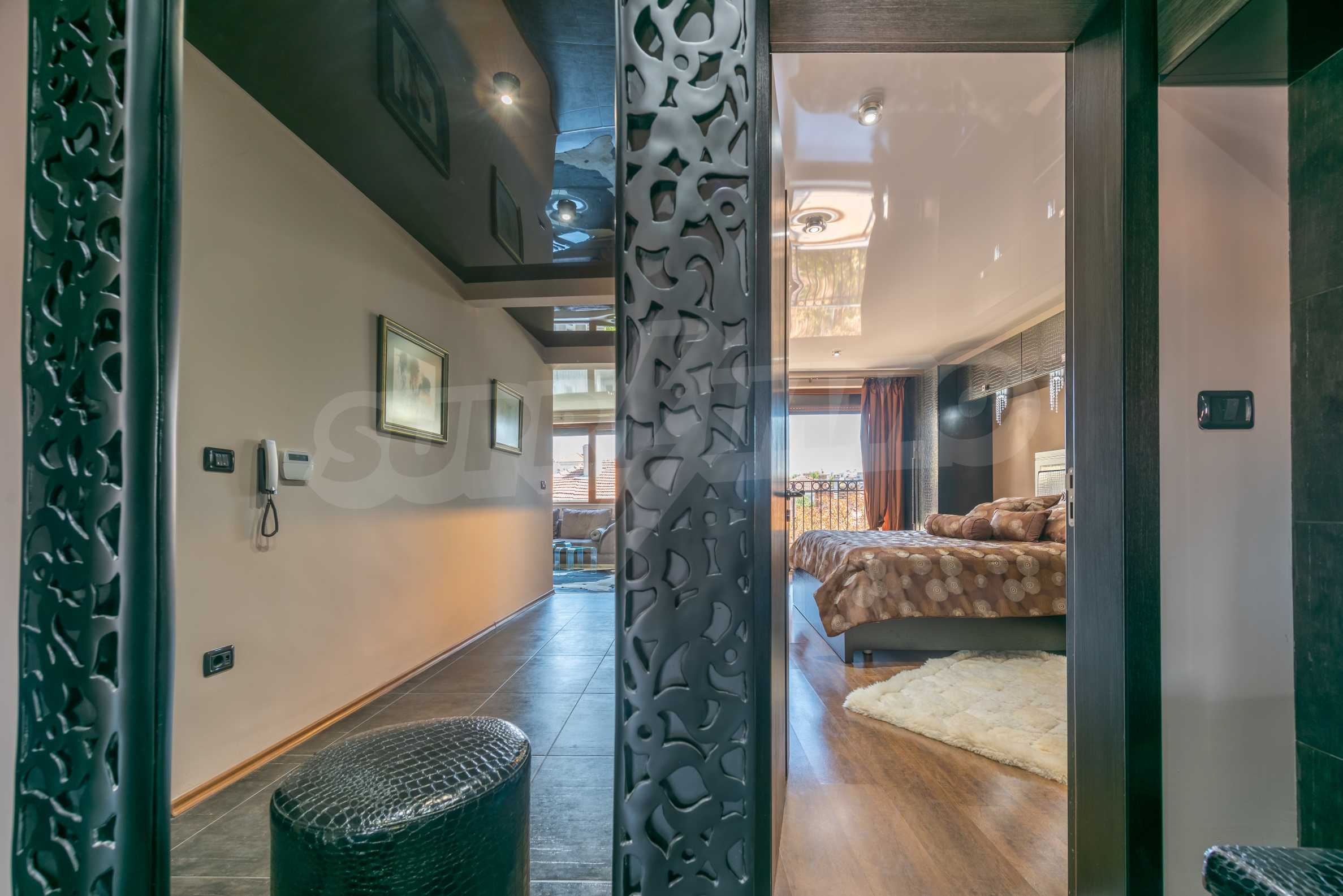 The apartment is stylishly and designerly furnished with massive custom furniture, with attention to every detail and non-standard interior solutions, creating at the same time a sense of exotic, cozy and balanced luxury. The color scheme is cleverly selected with a sense of harmony and refined taste.