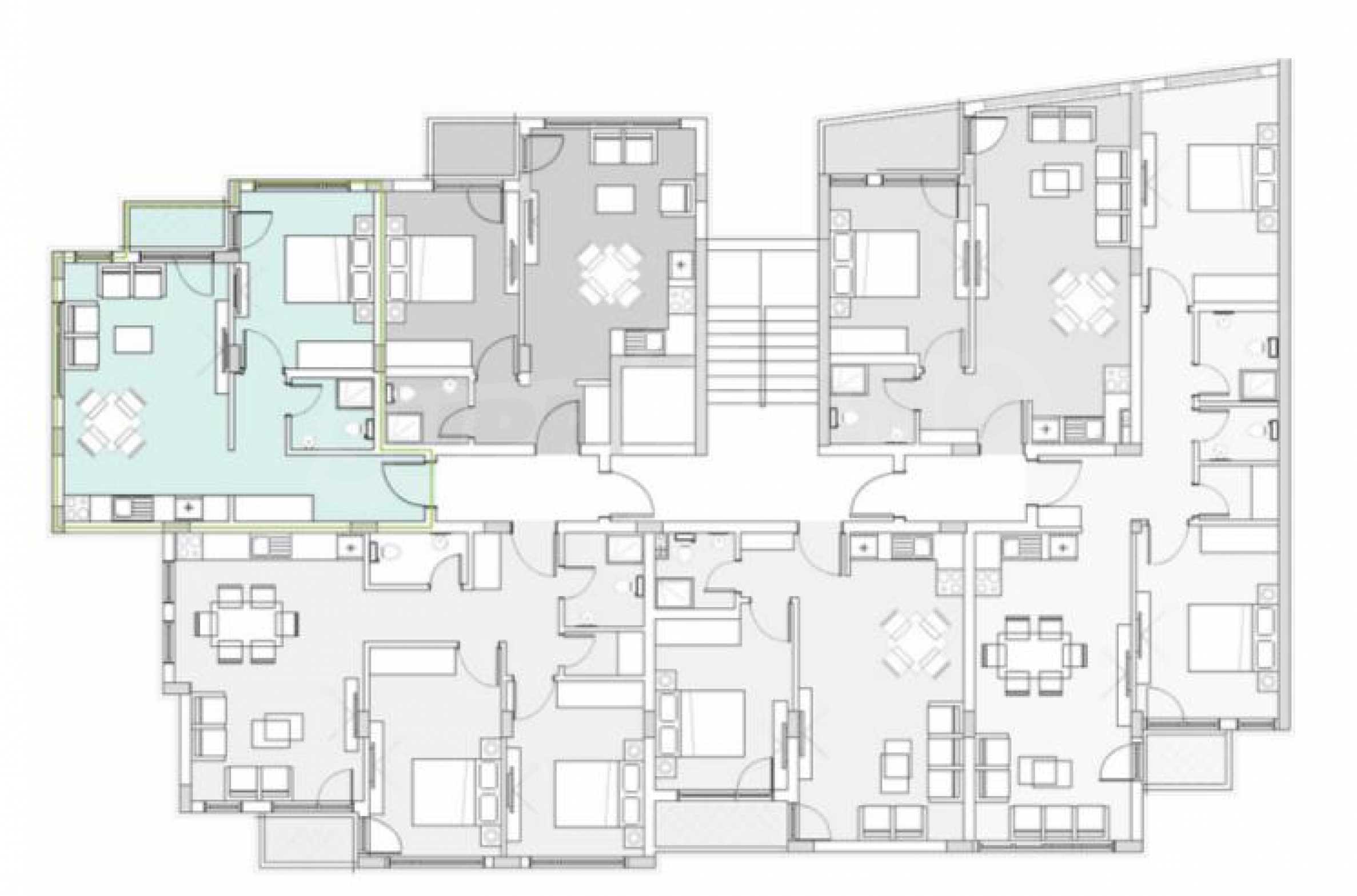 The design of the building is modern and clean, reflecting the functionality and convenience of the apartments. The apartment is located on the second floor of Building B facing west / north. The project is a continuation of an already built building and is located in two sections with a total of 46 apartments. The interior space is designed as a landscaped patio with alleys. The complex also has above ground and underground garages.