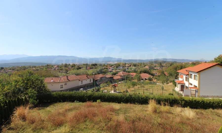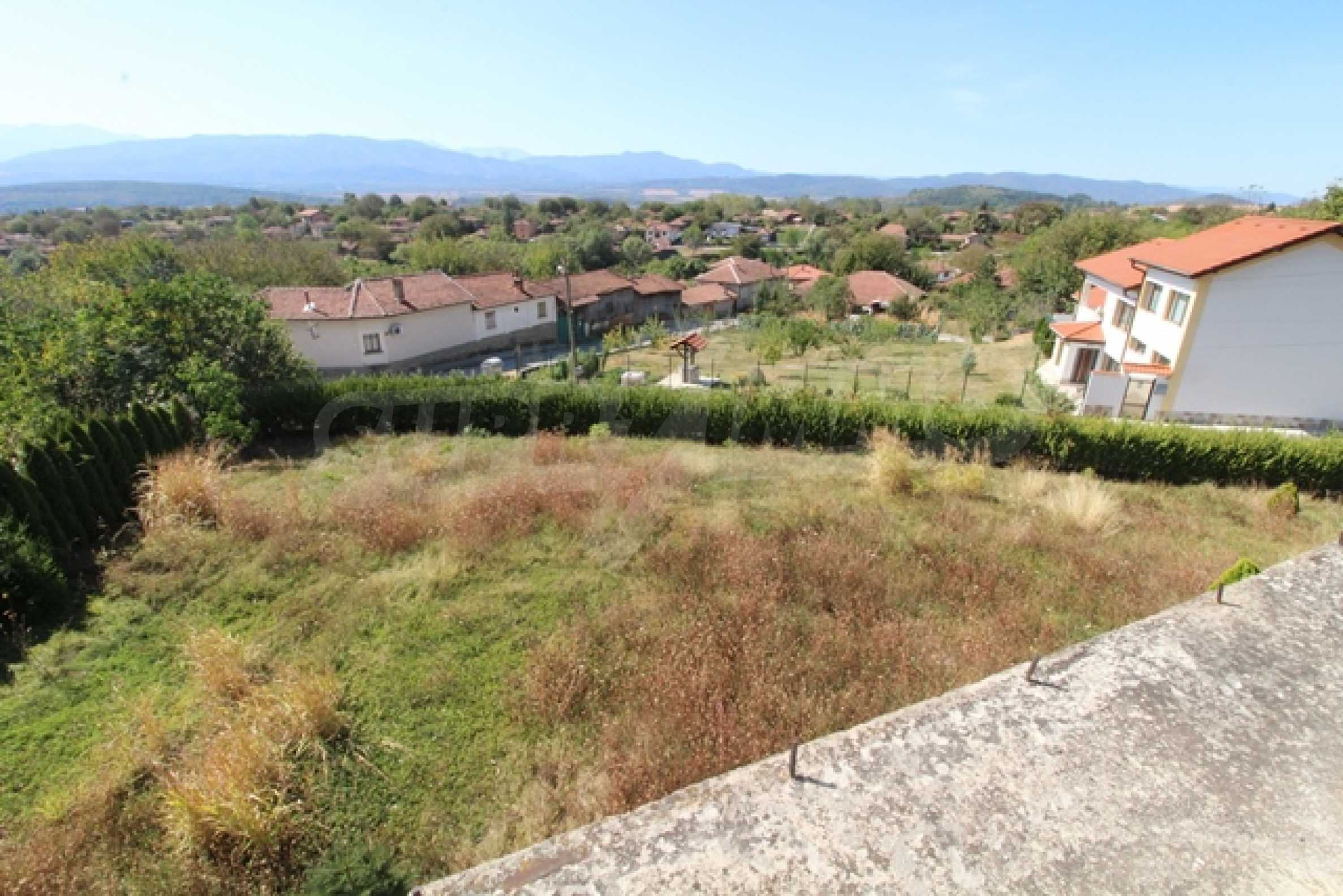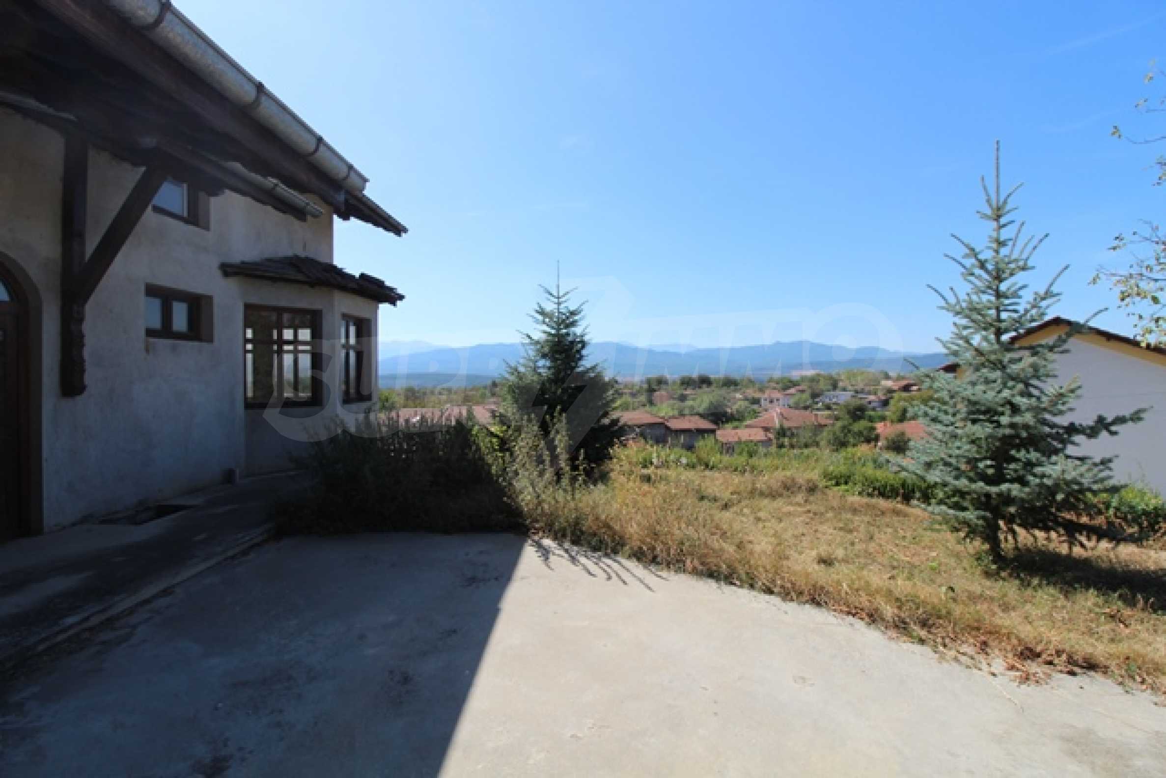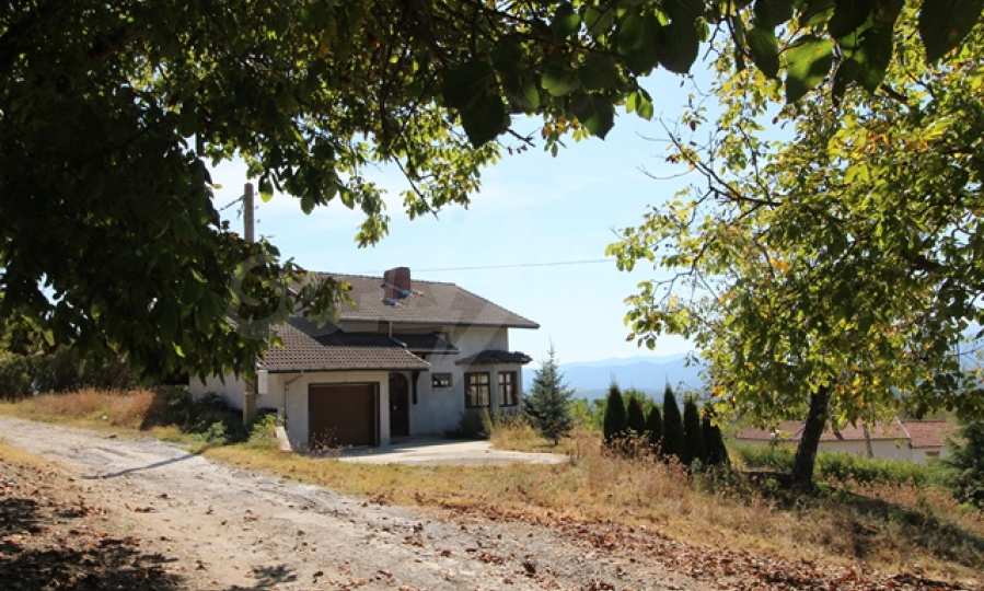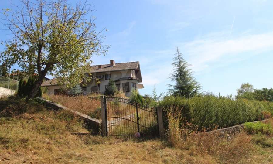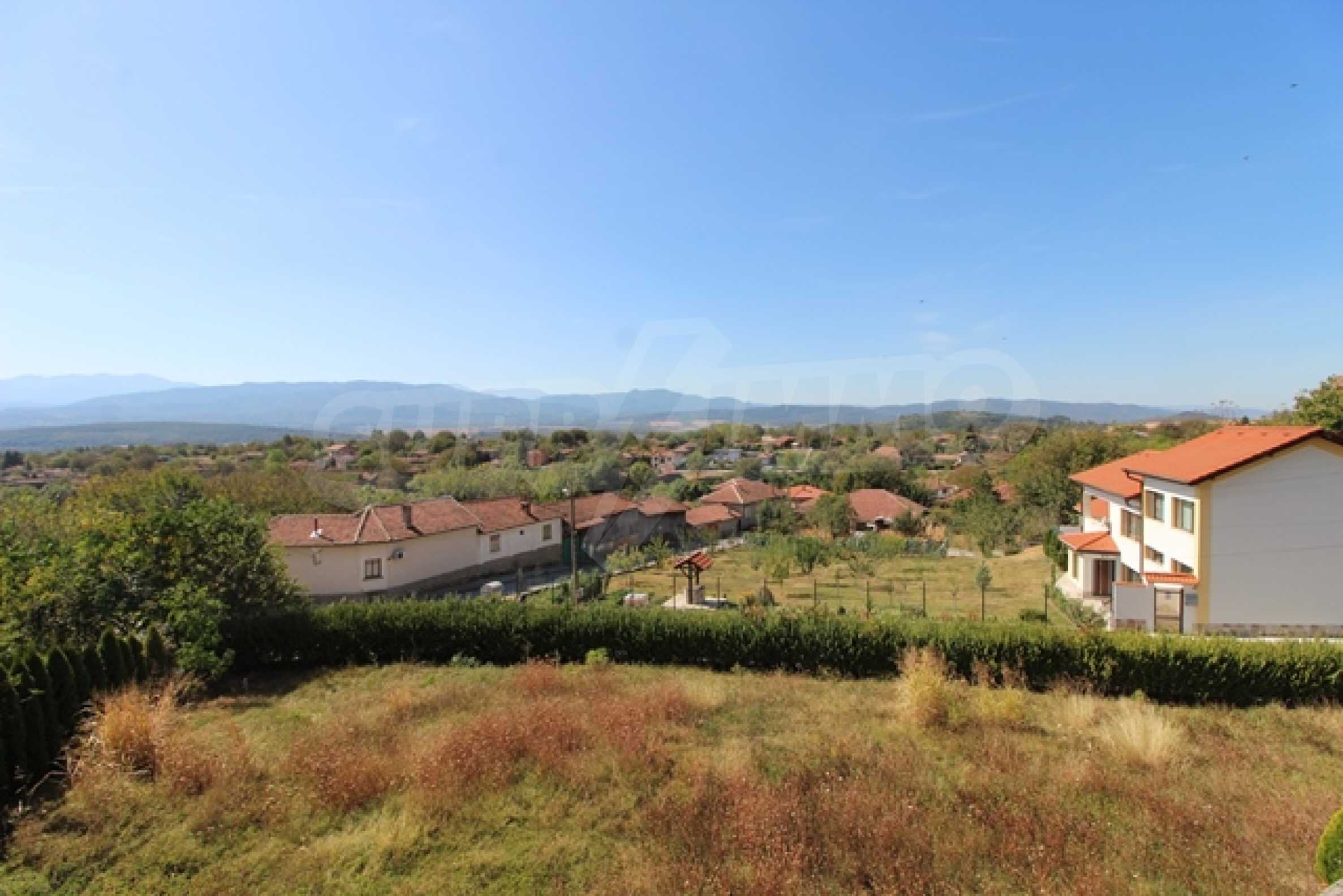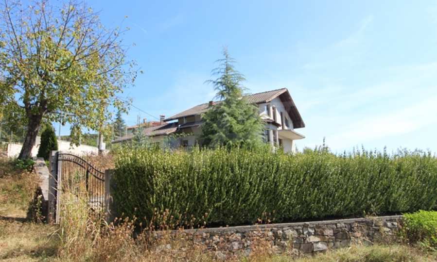 The first level has a garage and entrance to the house. On the floor there is a corridor, a toilet, a bedroom, a large living room with a kitchen area and a terrace with panoramic views of the Balkan Mountains. On the ground floor there is a boiler room and a bathroom with toilet, a large dining room, a kitchen area and a living room, and on the third floor of the house there are three bedrooms and a large bathroom with toilet. Both bedrooms lead to a second shared panoramic terrace. There is a garage and at the back there is a barbecue area, there is also an outdoor fountain.
