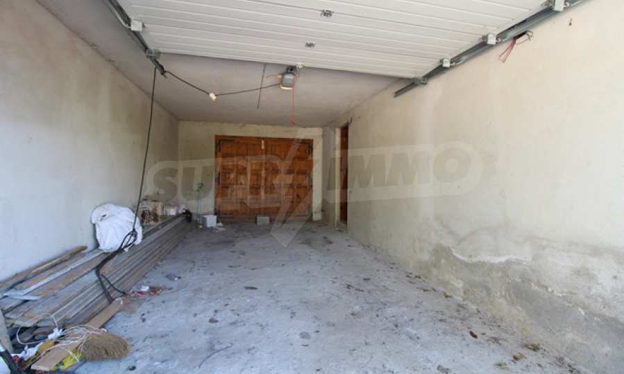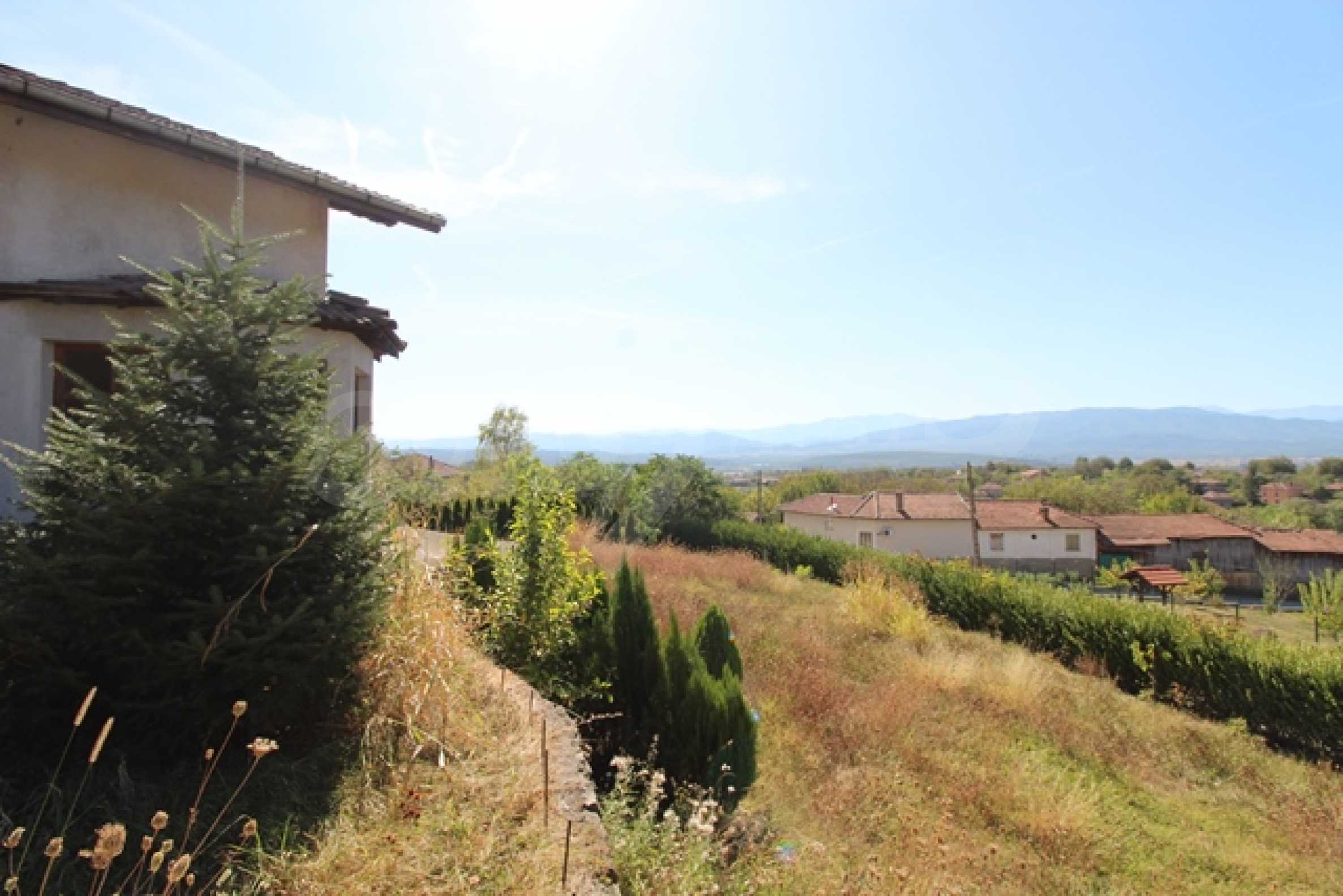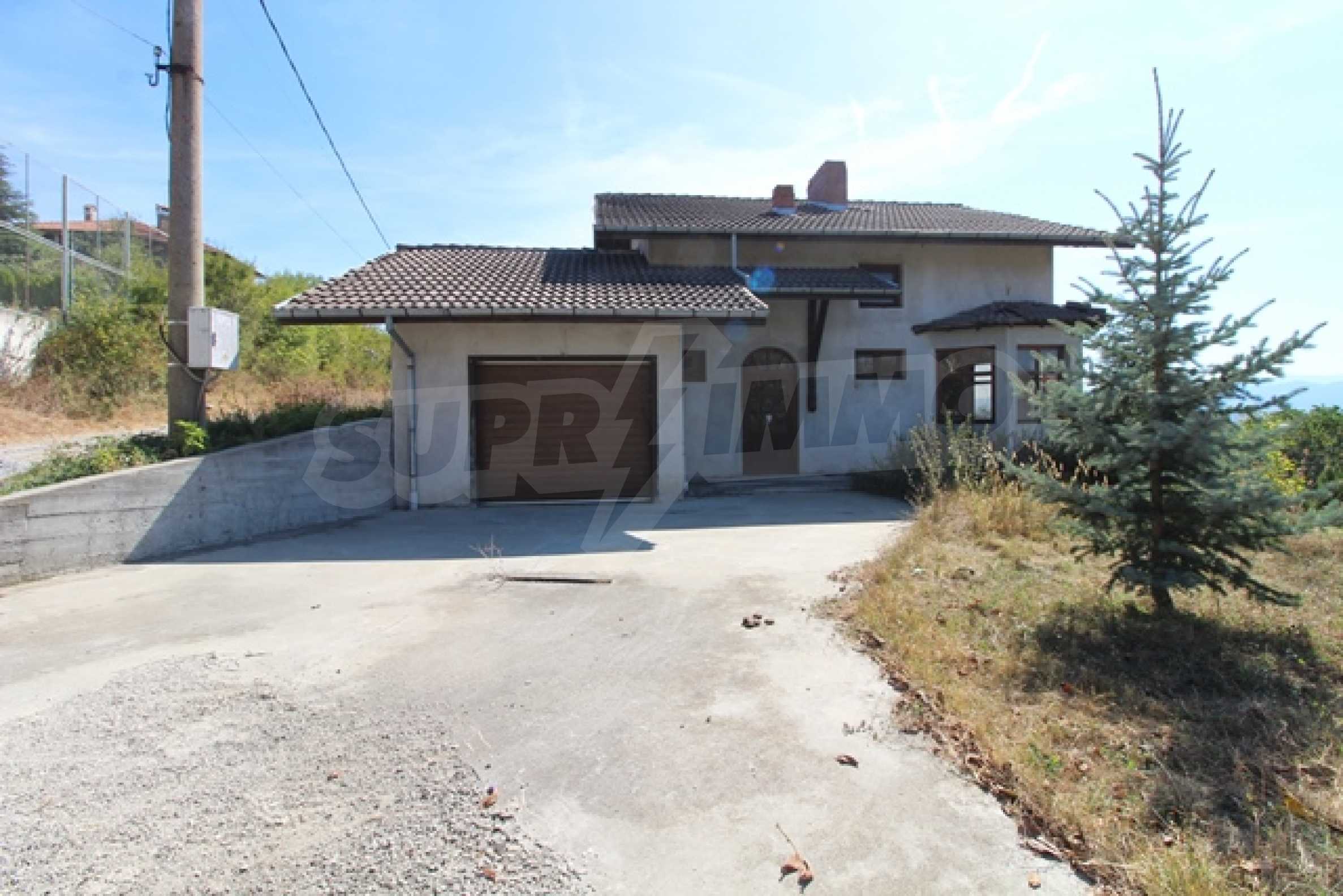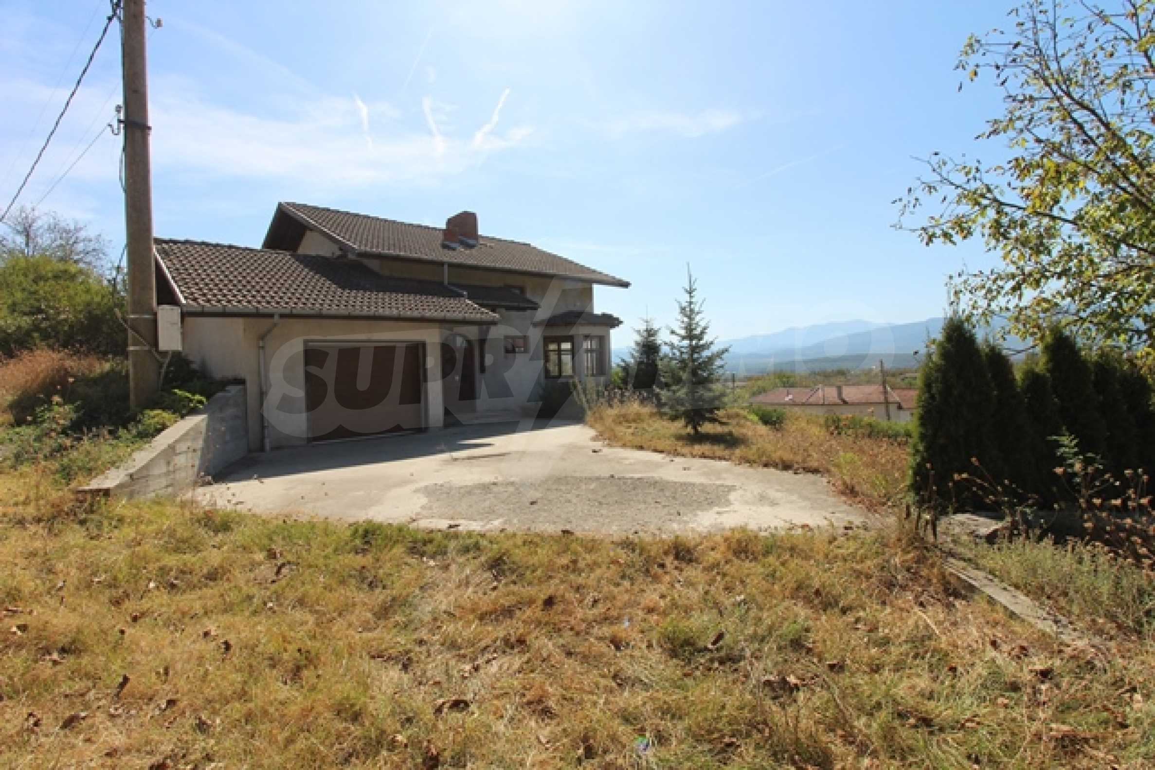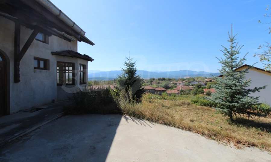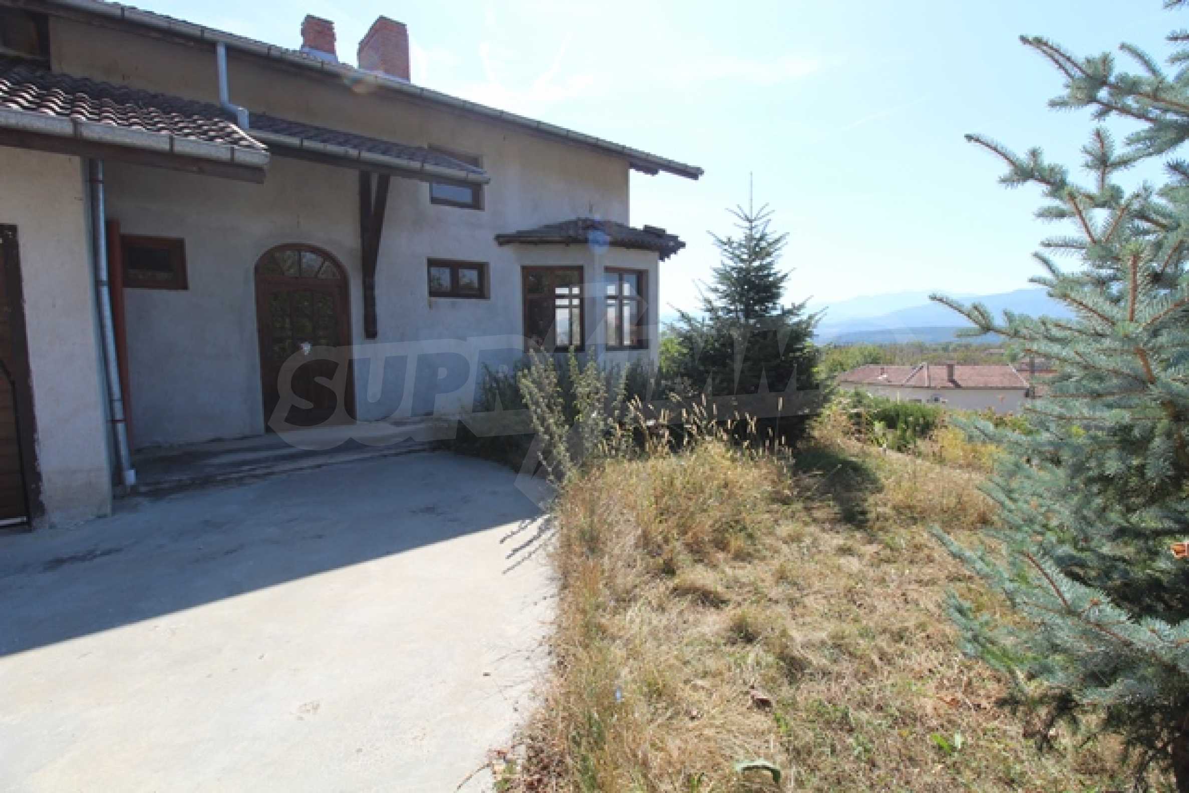 The first level has a garage and entrance to the house. On the floor there is a corridor, a toilet, a bedroom, a large living room with a kitchen area and a terrace with panoramic views of the Balkan Mountains. On the ground floor there is a boiler room and a bathroom with toilet, a large dining room, a kitchen area and a living room, and on the third floor of the house there are three bedrooms and a large bathroom with toilet. Both bedrooms lead to a second shared panoramic terrace. There is a garage and at the back there is a barbecue area, there is also an outdoor fountain.