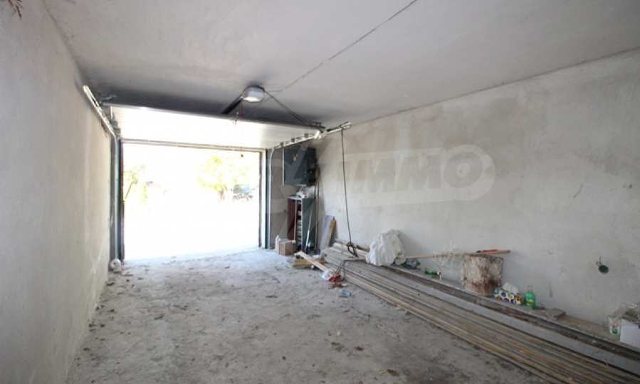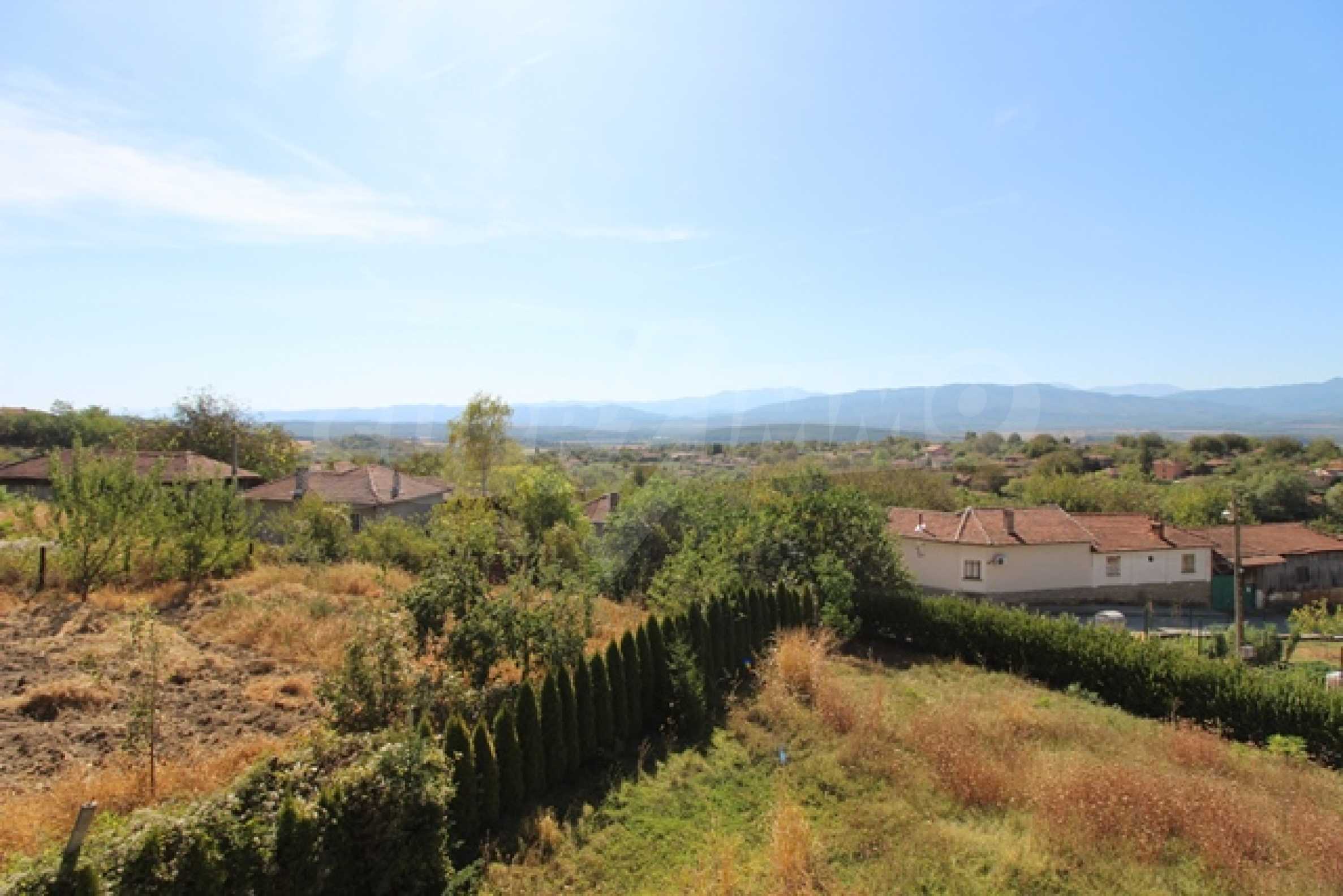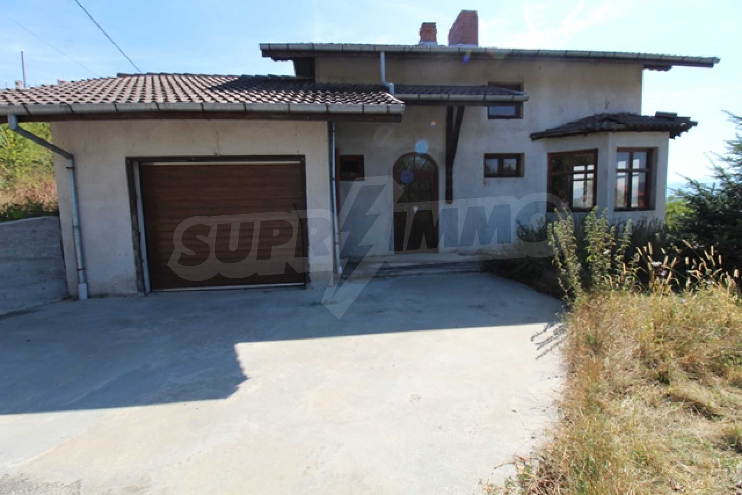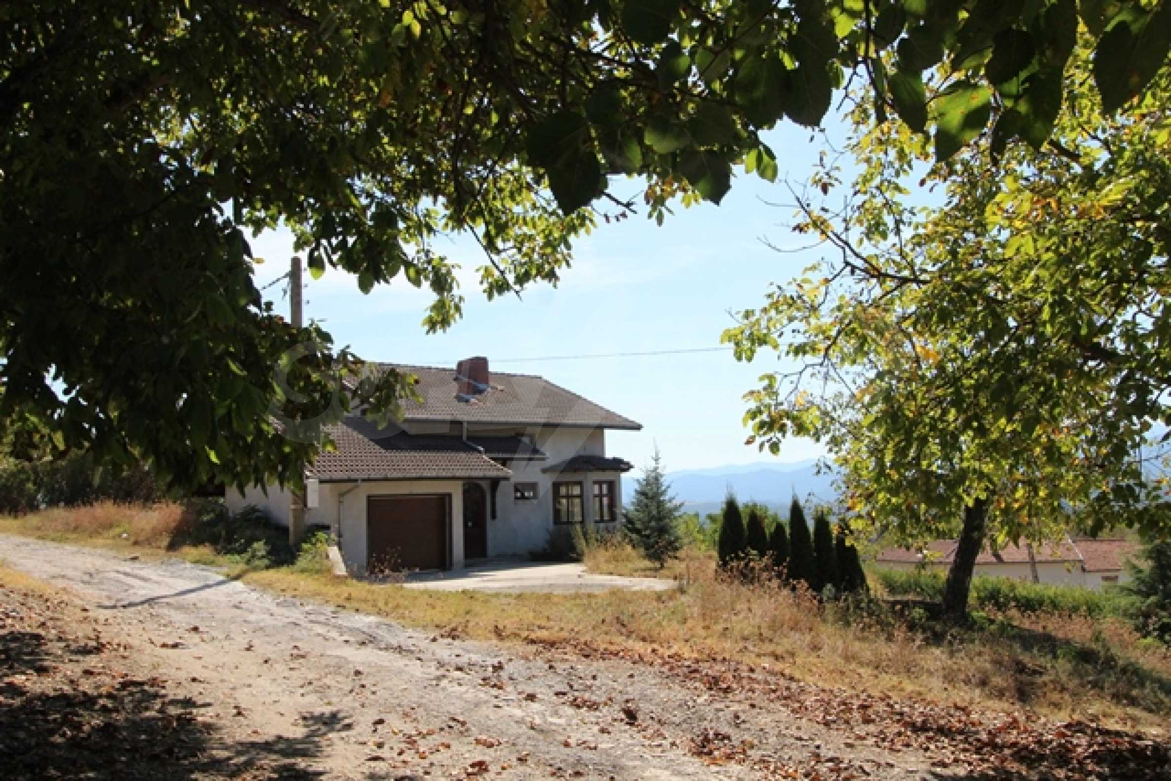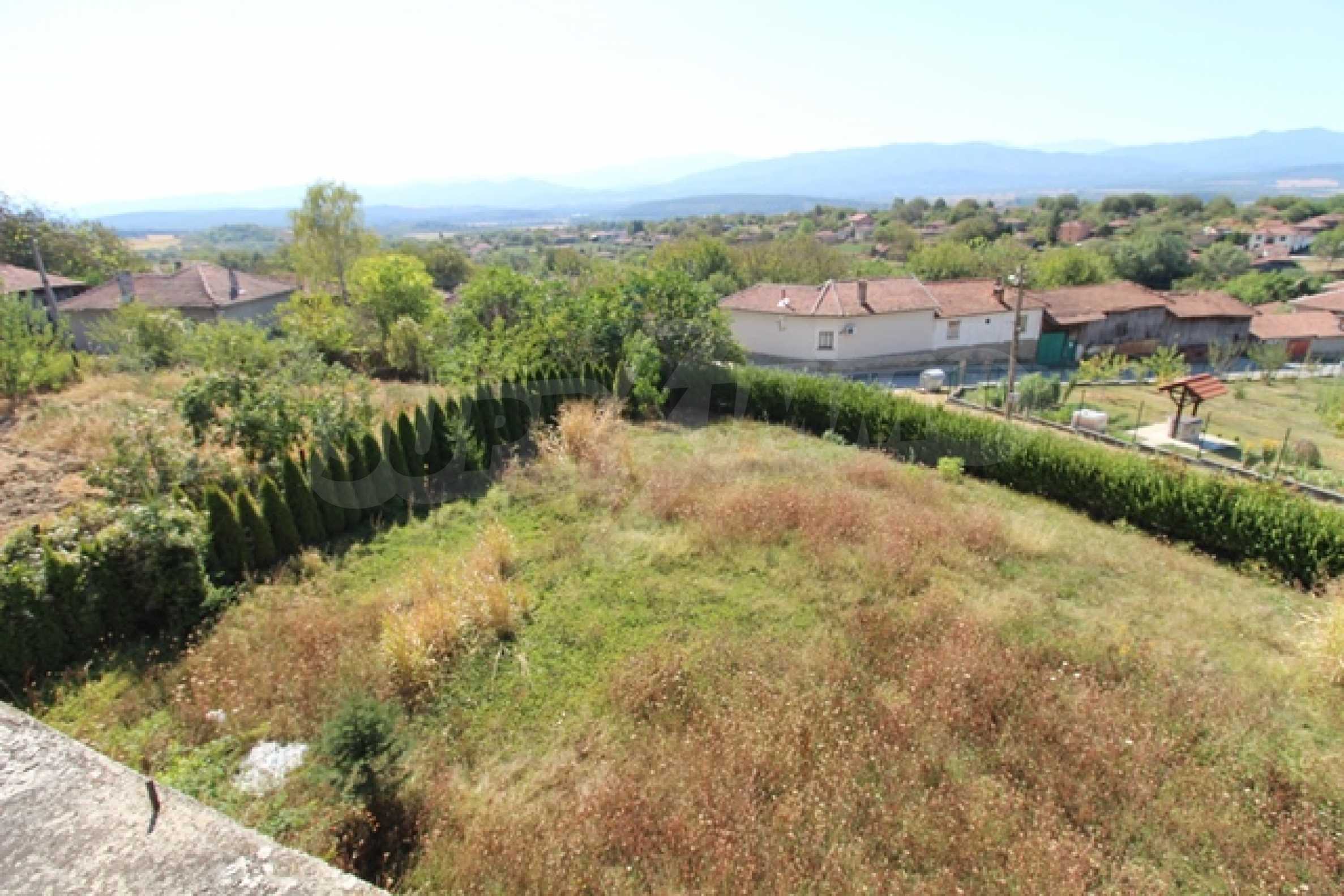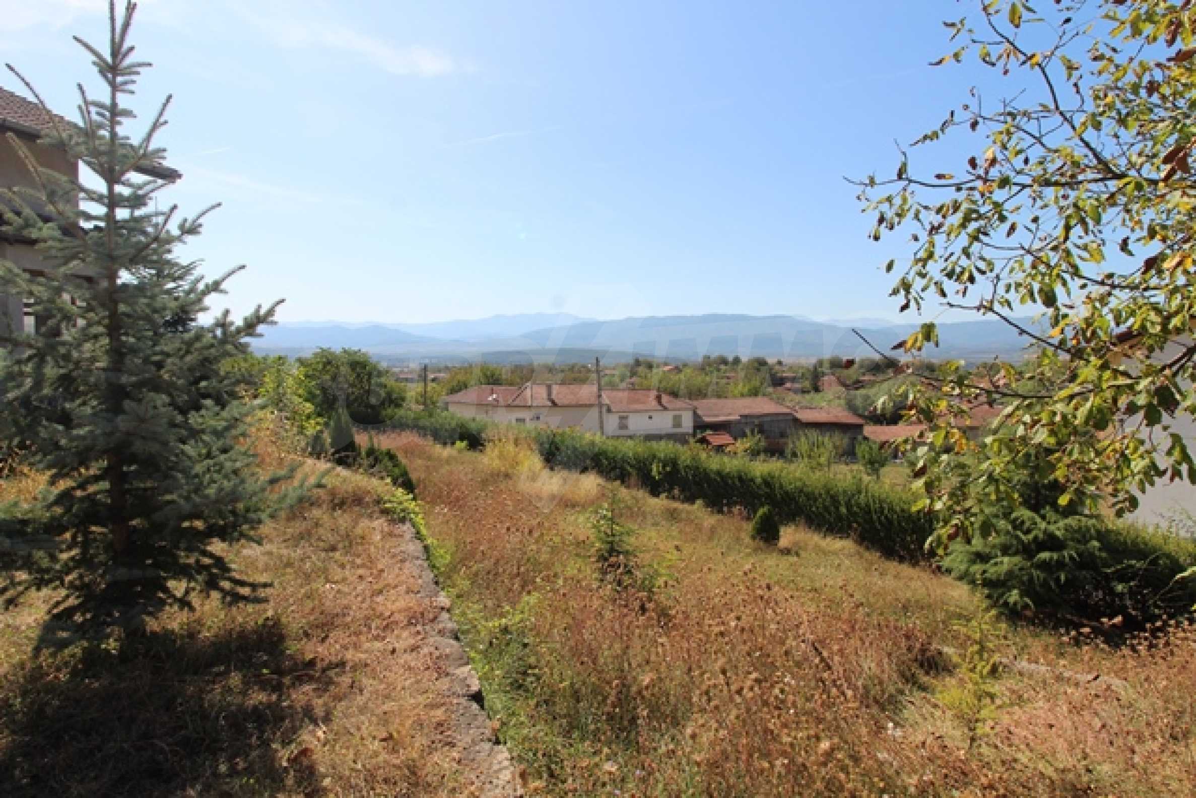 The first level has a garage and entrance to the house. On the floor there is a corridor, a toilet, a bedroom, a large living room with a kitchen area and a terrace with panoramic views of the Balkan Mountains. On the ground floor there is a boiler room and a bathroom with toilet, a large dining room, a kitchen area and a living room, and on the third floor of the house there are three bedrooms and a large bathroom with toilet. Both bedrooms lead to a second shared panoramic terrace. There is a garage and at the back there is a barbecue area, there is also an outdoor fountain.