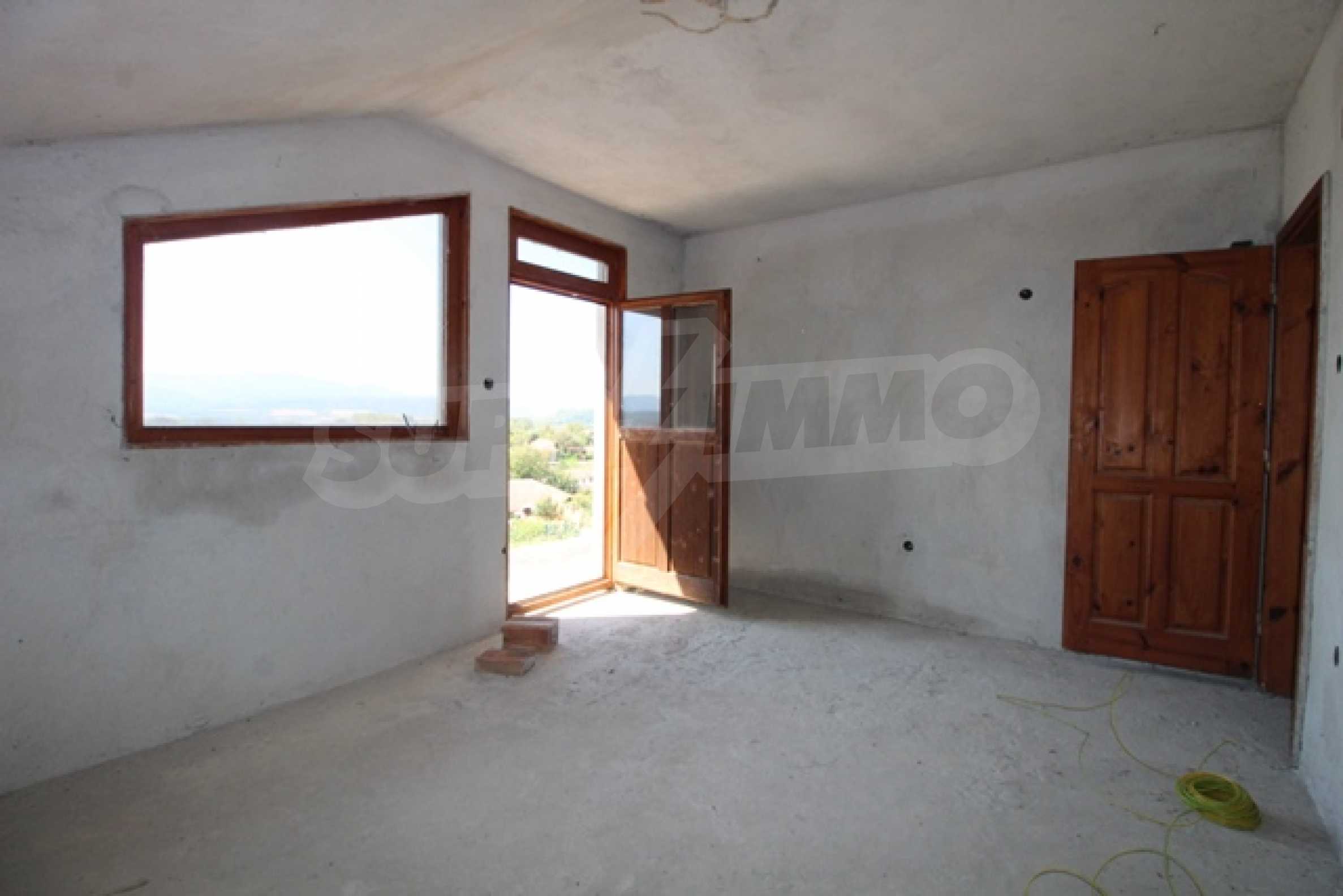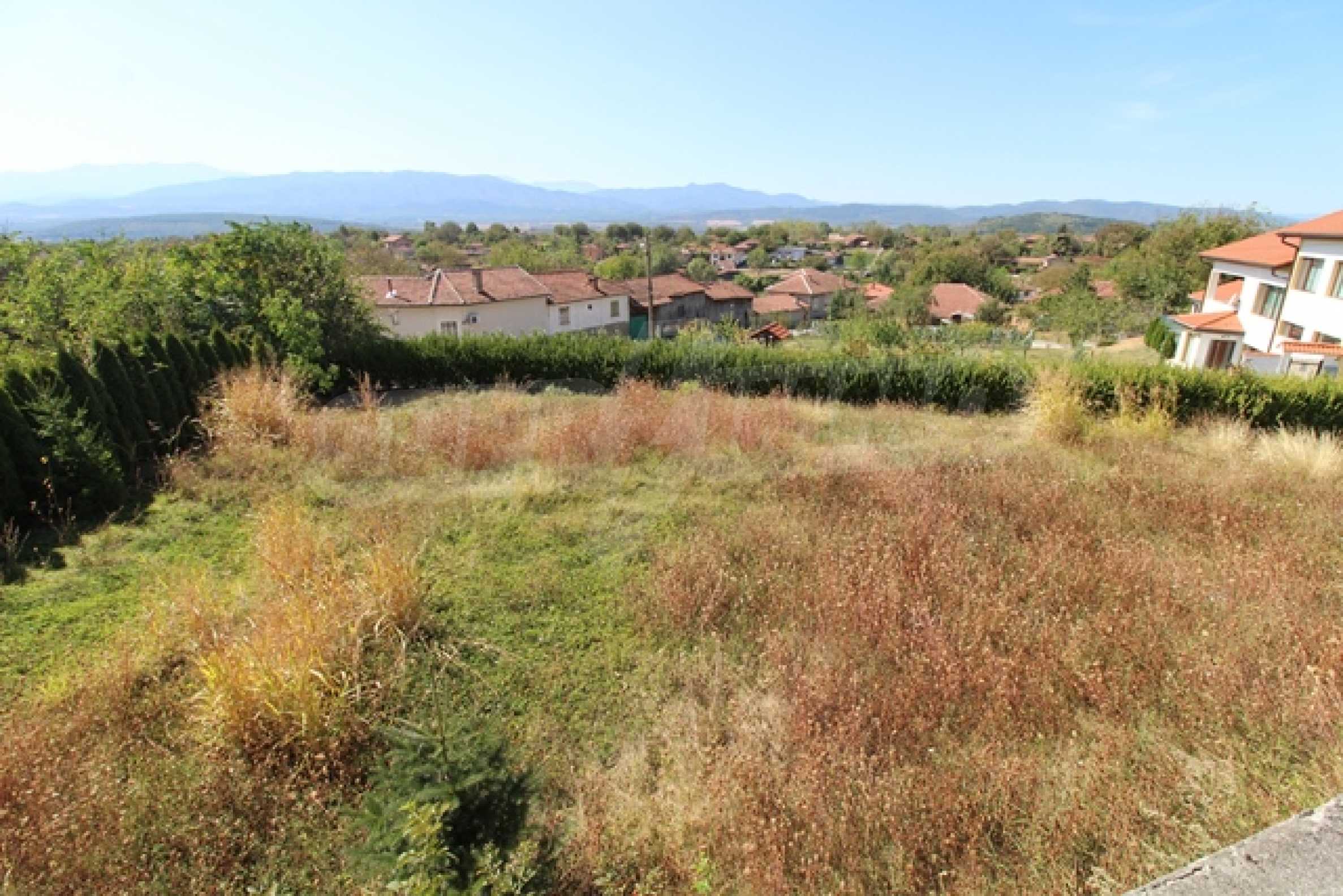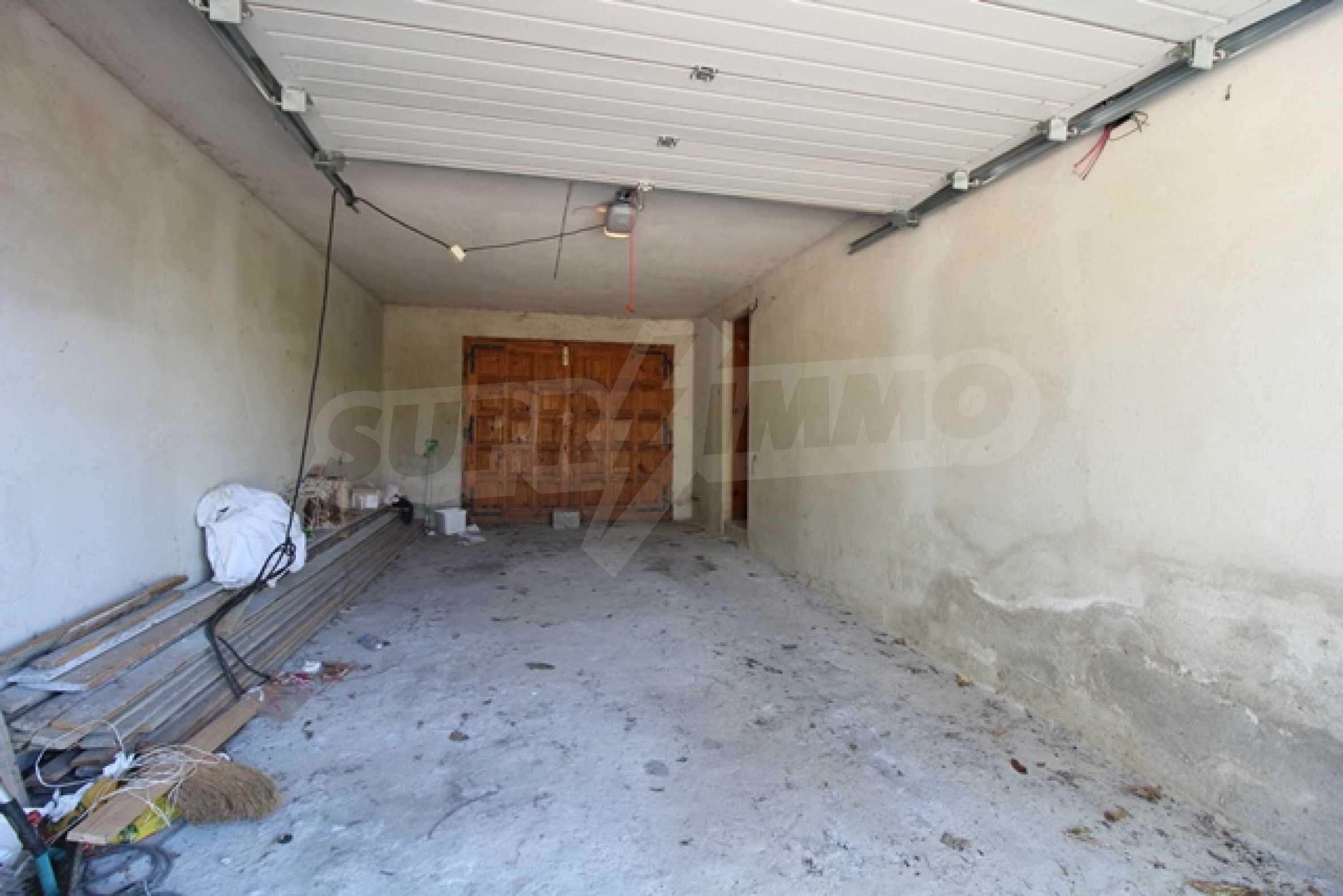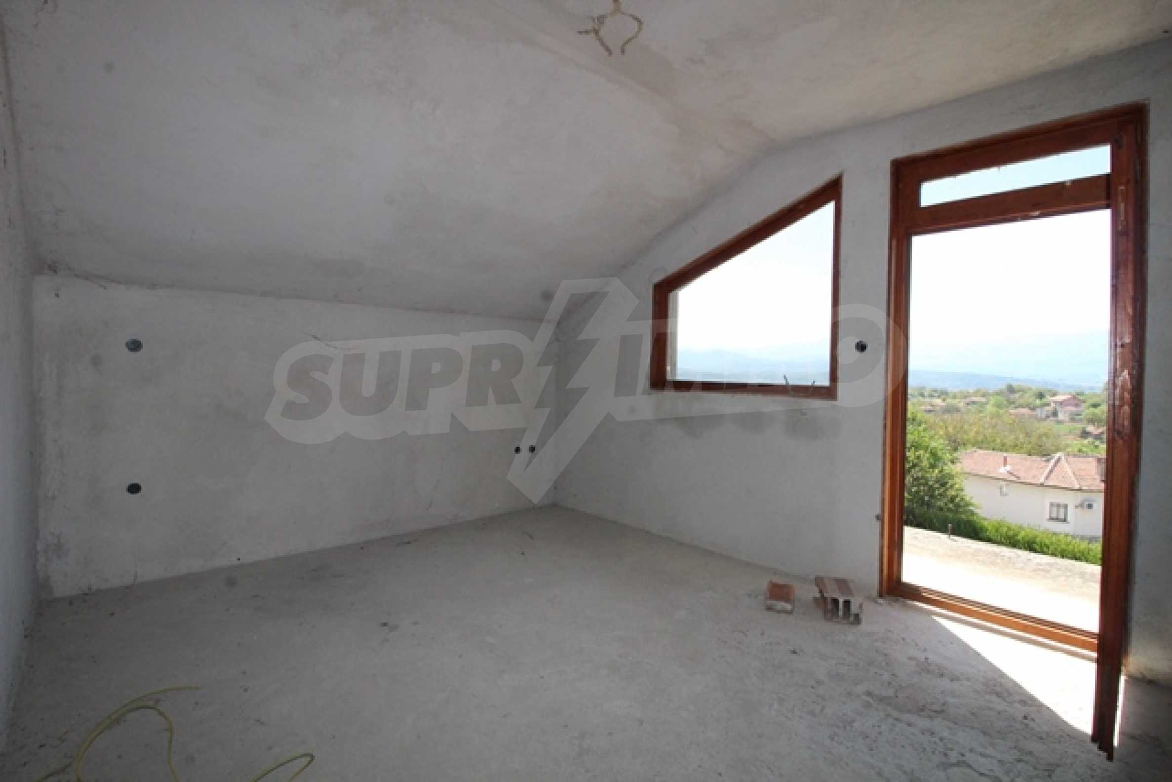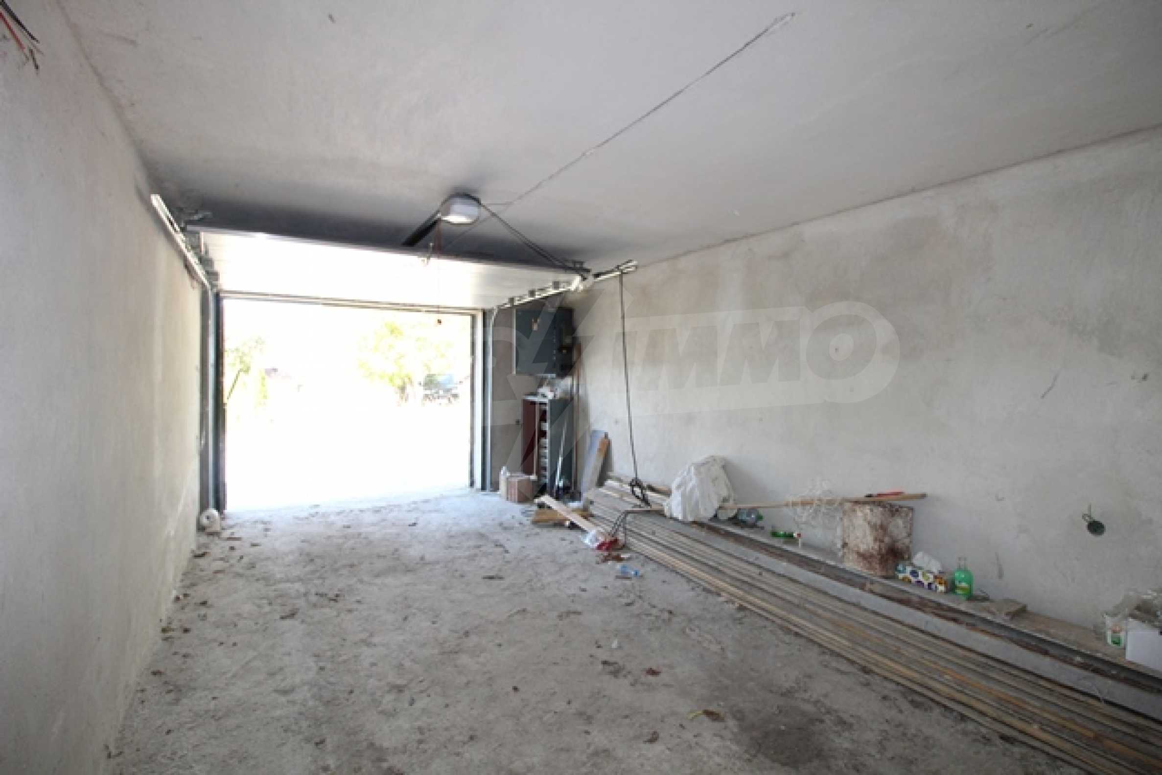The first level has a garage and entrance to the house. On the floor there is a corridor, a toilet, a bedroom, a large living room with a kitchen area and a terrace with panoramic views of the Balkan Mountains. On the ground floor there is a boiler room and a bathroom with toilet, a large dining room, a kitchen area and a living room, and on the third floor of the house there are three bedrooms and a large bathroom with toilet. Both bedrooms lead to a second shared panoramic terrace. There is a garage and at the back there is a barbecue area, there is also an outdoor fountain.