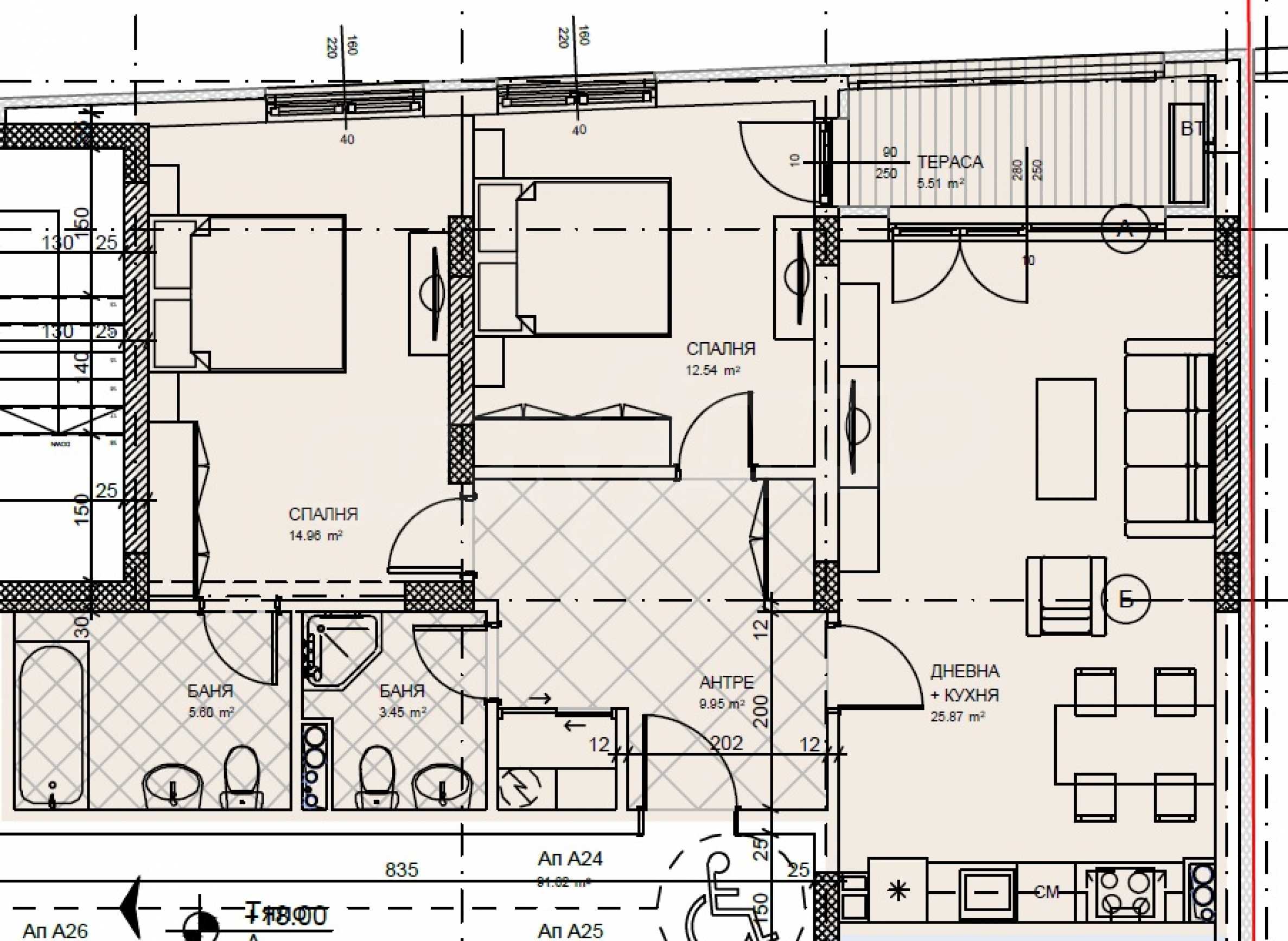 a) вътрешни стени и тавани на апартамент - машинно гипсова мазилка с алуминиеви ъгли по всички външни ъгли;