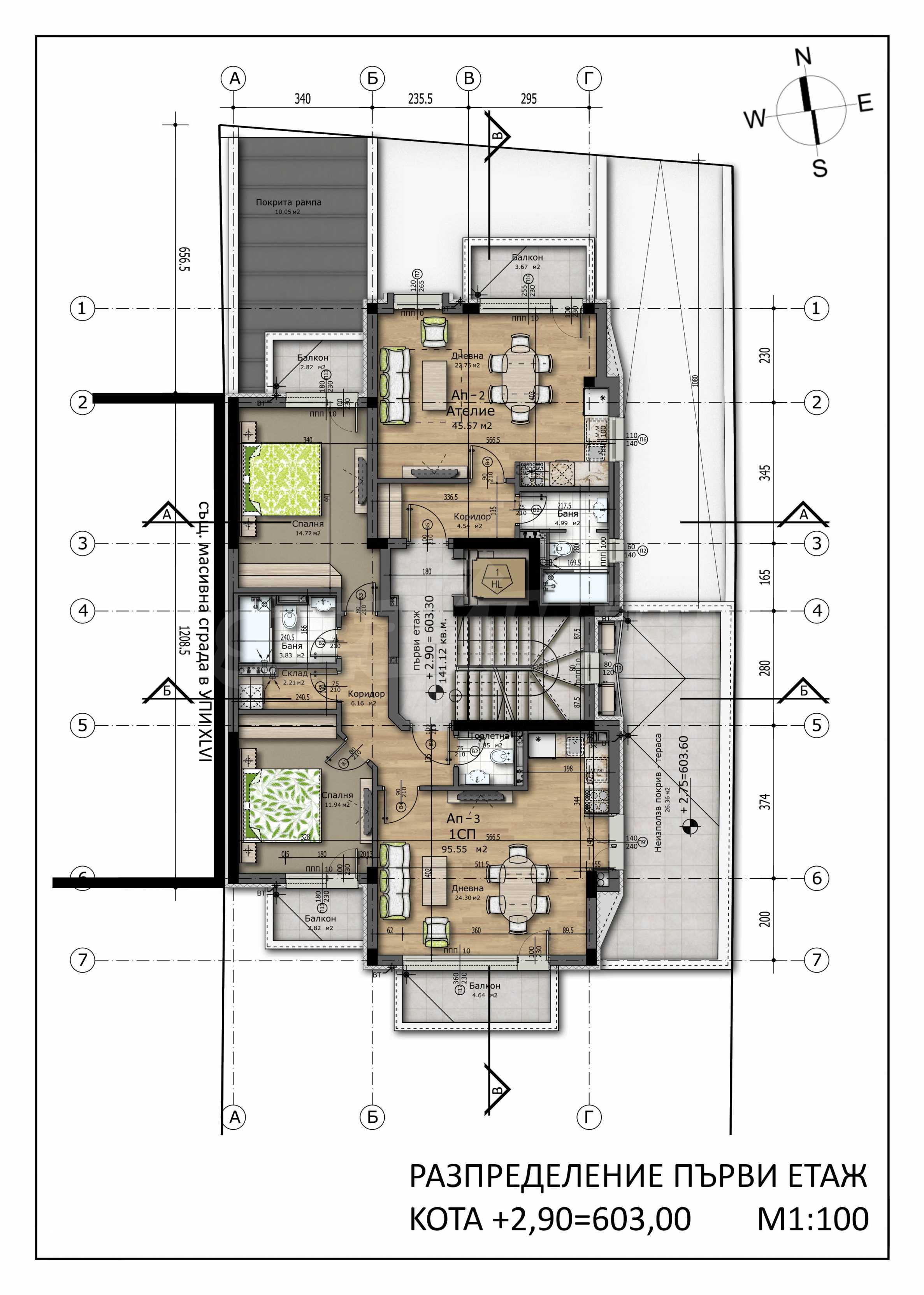 The property occupies the first floor above a residential ground floor of a four-storey building. The exposure is south, north and east. The property will be handed over to plaster and putty with the following finishing works:
