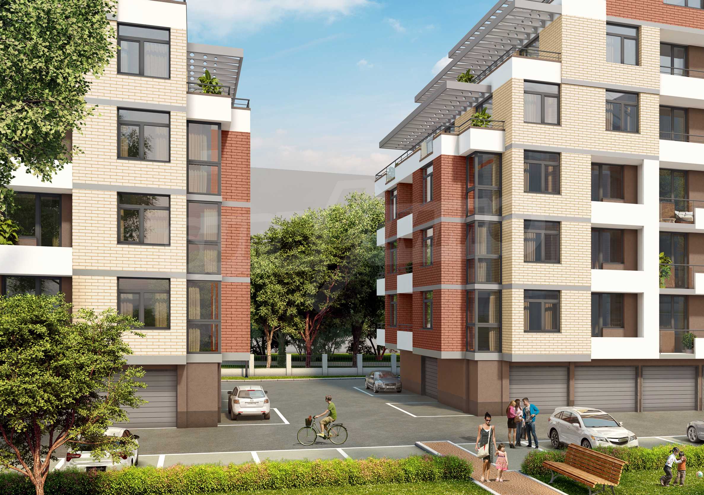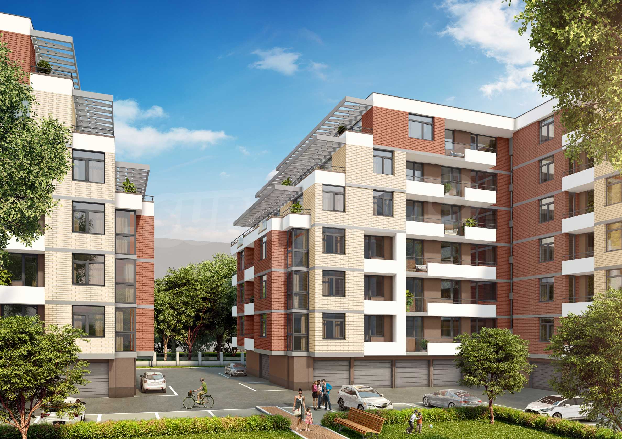 The residential complex consists of 7 buildings with 192 apartments, 3 shops for industrial goods, 192 garages and parking spaces in the underground and ground level and in the free yard.