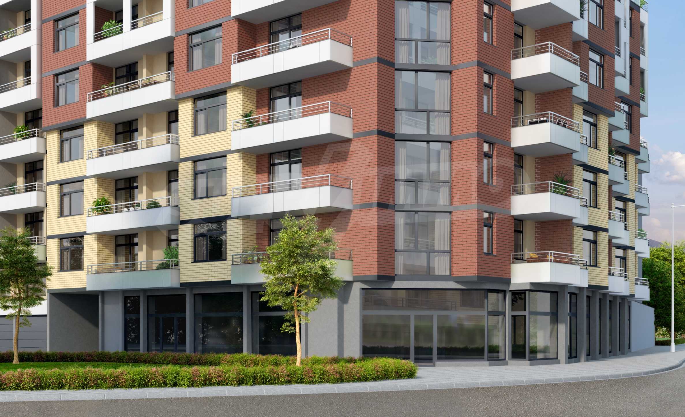 The facade has a characteristic architectural image, as a combination of pale yellow and red visible brickwork and colored plaster, finishing the fronts of the slabs and terraces with "Etalbond".