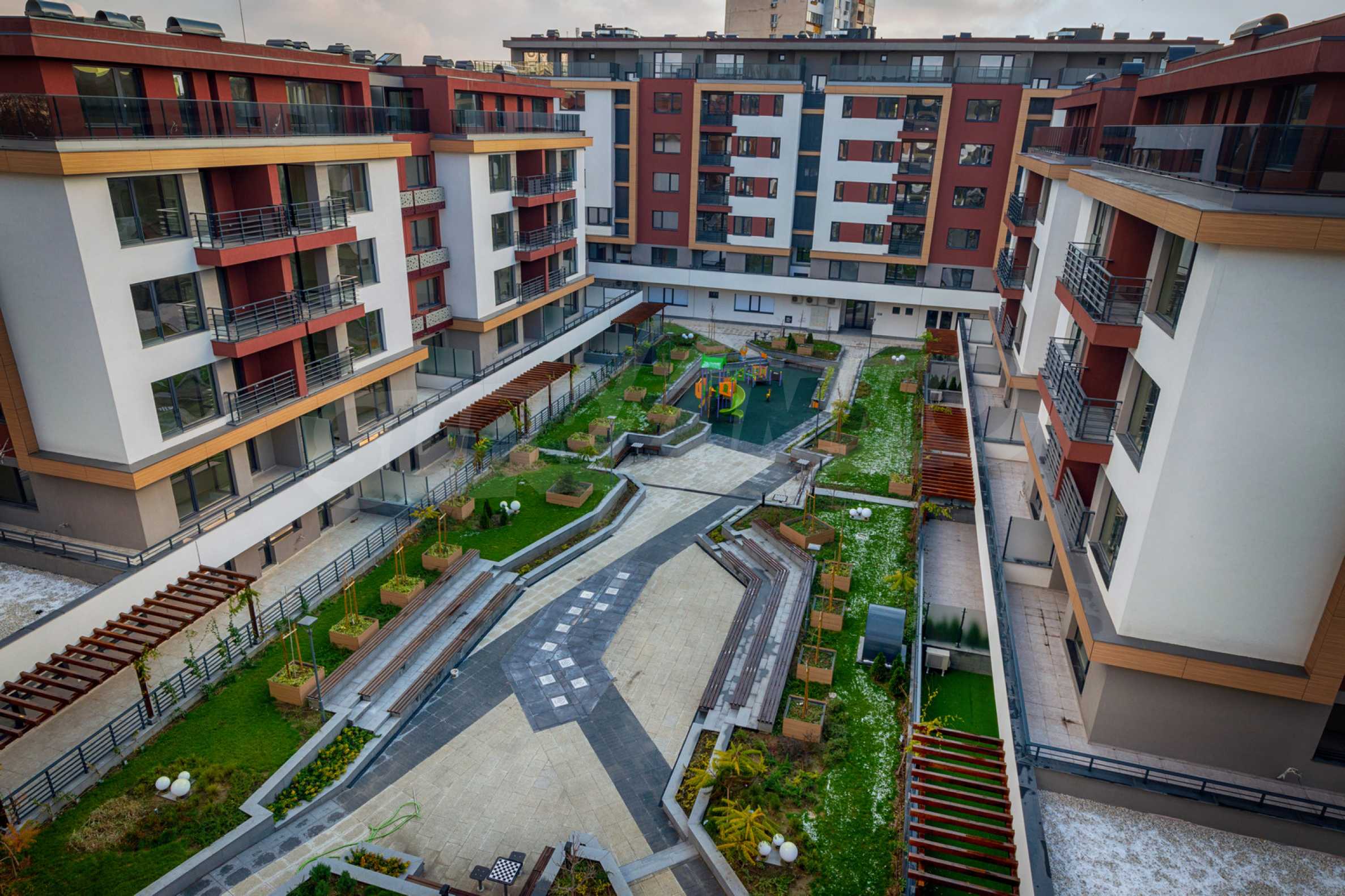 The landscaping is realized both in the courtyard and on part of the roof terraces. In the courtyard there is a separate playground, as well as areas for rest and relaxation with various functions. The residential group is a closed type, with controlled access with barriers.