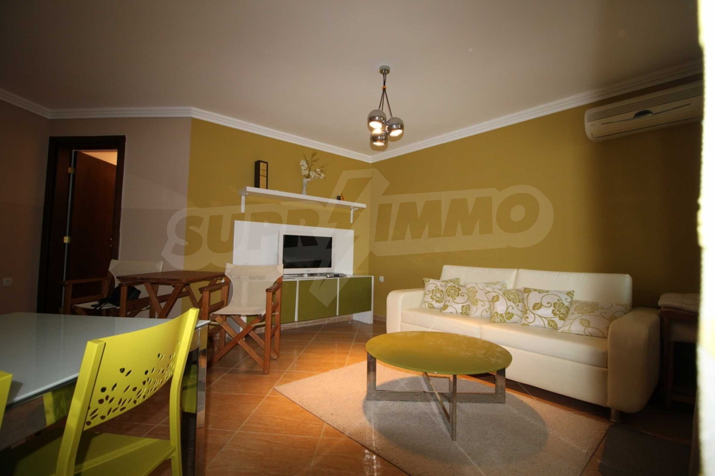 A novelty among the large classic apartments on the first line of St. Vlas. The sale of the apartment from the company SUPRIMMO, located on the first floor of the Resort Marina Dinevi, is open. The apartment has been luxuriously repaired, luxurious furniture and built-in appliances are installed - everything remains after registration in the Notariat. The layout has a spacious lounge with dining room, living area and kitchen, two bedrooms, two bathrooms and two terraces, one of which has sea views. The total area of this luxury apartment is 86 square meters. m