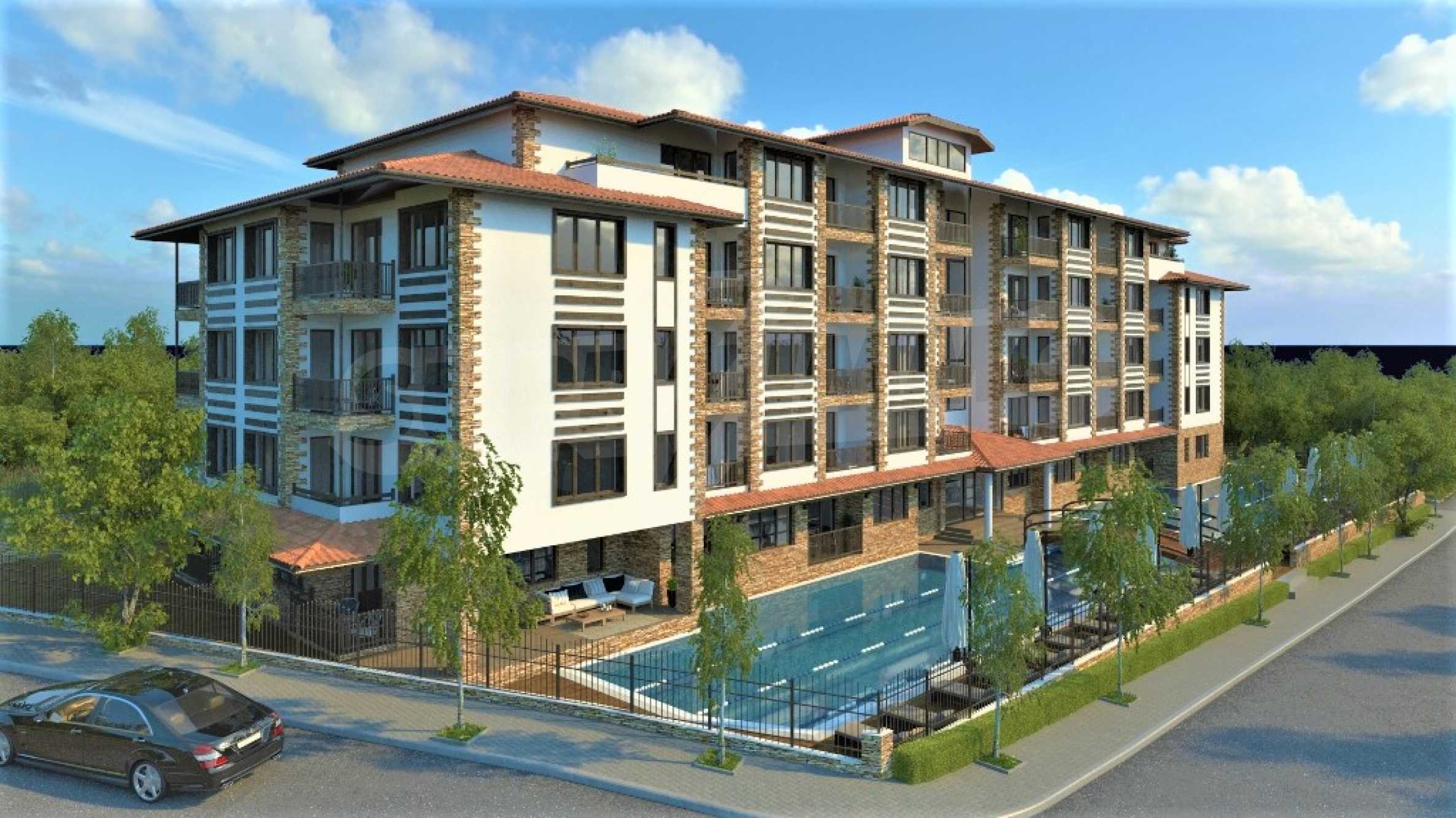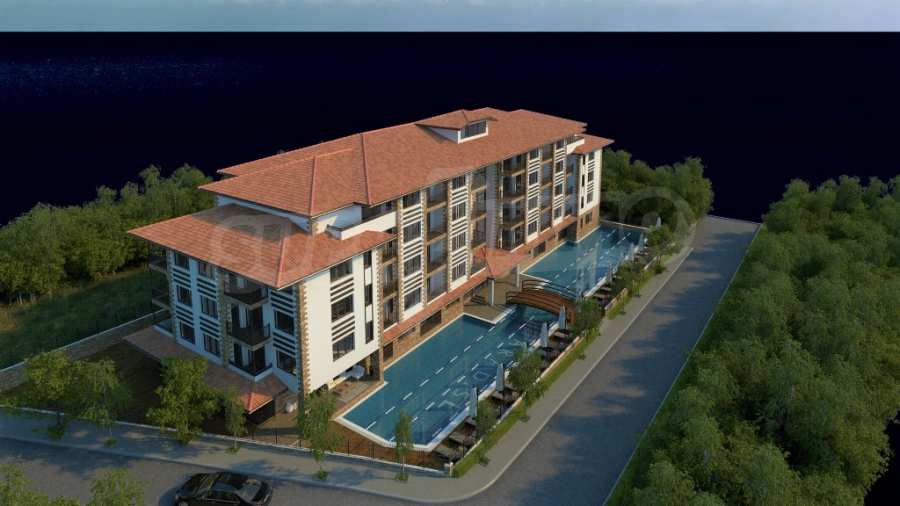 The building is designed on 5 floors, with a rectangular shape, with underground parking, an outdoor large swimming pool, an elevator and a staircase.