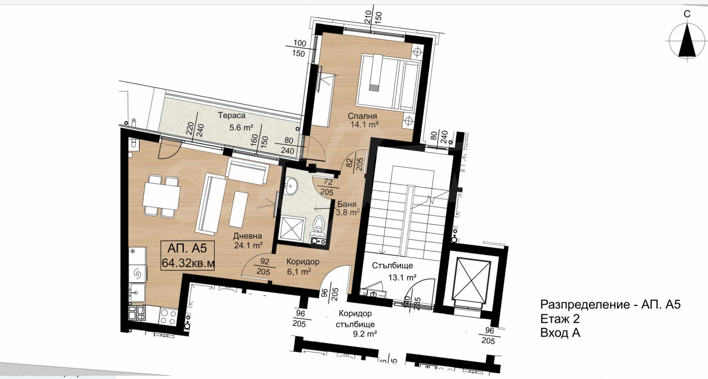 Apartment A5 is located in entrance A, on the second floor and consists of a living room with a kitchenette, a bedroom, a terrace and a bathroom with a toilet. The exposure of the apartment is north and west. Heating is provided by gas