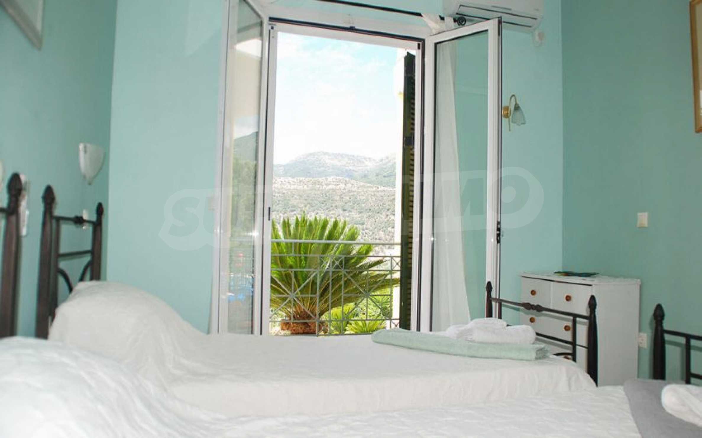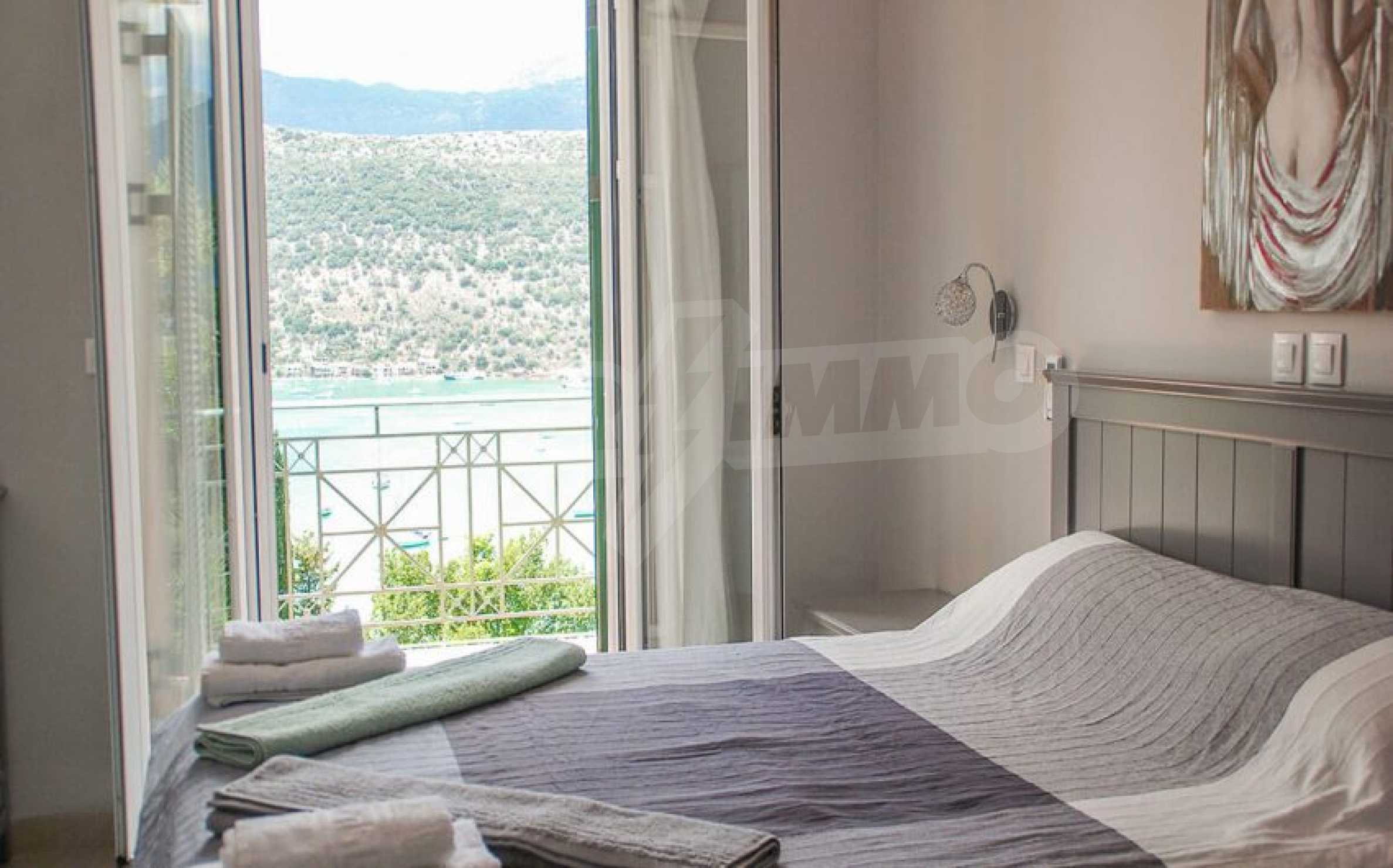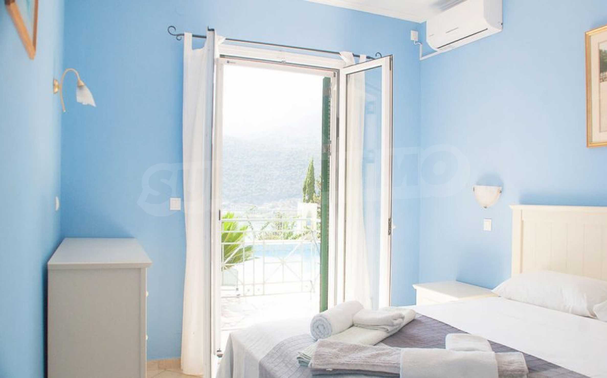 The fully equipped and furnished property has a total area of 216 m2. and is on two levels. The ground floor consists of an open plan kitchen - a dining area with a comfortable porch in the front, a laundry room and two bedrooms. The other room is also large enough and has a guest bathroom. All areas have pool and bay views. Through the internal staircase the upper floor consists of a large and comfortable living room, two more bedrooms with verandas and panoramic views of the bay.