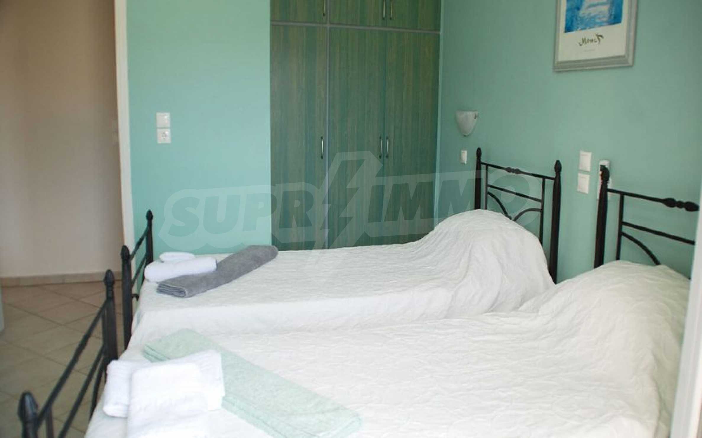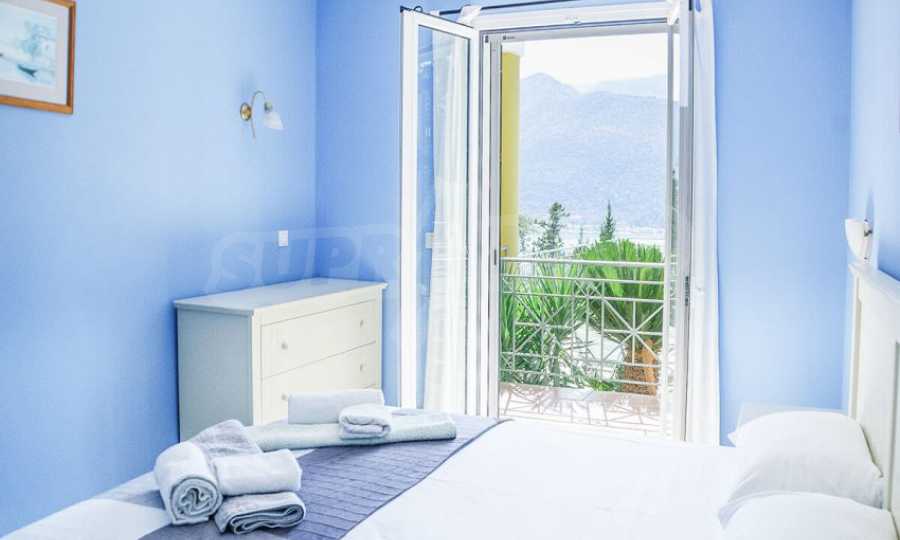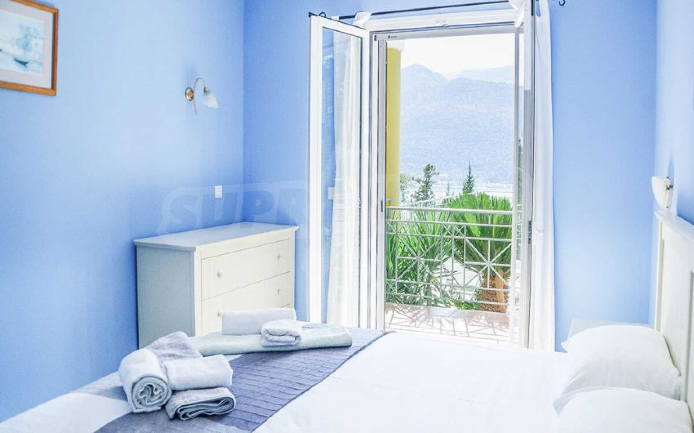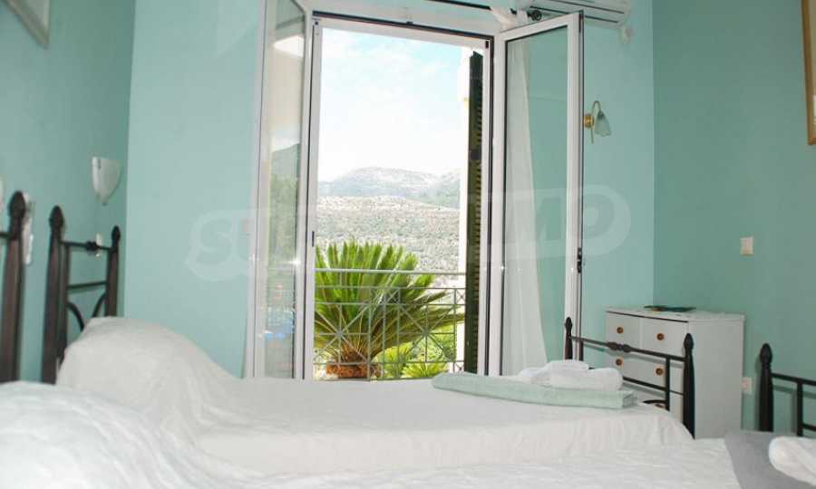 The fully equipped and furnished property has a total area of 216 m2. and is on two levels. The ground floor consists of an open plan kitchen - a dining area with a comfortable porch in the front, a laundry room and two bedrooms. The other room is also large enough and has a guest bathroom. All areas have pool and bay views. Through the internal staircase the upper floor consists of a large and comfortable living room, two more bedrooms with verandas and panoramic views of the bay.