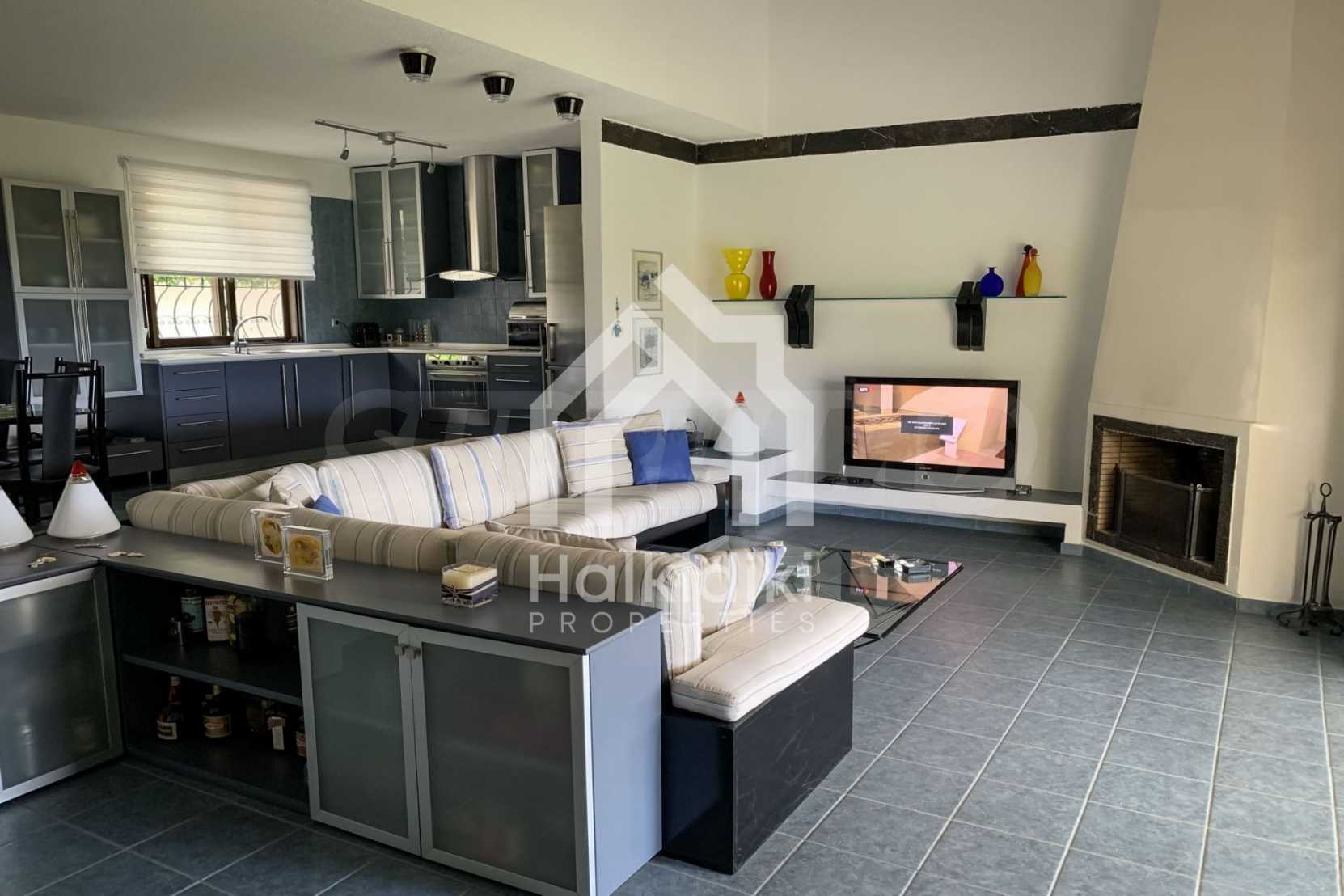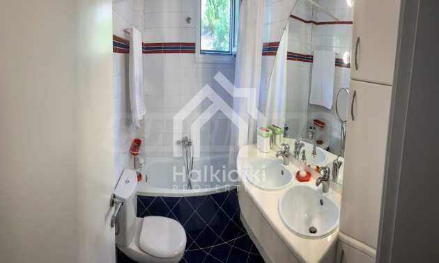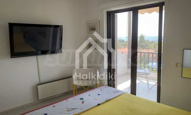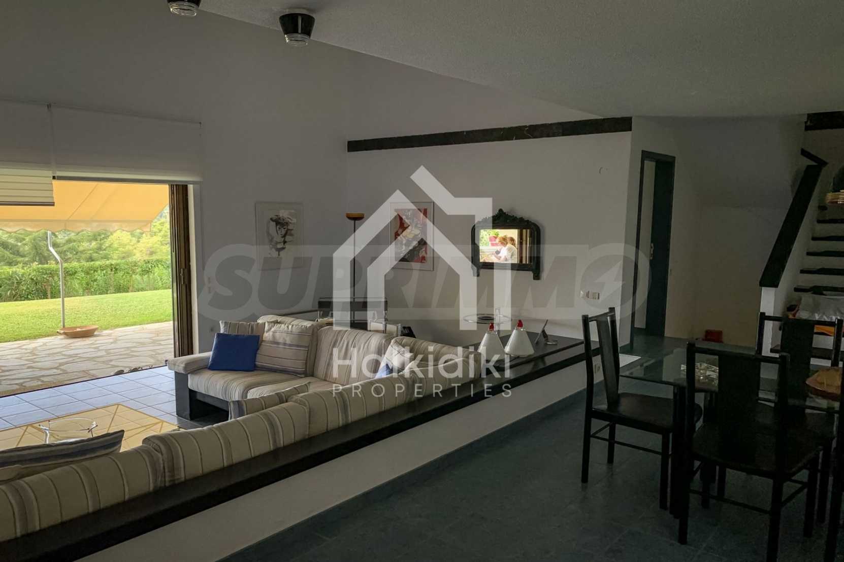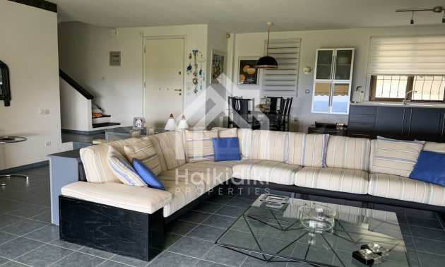 Furnished detached house,250 m²,in Kassandra,Halkidiki with unobstructed permanent sea view and with a western orientation.The property is 700 m. away from the beach and 2 km. away from the center of the village.The house is split in three levels,consisted of a living room connected with the kitchen,three bedrooms,two bathrooms,a wc and a storage room.The property,also,has spacious garden,solar heater and kiosk.