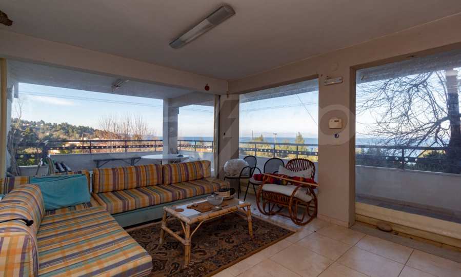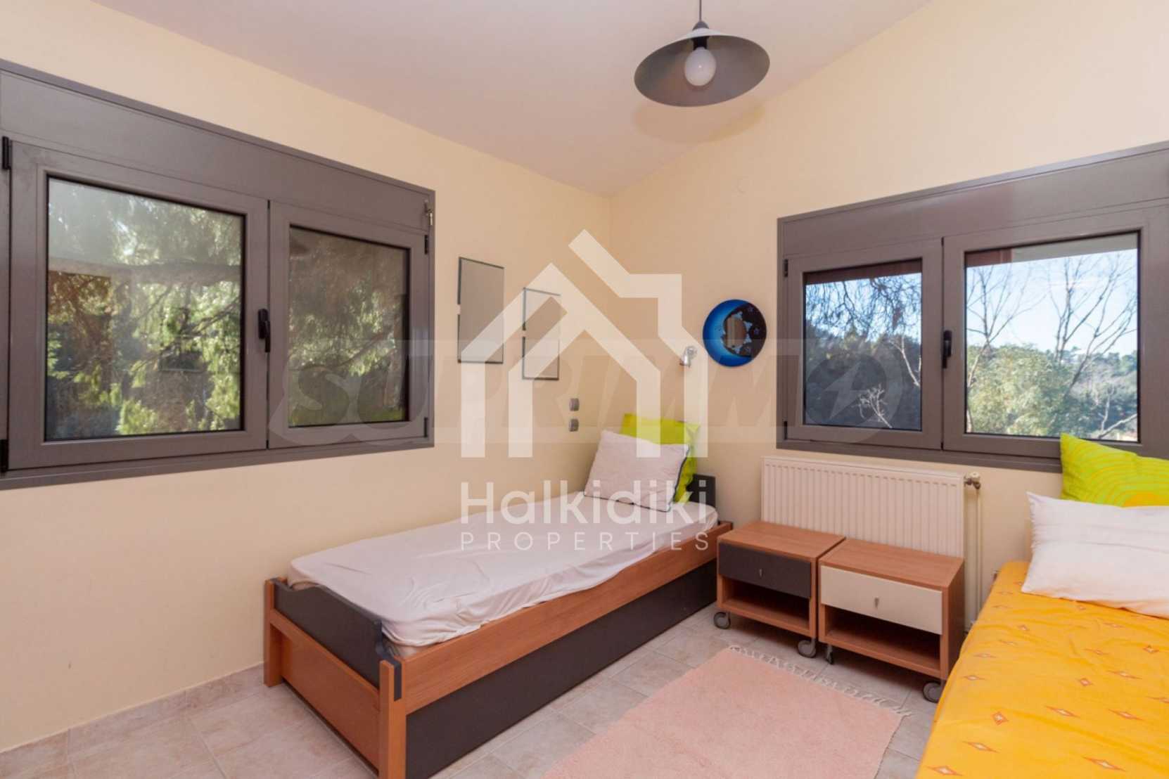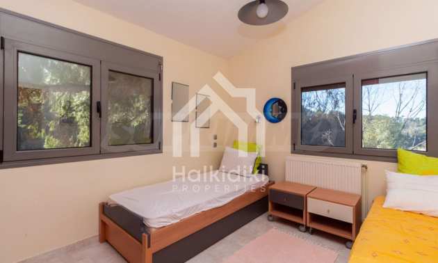 Renovated detached house,145 m²,in Kassandra,Halkidiki with unobstructed permanent sea view of Toronaios bay.The property is surrounded by 5.078 m² plot, a few meters away from a magical beach.The house is split in two levels,consisted of two living rooms connected with the kitchens,four bedrooms,two bathrooms and a storage room.The property,also,has barbecue,alarm system,security door,solar heater,automated watering,drilling,water tanks,satelite antenna,fitted closets and olive field.