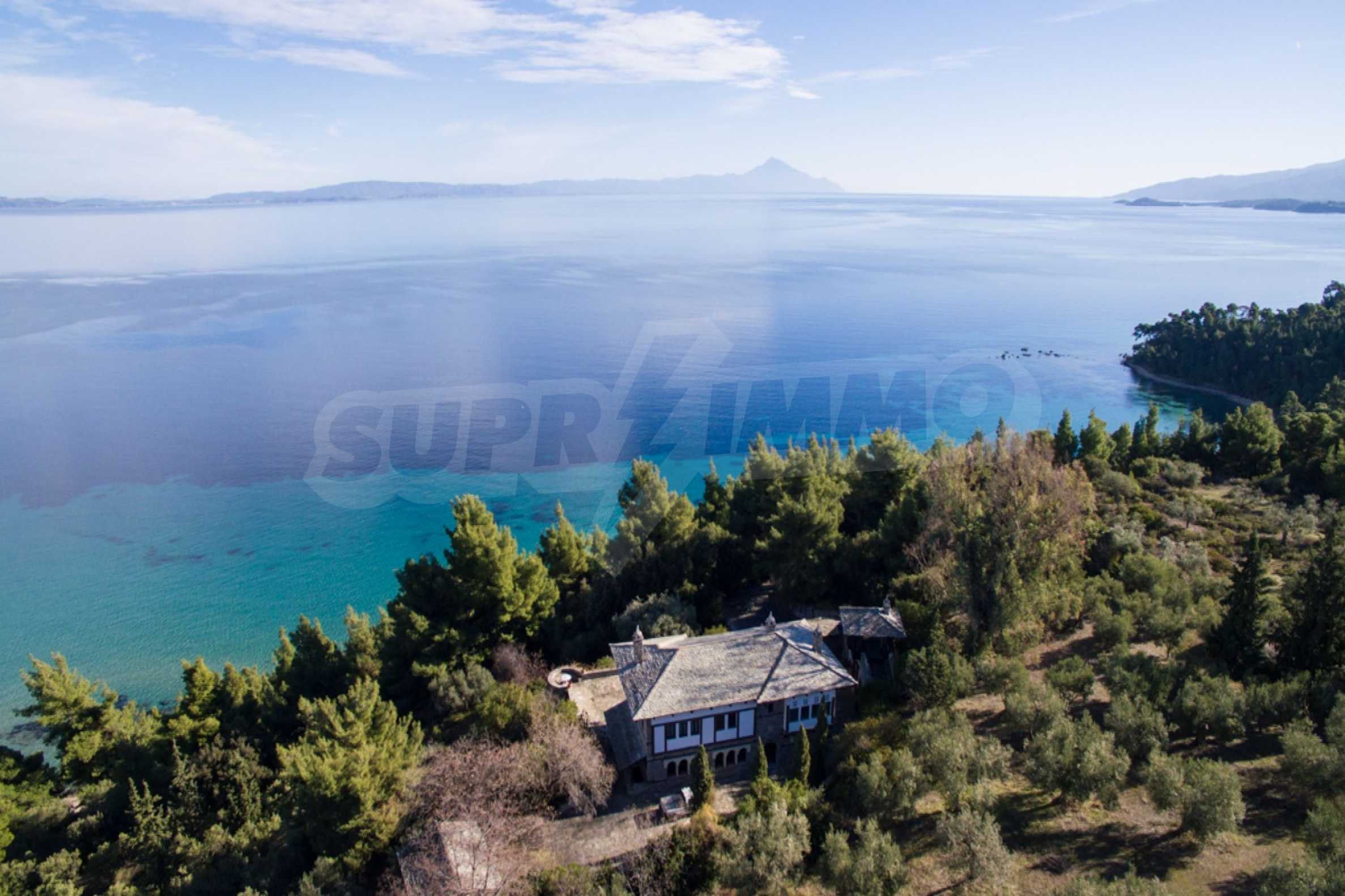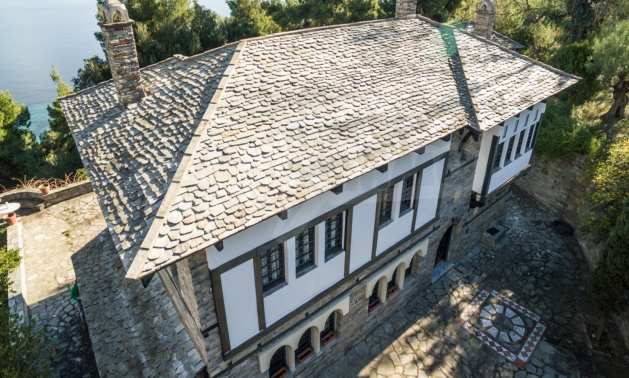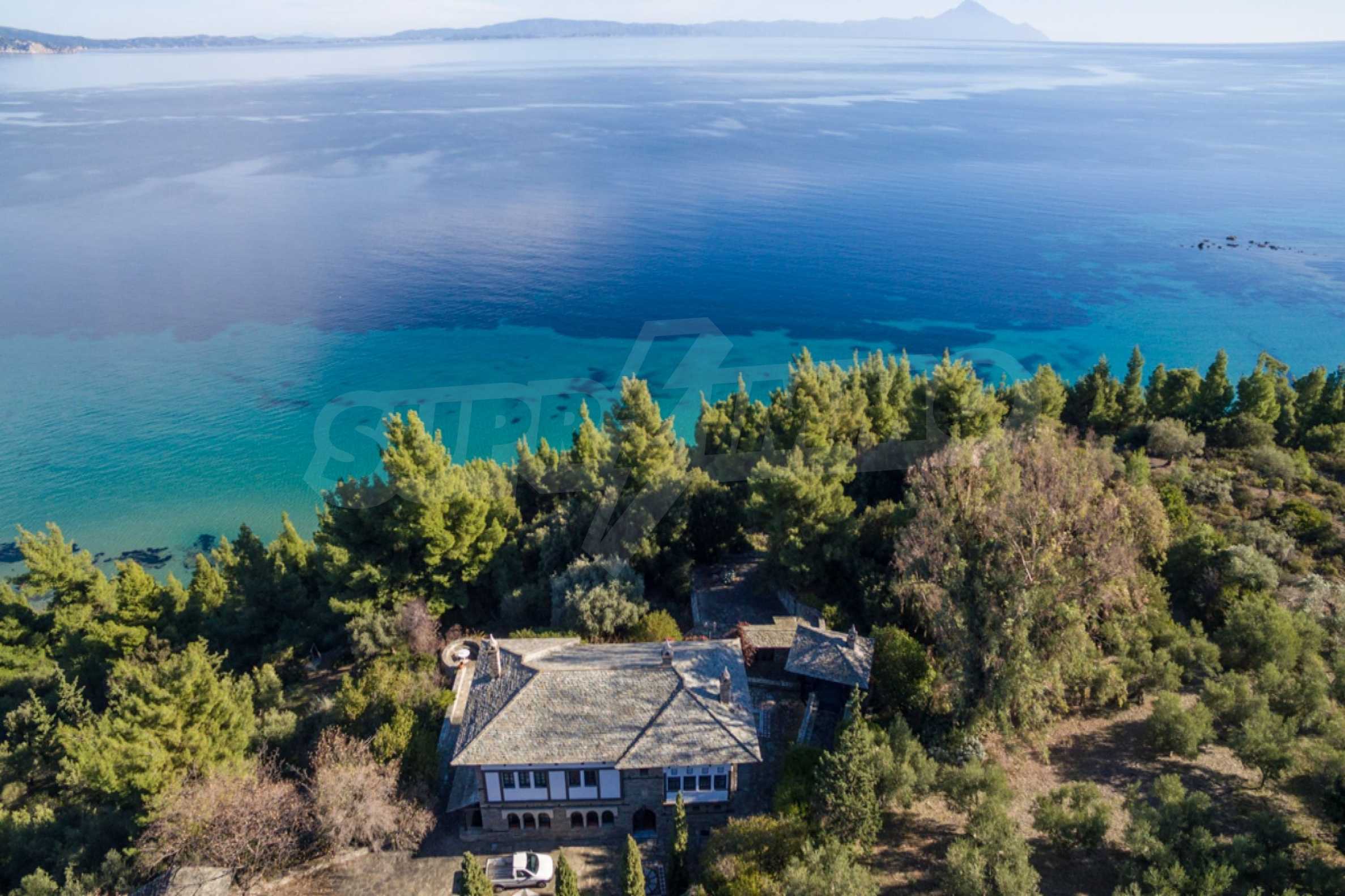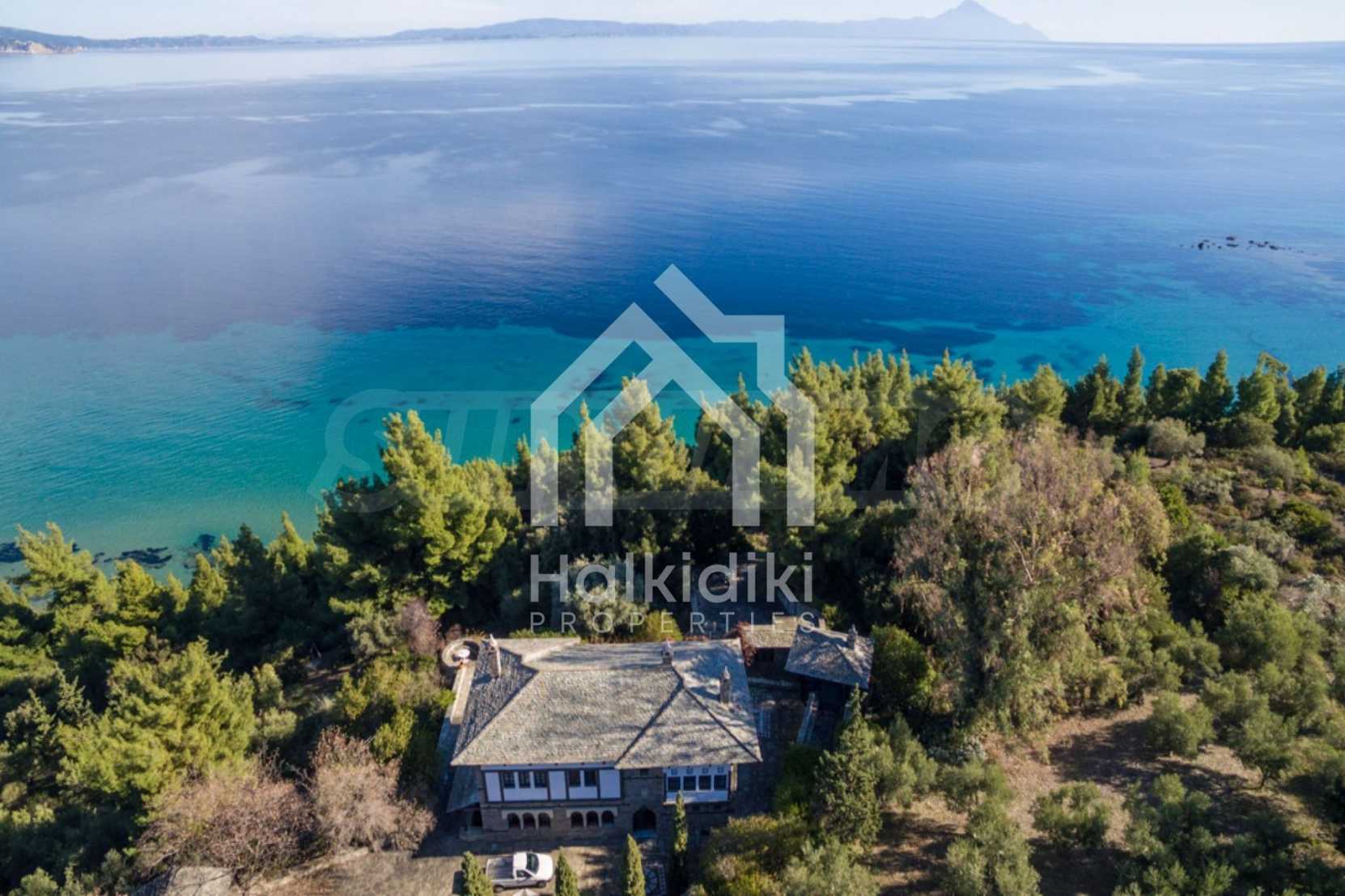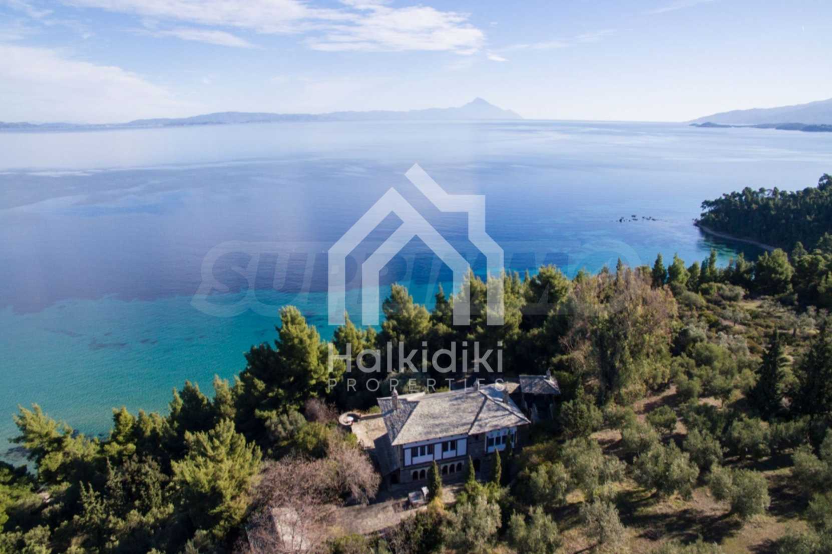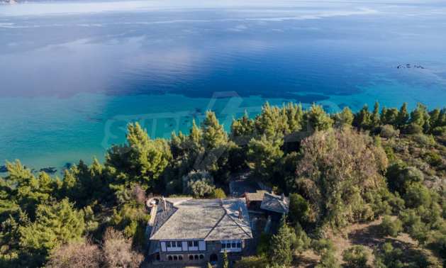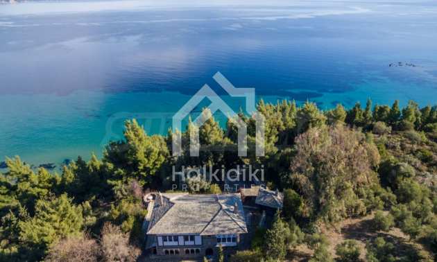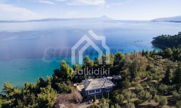 Unique,stone-built villa,400 m²,in Sithonia,Halkidiki with an eastern orientation and with unobstructed permanent view of Mount Athos bay .The property is built on a hill and it is surrounded by 4.350m² pine-covered area.The villa is split in three levels,consisted of three living rooms,a spacious kitchen,four bedrooms,four bathrooms,three wc and two storage rooms.The property,also,has big balconies,wooden joinery,drilling, olive grove,barbecue and a kiosk.
