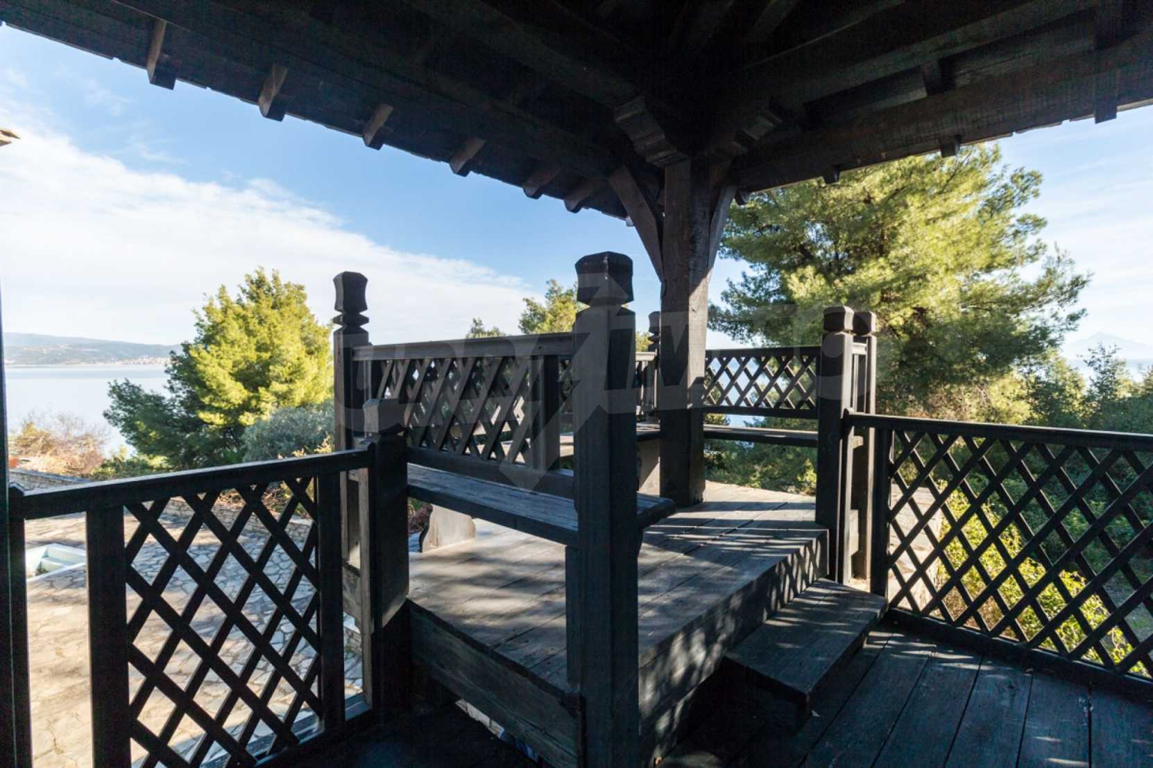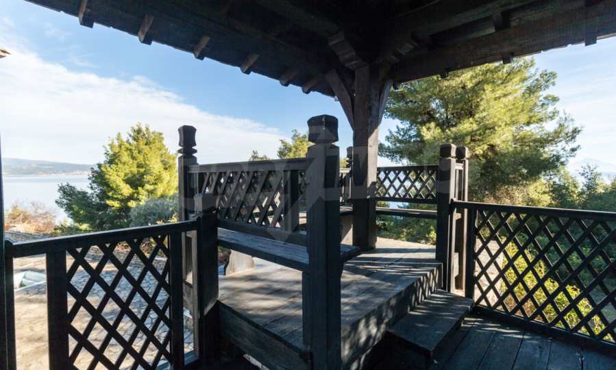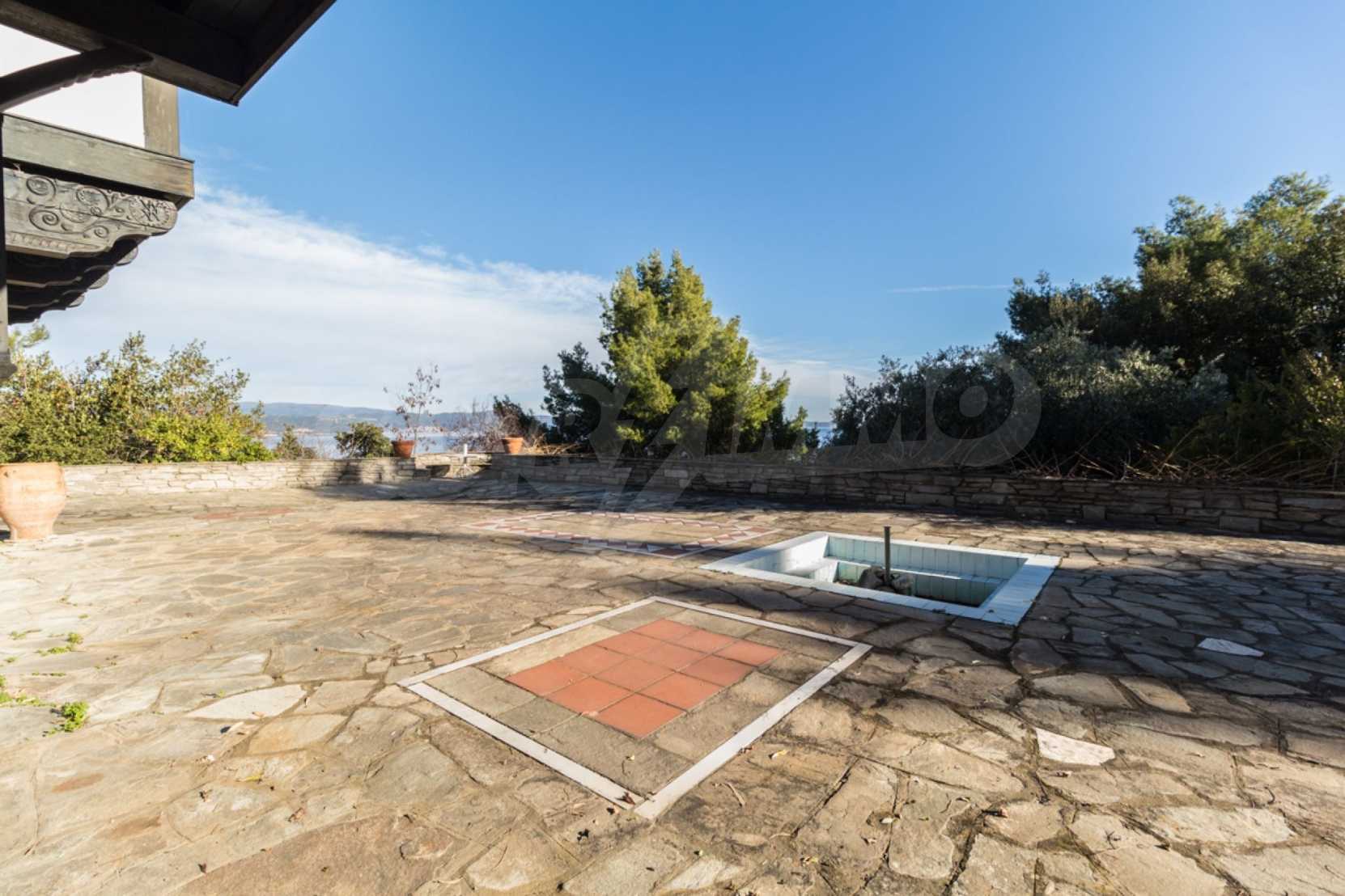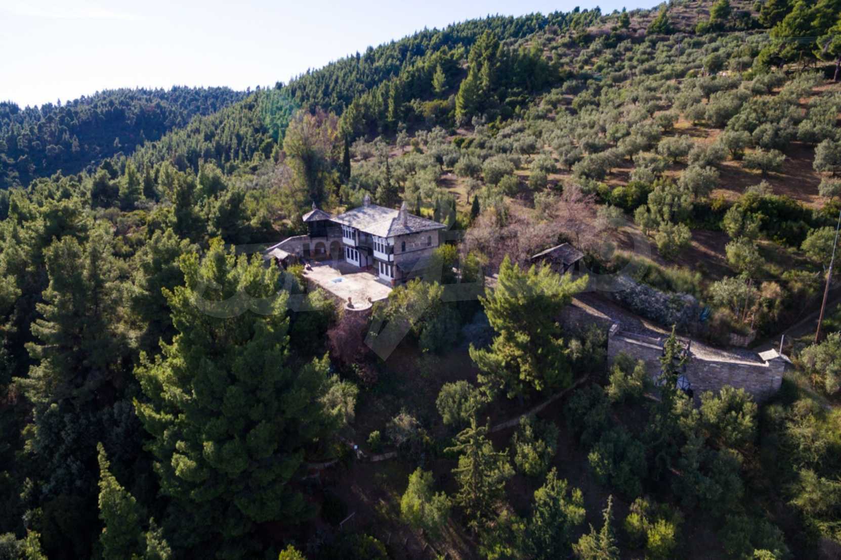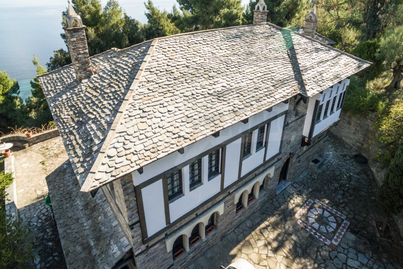 Unique,stone-built villa,400 m²,in Sithonia,Halkidiki with an eastern orientation and with unobstructed permanent view of Mount Athos bay .The property is built on a hill and it is surrounded by 4.350m² pine-covered area.The villa is split in three levels,consisted of three living rooms,a spacious kitchen,four bedrooms,four bathrooms,three wc and two storage rooms.The property,also,has big balconies,wooden joinery,drilling, olive grove,barbecue and a kiosk.