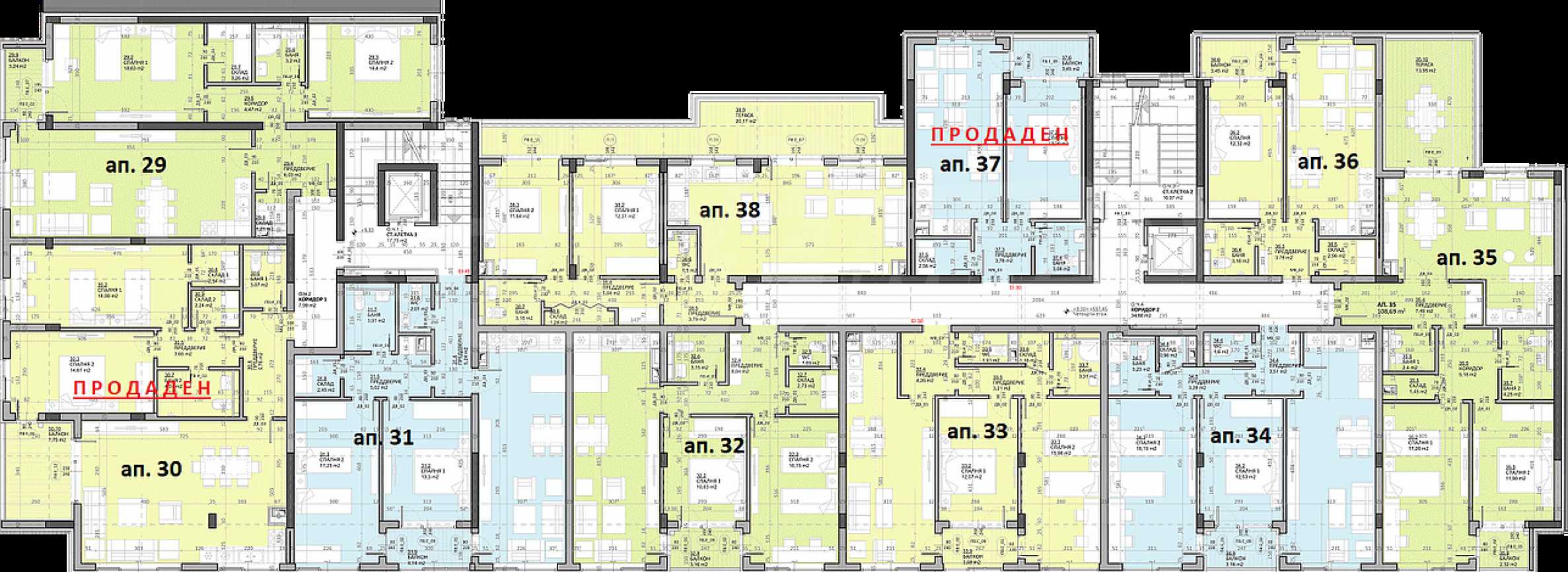 The apartment building has a basement, four above ground and one attic floor. In the basement of the building there is an underground garage, on the ground floor there are 3 shops and 8 garages, and on the ground floors there are 56 apartments.