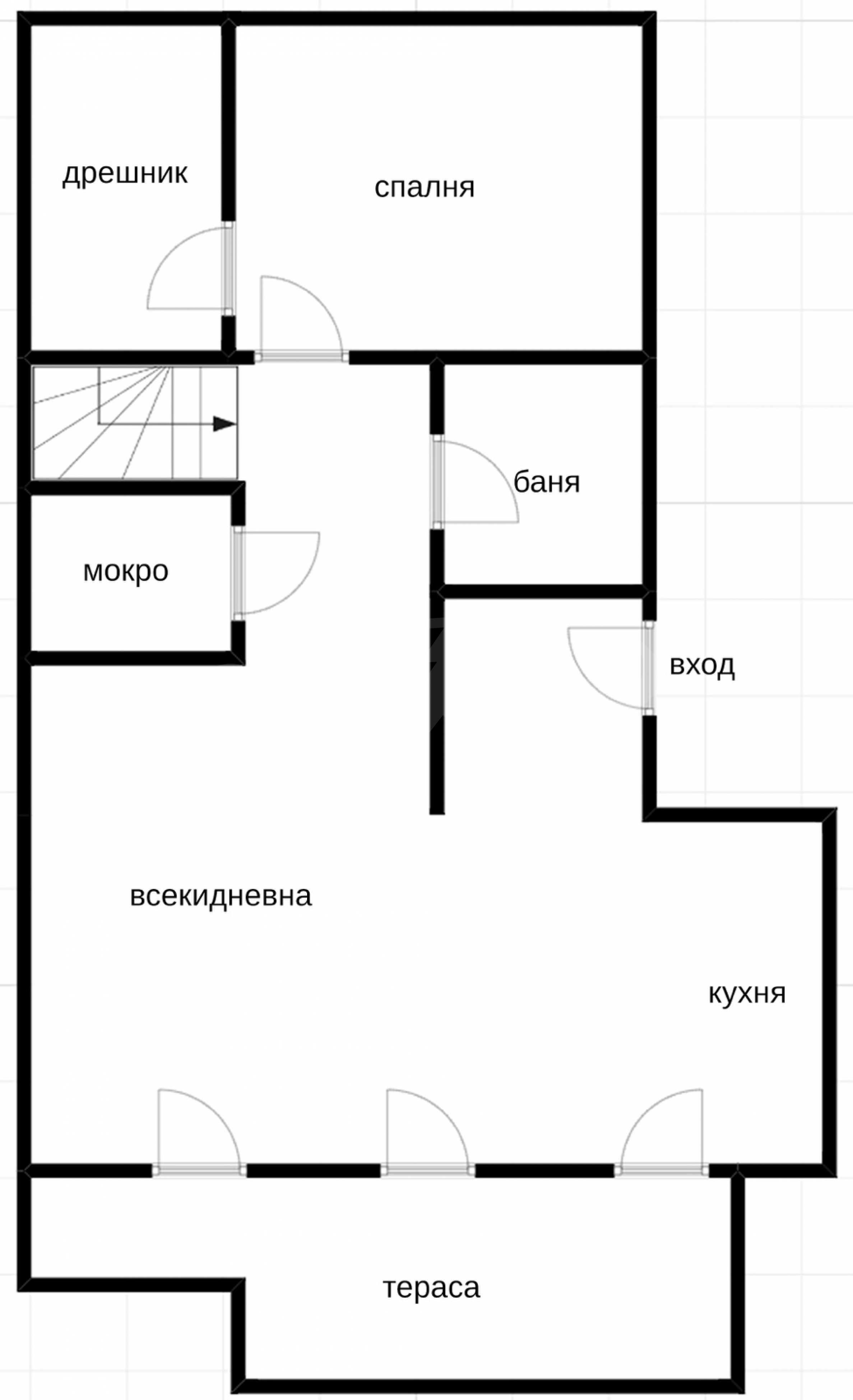 First level: entrance hall, living room with dining area and kitchenette, bathroom with toilet, bedroom with closet, laundry room, terrace with panoramic views of Vitosha Mountain.