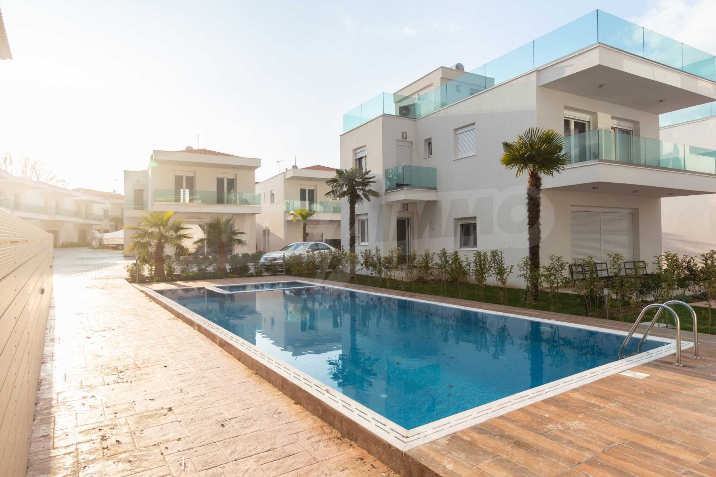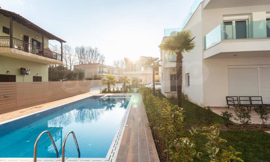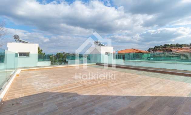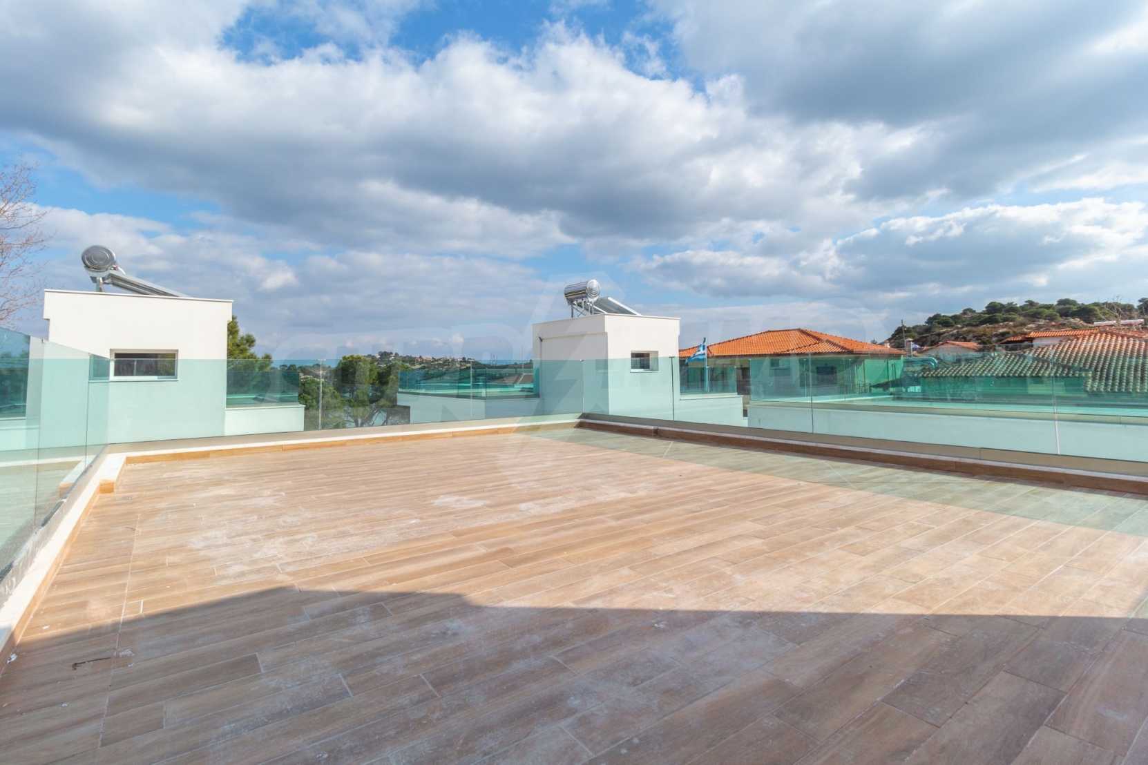 Villa, Sithonia, 116 m², sea view, open view, garden view, Open field, Corner property, Inside village, Sea view, Close to sea, Fenced, Parking, Automated watering, Modeled outside spaces, Fitted closets, Public pool outside, Furnished, Appliances, Solar heater, Spacious garden, Window screens, Alarm system pre-installation, No V.A.T., Independent single house in complex, Airy, Big balconies, Newly-built, Luxurious, Modern construction, High ceiling