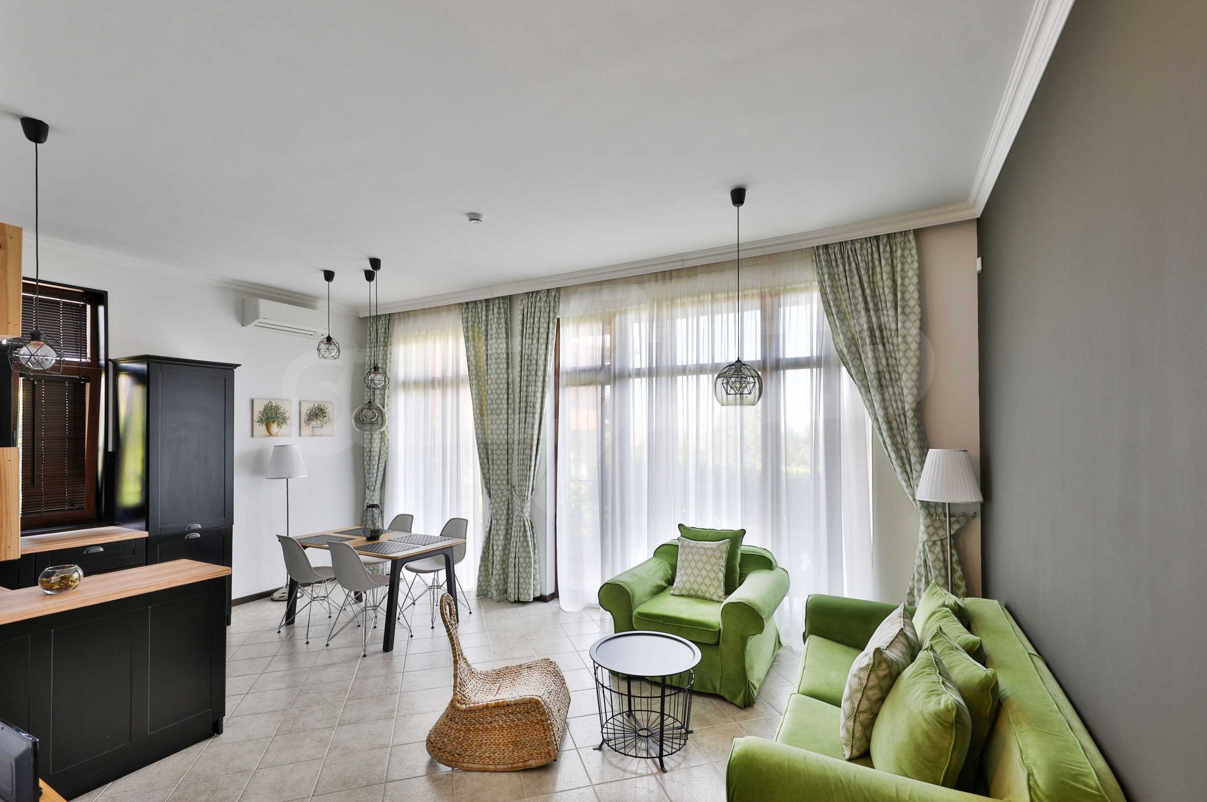 The one-bedroom apartment has a total area of 78.58 square meters and is located on the first floor of a house ¹ 10A, near the restaurant, mini market and the main building. The property is fully furnished and equipped. The comfortable apartment consists of a living room with a kitchen and a dining area, a bedroom, a bathroom and a veranda overlooking the complex, the city and the sea.