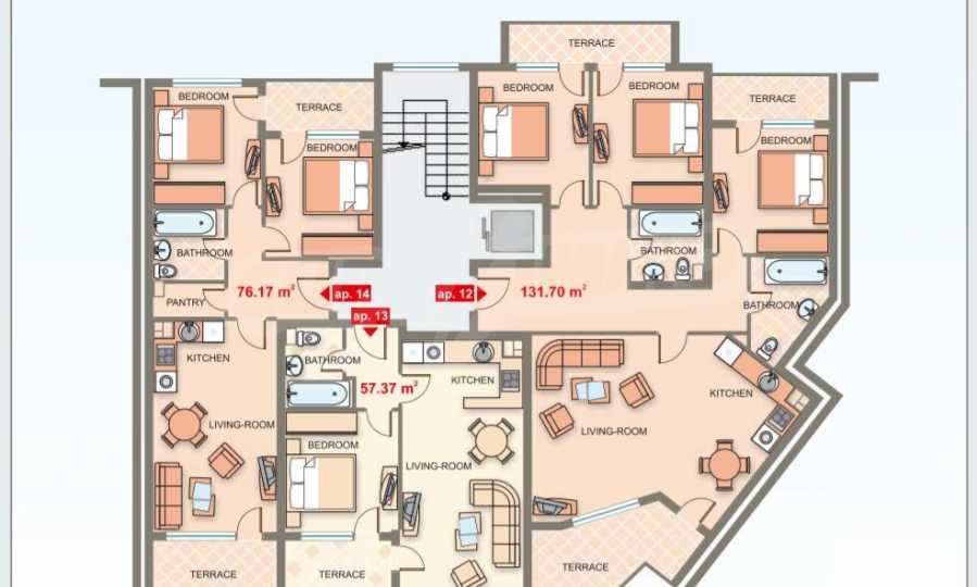 On a clean area of 132 m2 are located: living room with kitchenette, three bedrooms, two combined bathrooms, two terraces to the bedrooms and a spacious terrace to the living room overlooking the sea.