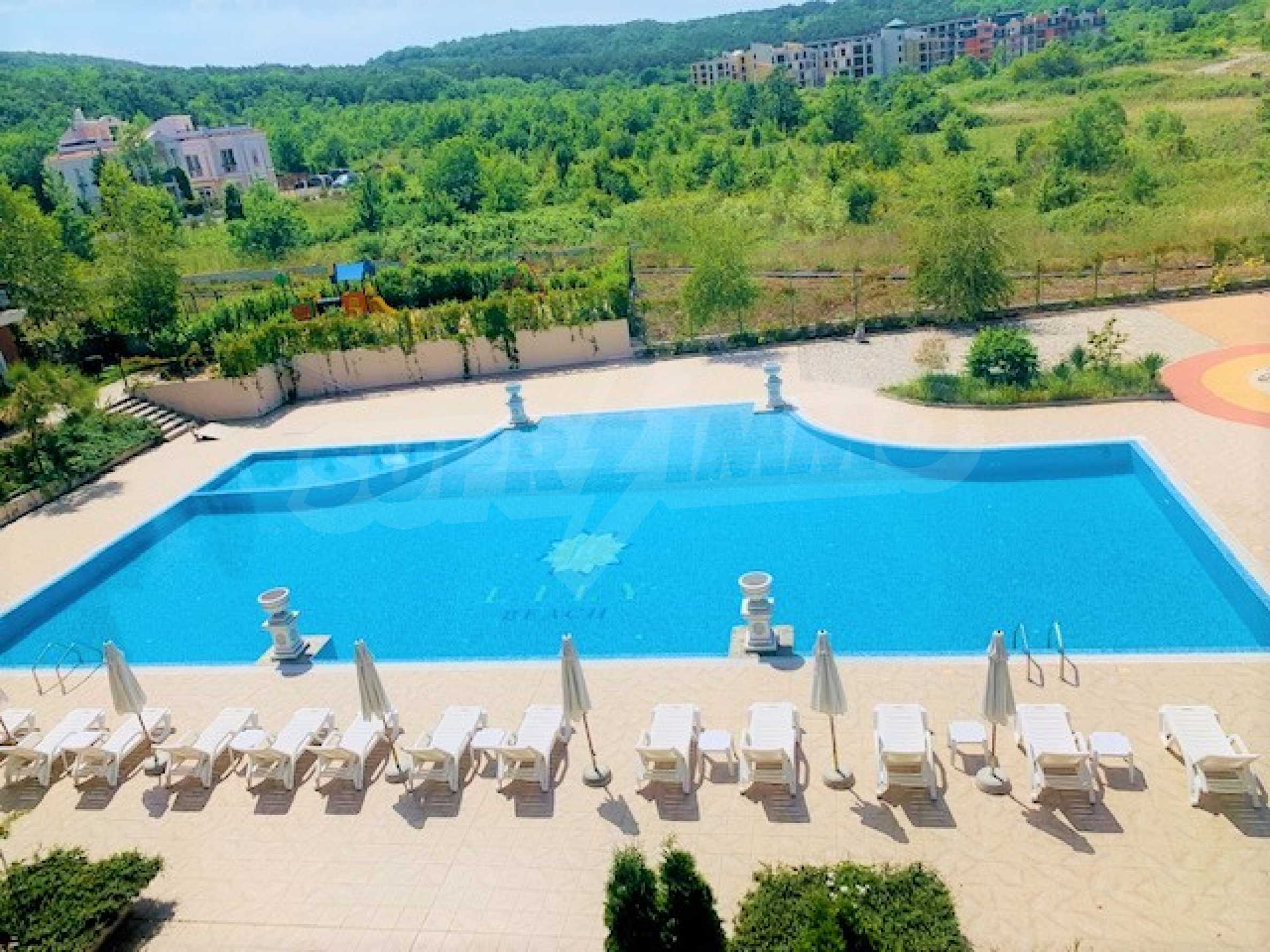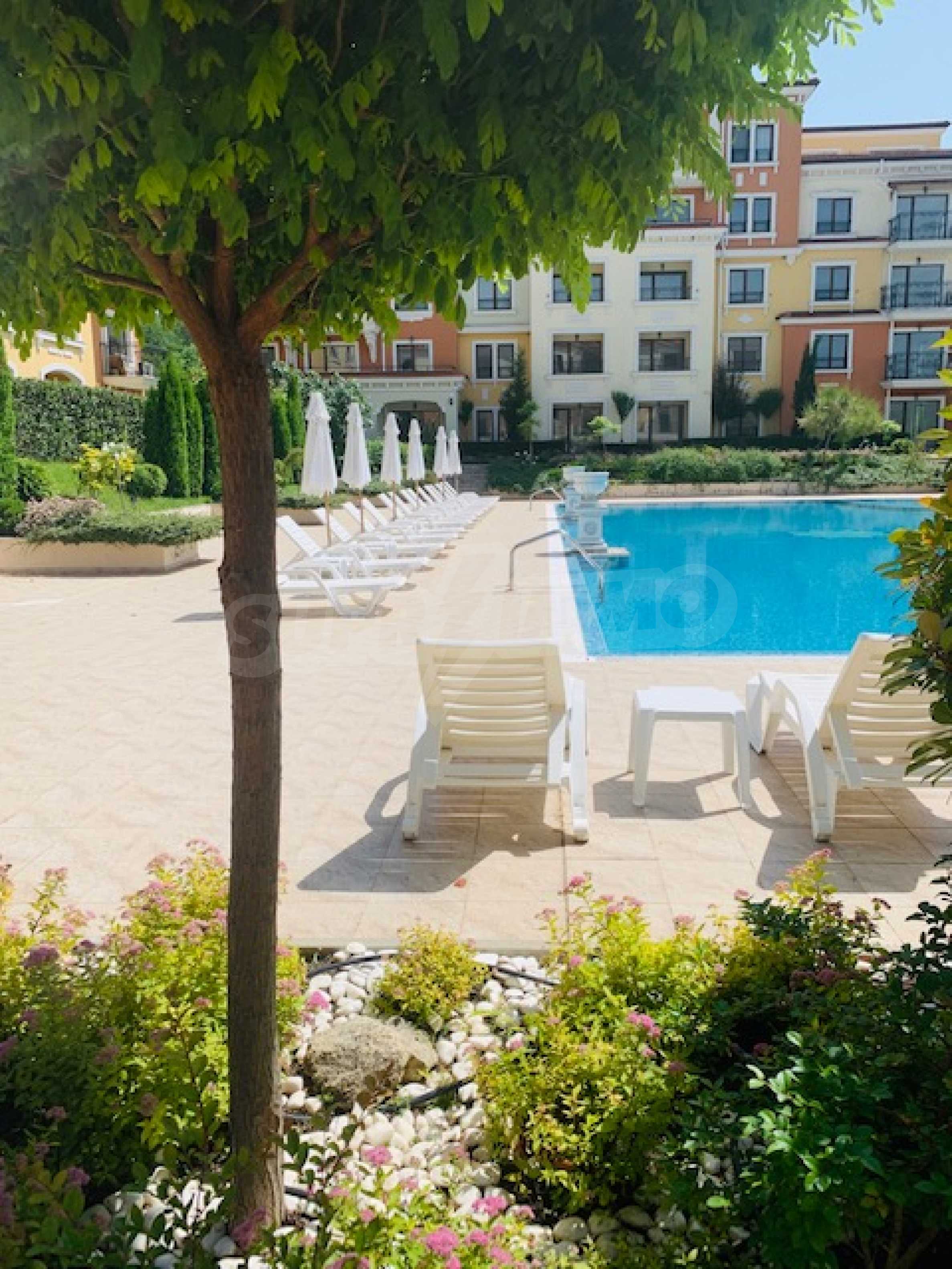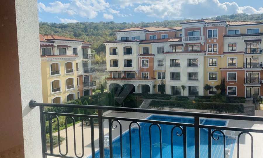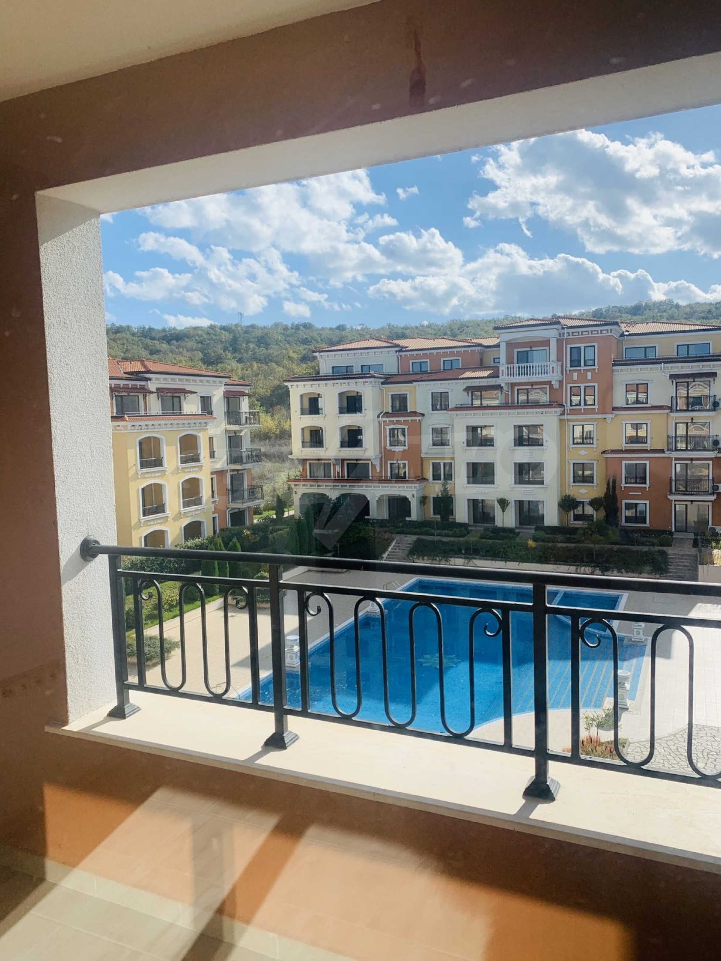 The property is located on the 3rd floor and has a nice terrace overlooking the pool and the interior of the beautiful complex. The apartment consists of an entrance hall, a bathroom with a toilet, a living room with a kitchenette and a living room, a bright bedroom. The practical property is for sale finished "turnkey".