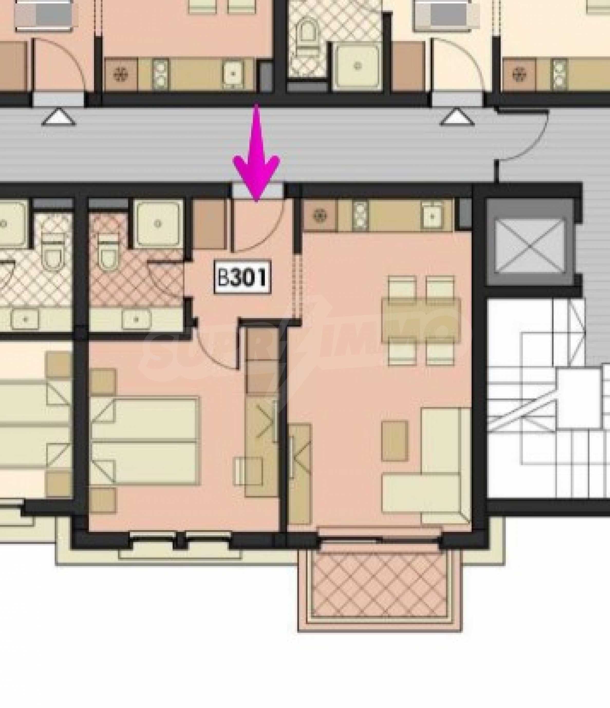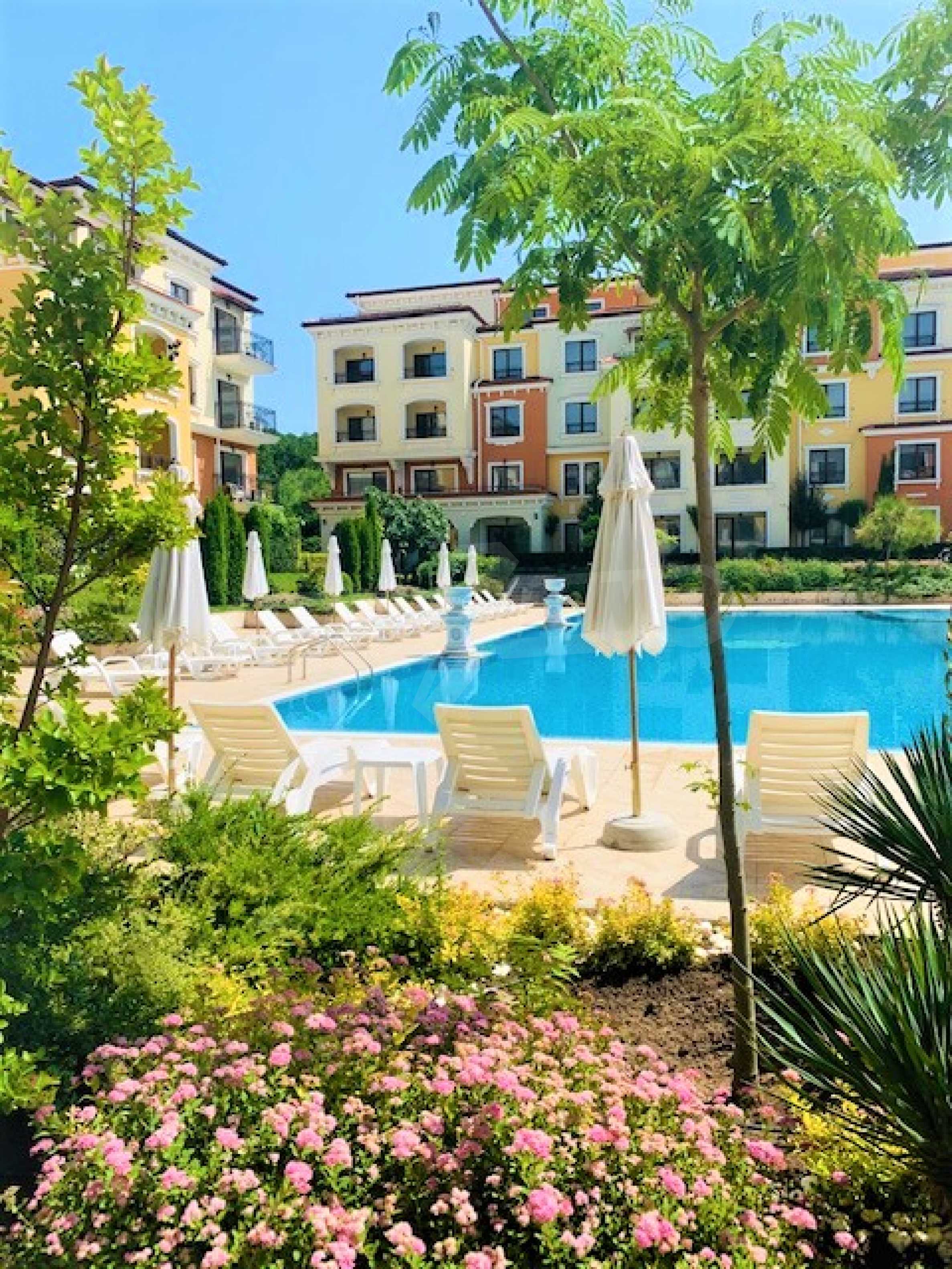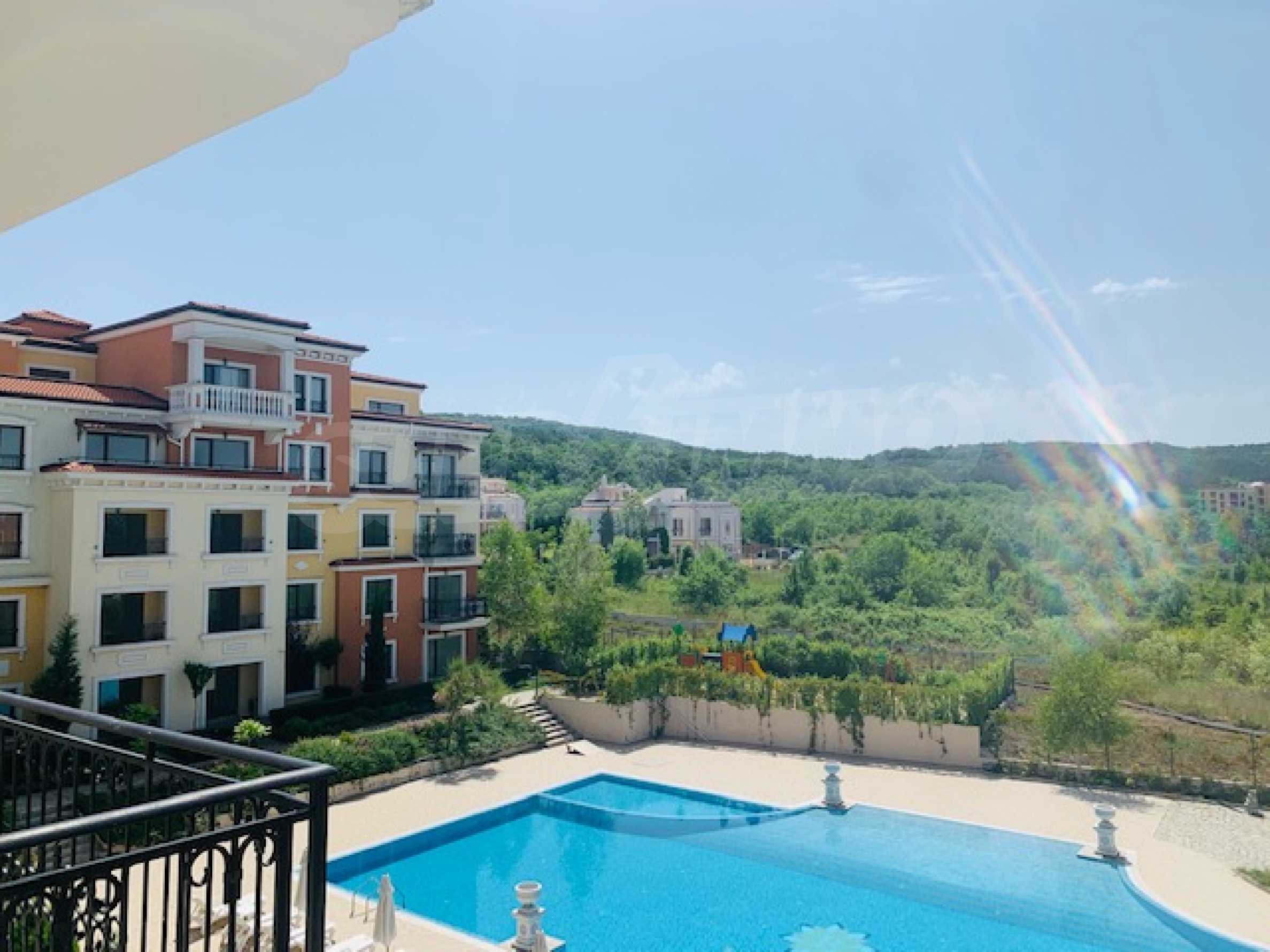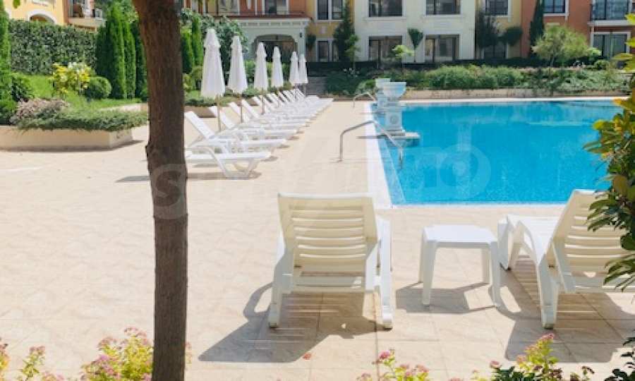 The property is located on the 3rd floor and has a nice terrace overlooking the pool and the interior of the beautiful complex. The apartment consists of an entrance hall, a bathroom with a toilet, a living room with a kitchenette and a living room, a bright bedroom. The practical property is for sale finished "turnkey".