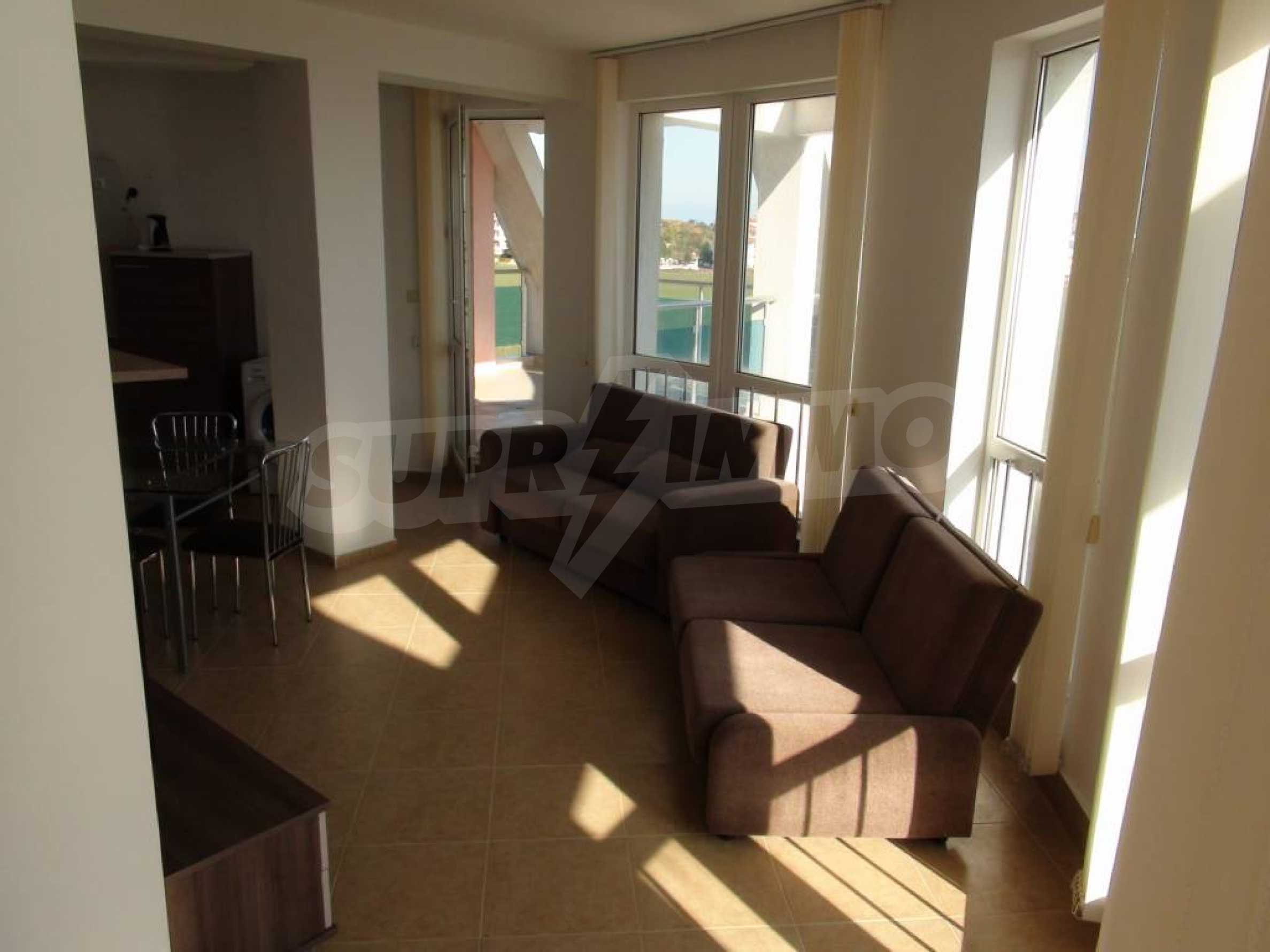 The apartment is located on the 5th floor and has a nice view of the sea, the beach and the complex.
