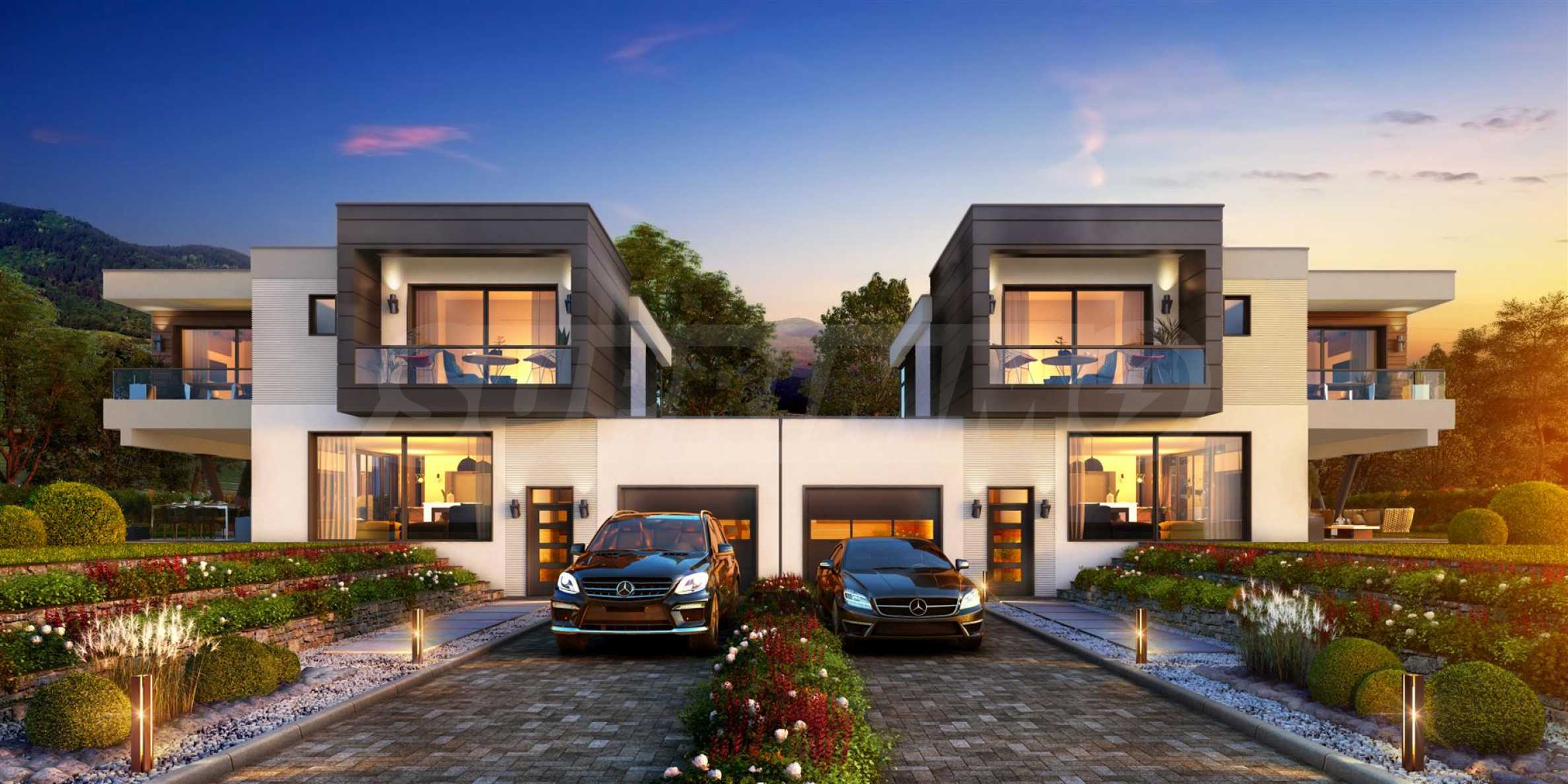 The quality of the materials used to build the houses is at the highest world level. The entire construction is brick, insulation on brick walls with Rockwool Fasrock stone wool, 3-layer glass units, aluminum joinery with sliding systems.