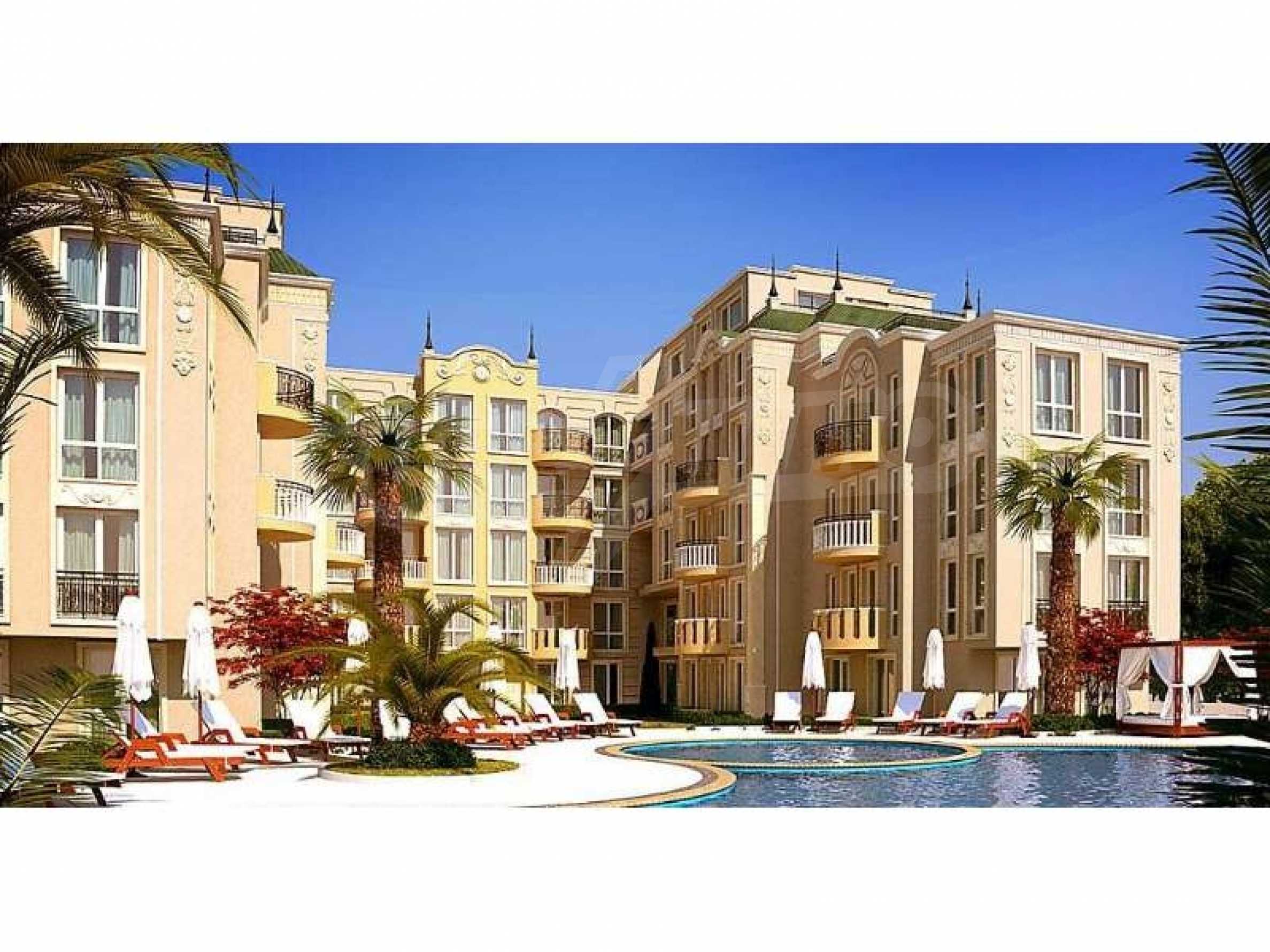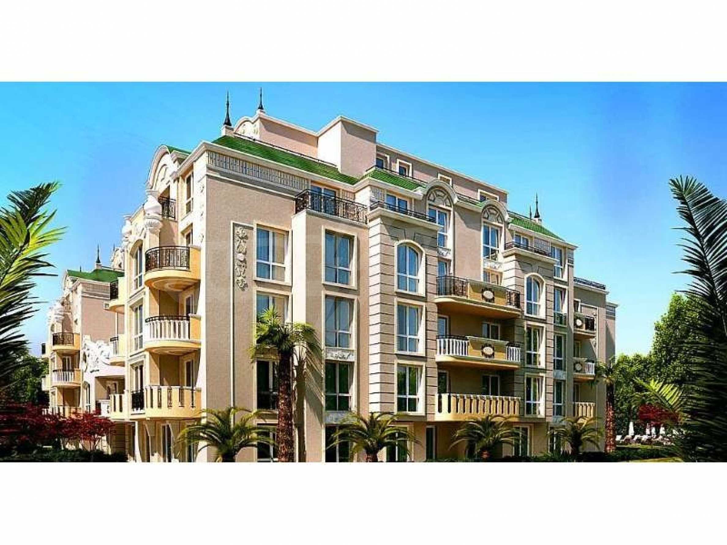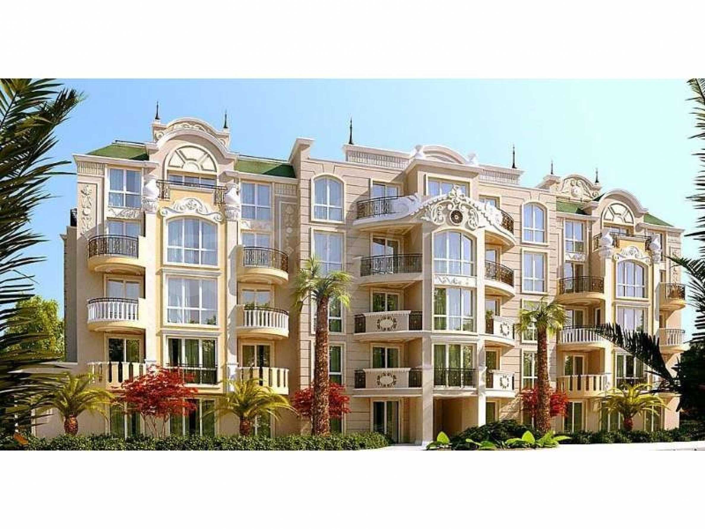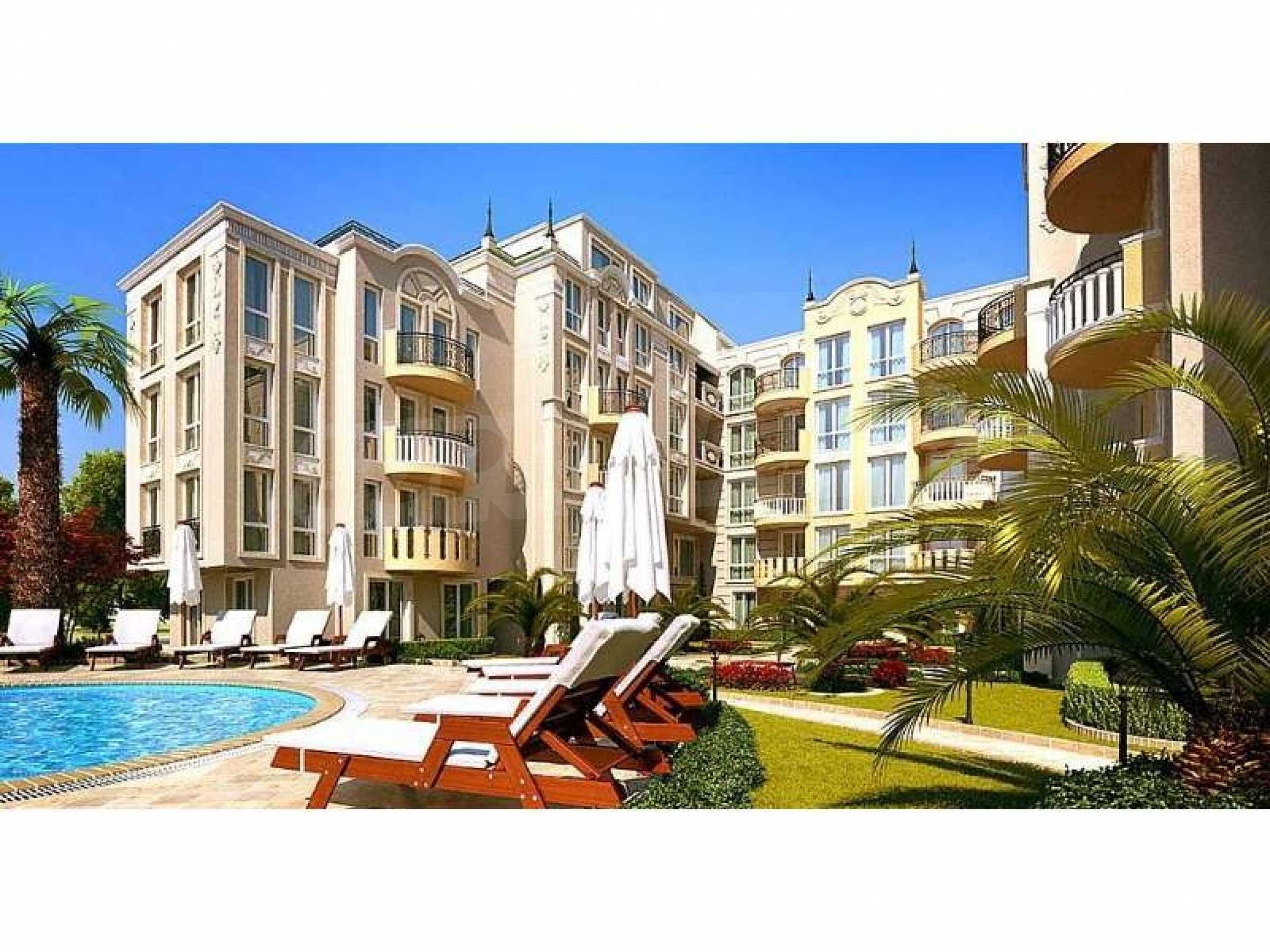 We bring to your attention a new complex located in the central part of the village of Ravda. The complex is located 400 meters from the central beach. Its construction will be completed in June 2020. The new complex is distinguished by its luxurious and sophisticated architectural appearance in the spirit of Rococo. A large area with a magnificent garden that creates a sense of tranquility and privacy. The complex has a luxurious swimming pool with sun beds, equipped playground, gazebo and places for walking.The complex has studios from 32.71 to 36.84 sq.m. 66.9 to 121.69 sq.m. and a 3-bedroom penthouse of 186 sq.m. The windows and doors are fitted with thermal bridges, the front doors are armored, the interior doors are MDF, the rooms are air-conditioned. The flooring is made of granite and laminate. Prices start from 24538 euros.