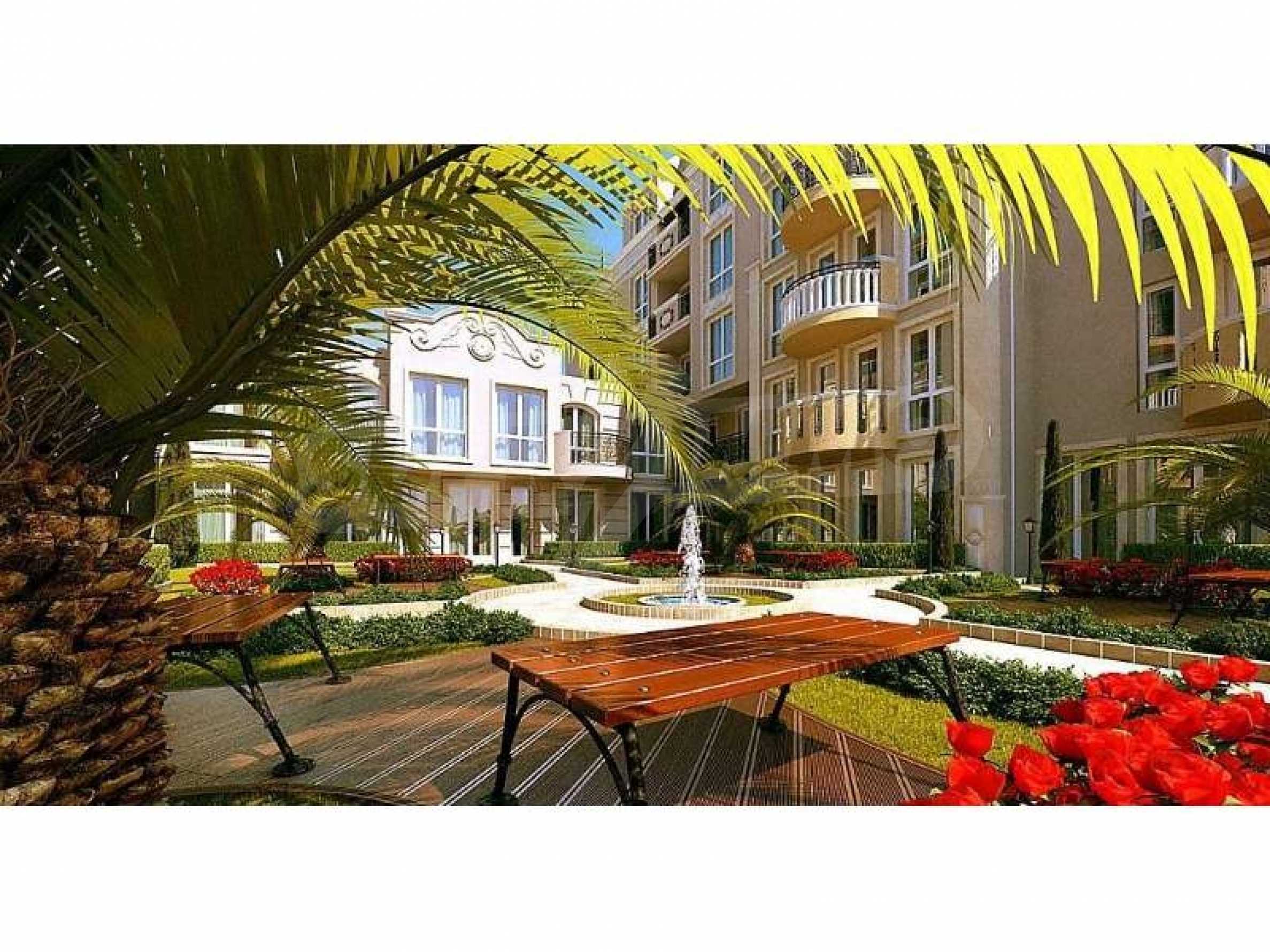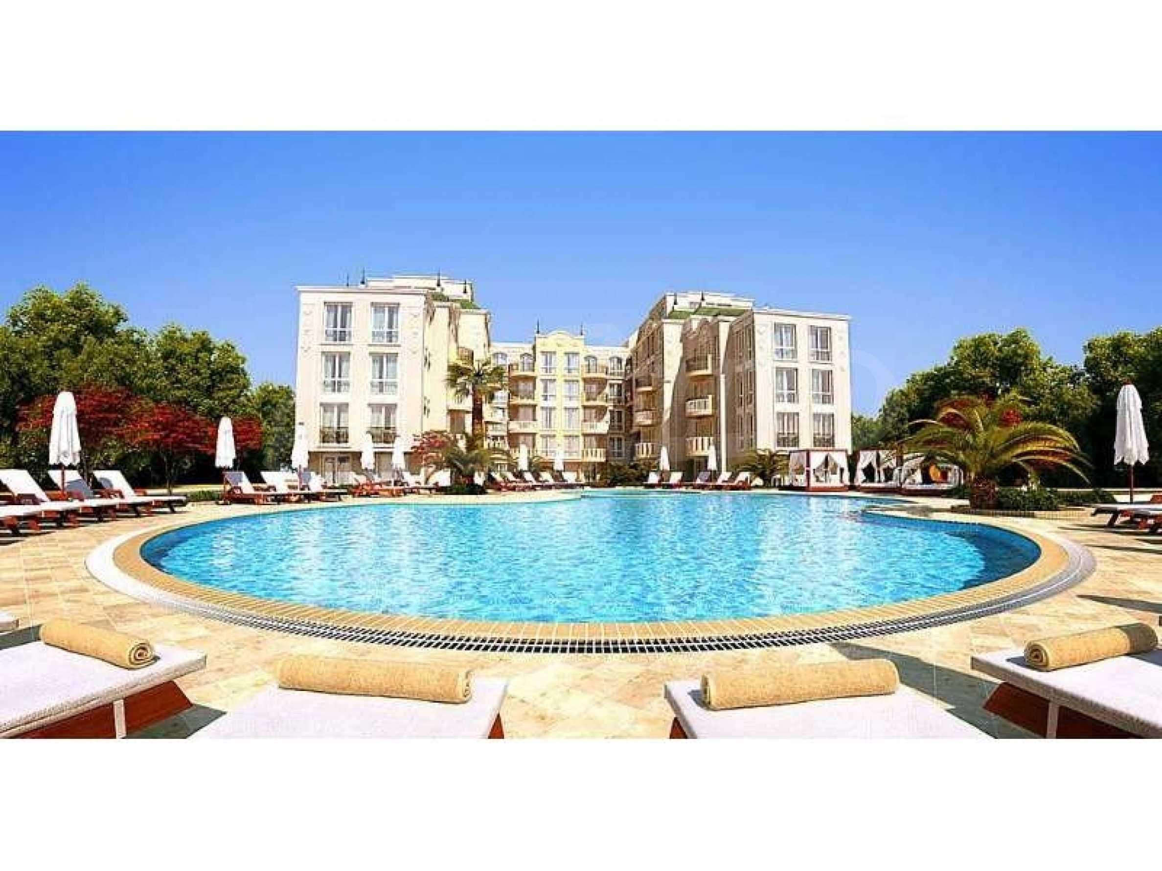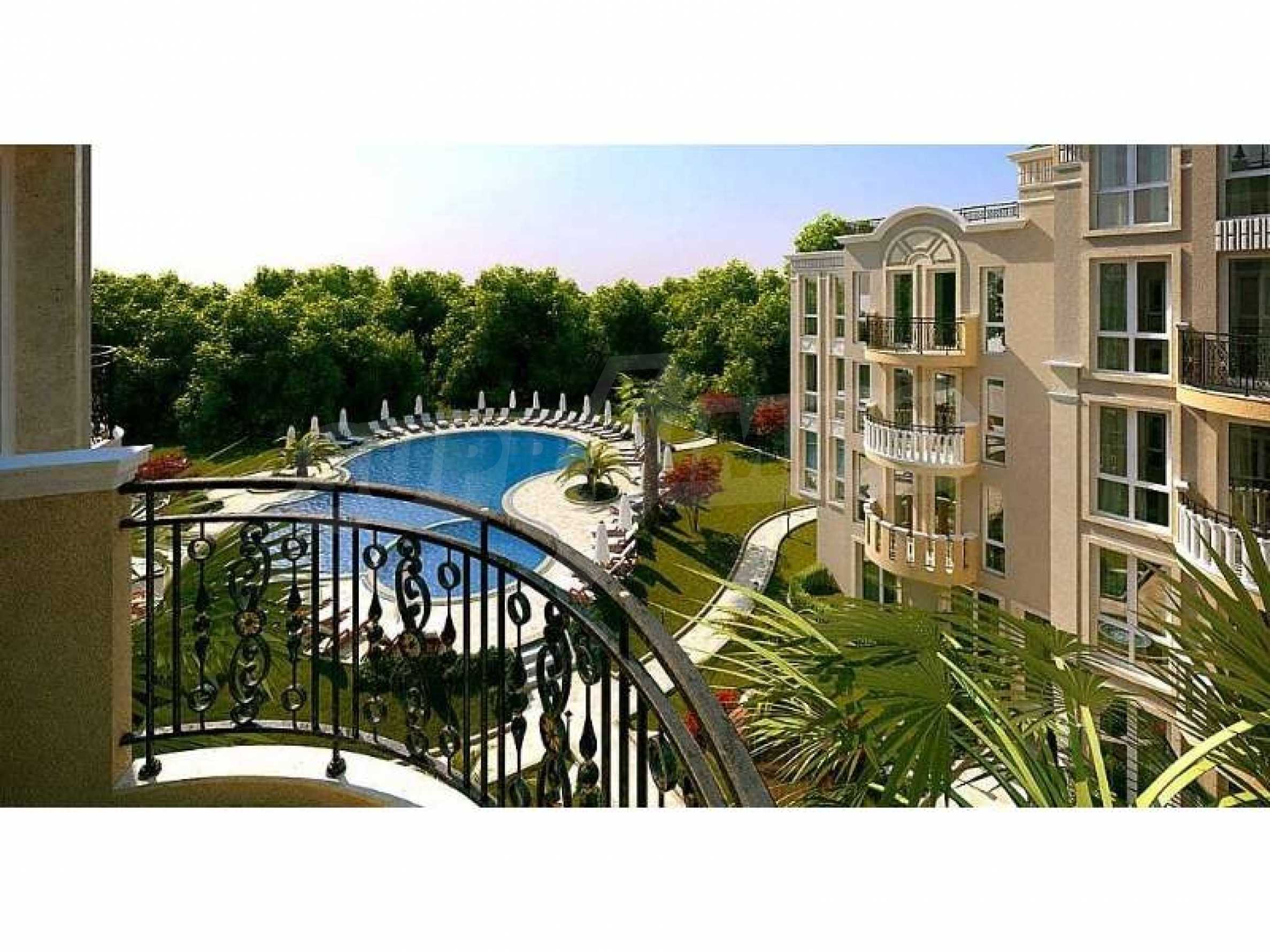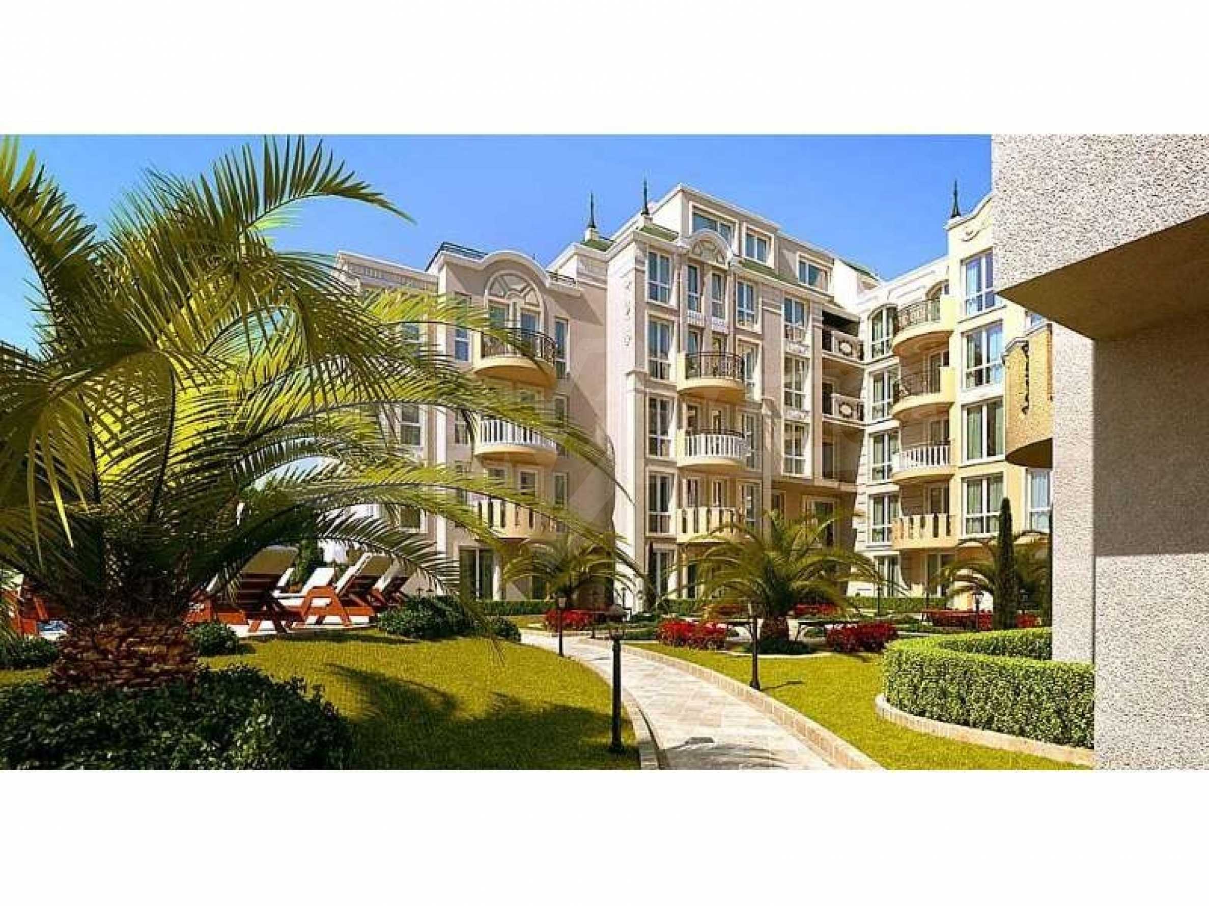 We bring to your attention a new complex located in the central part of the village of Ravda. The complex is located 400 meters from the central beach. Its construction will be completed in June 2020. The new complex is distinguished by its luxurious and sophisticated architectural appearance in the spirit of Rococo. A large area with a magnificent garden that creates a sense of tranquility and privacy. The complex has a luxurious swimming pool with sun beds, equipped playground, gazebo and places for walking.The complex has studios from 32.71 to 36.84 sq.m. 66.9 to 121.69 sq.m. and a 3-bedroom penthouse of 186 sq.m. The windows and doors are fitted with thermal bridges, the front doors are armored, the interior doors are MDF, the rooms are air-conditioned. The flooring is made of granite and laminate. Prices start from 24538 euros.