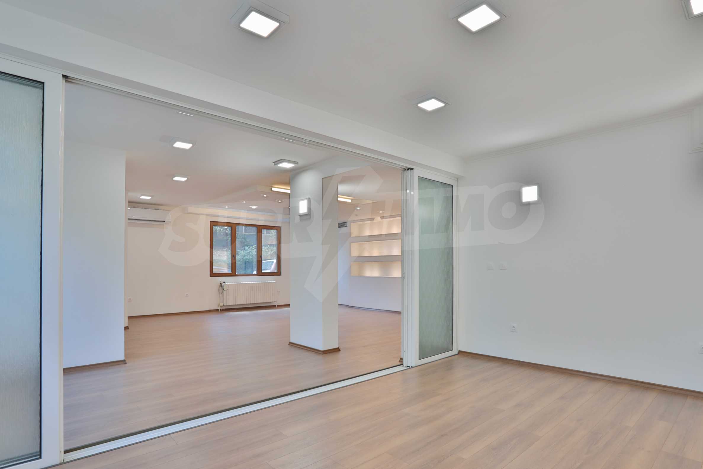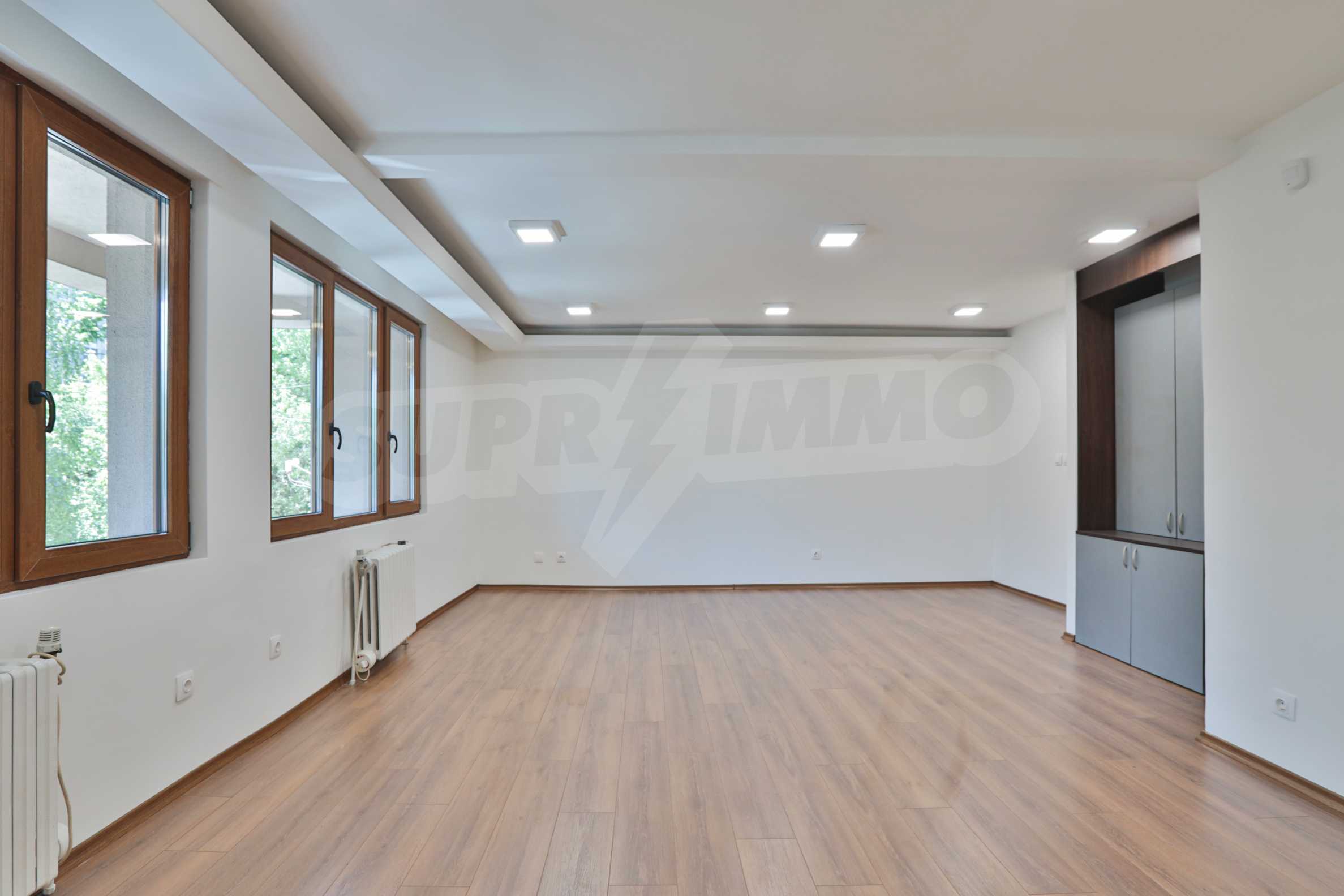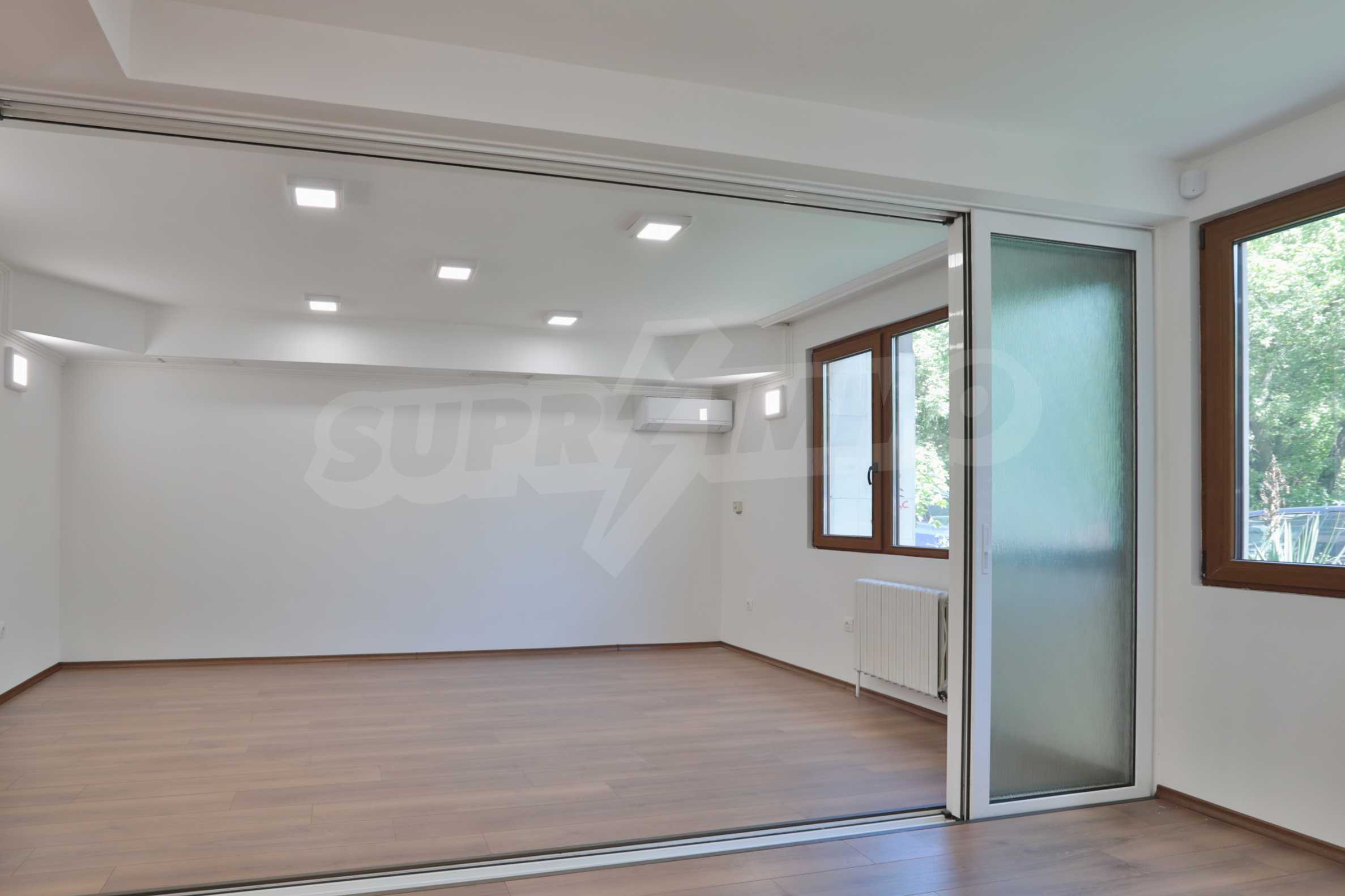 It has air conditioning, ventilation, central heating, security wiring, external insulation and a high standard of windows. The office is after major repairs - with laminate flooring and granite, elegant built-in ice lighting; walls painted with latex, separate air conditioning for each room; equipped bathroom and toilets; furnished archive room; has a kitchen that could be equipped according to the wishes of the tenants.