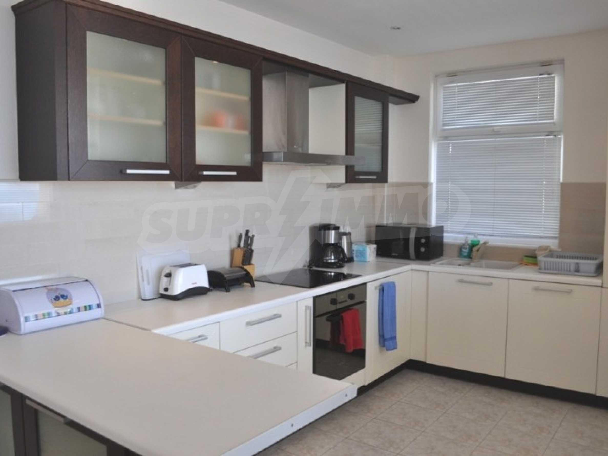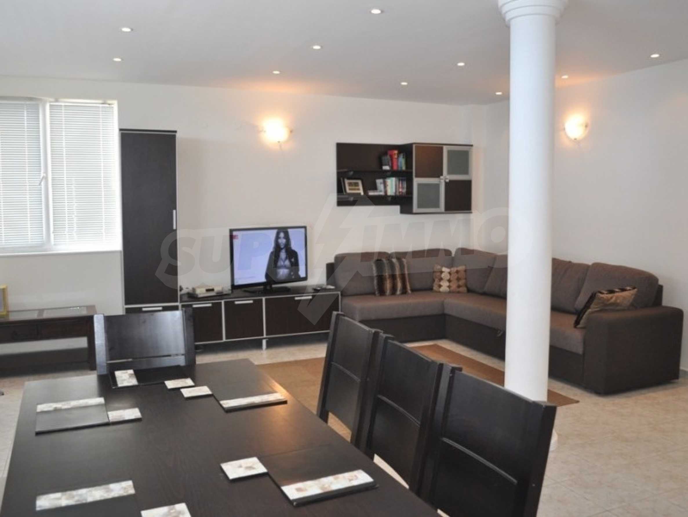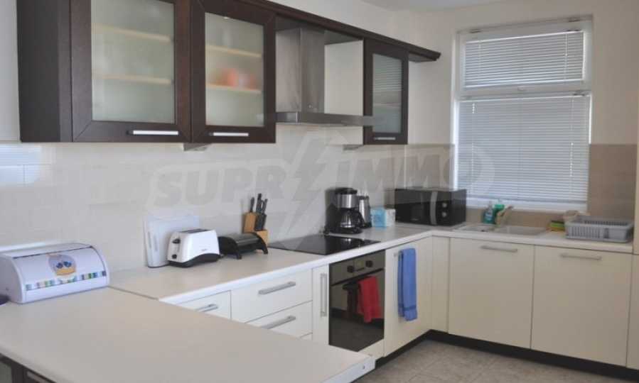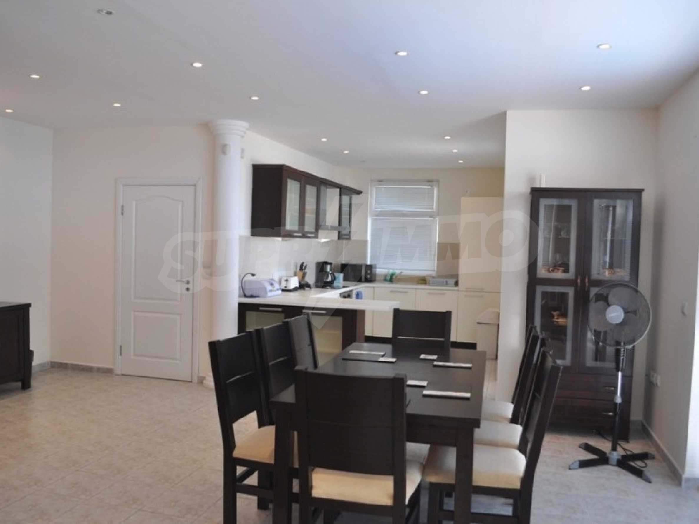 The spacious living room on the ground floor perfectly combines a fully equipped kitchen - refrigerator, oven, 4 ceramic hobs, microwave, toaster, dishwasher and washing machine, dining area with 6 seats and comfortable sofas with plasma TV.