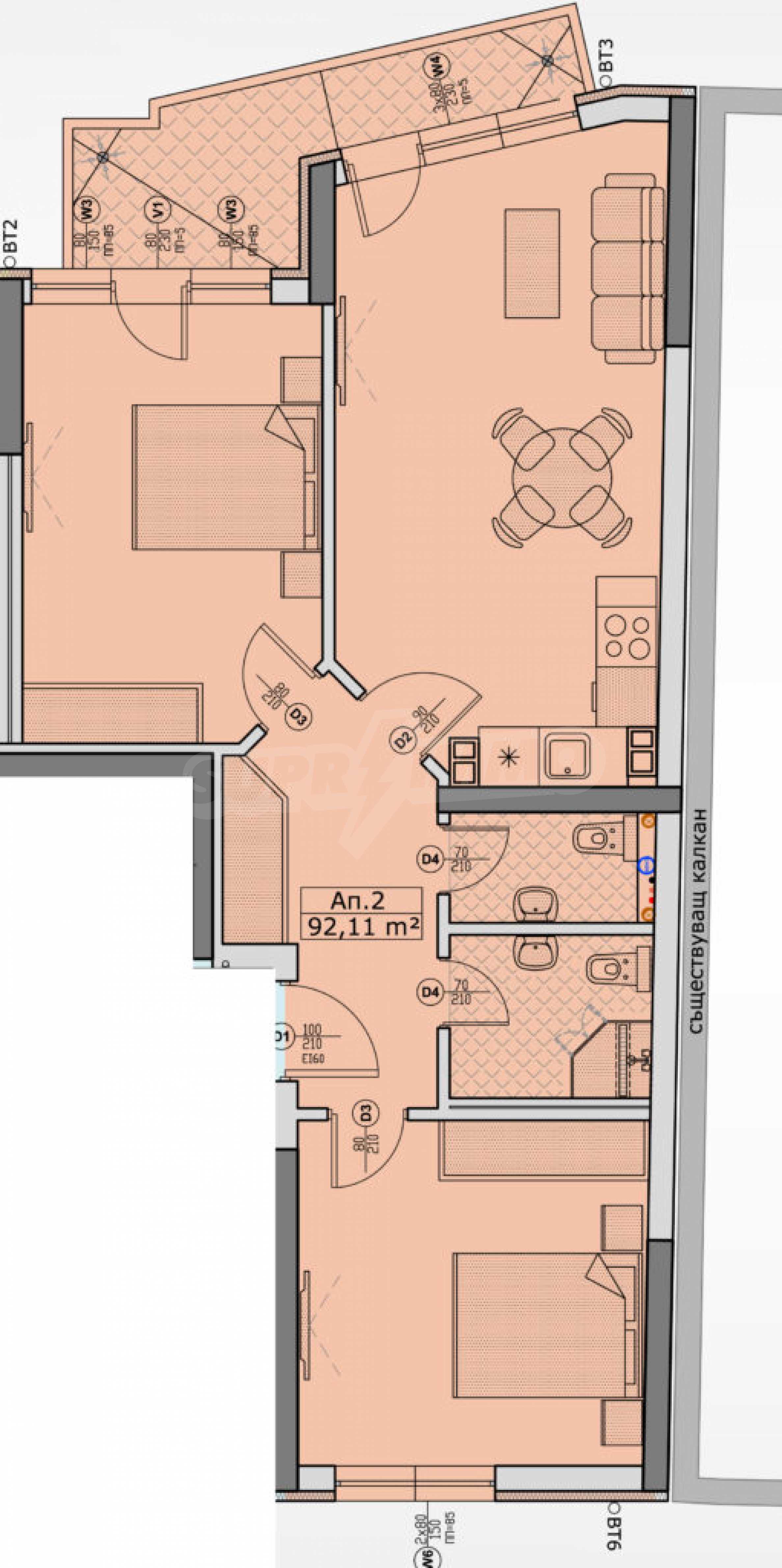 The apartment has a total area of 93.16 m2. / built-up area 78.10 m2./. It consists of an entrance hall, a corridor, a spacious living room with a dining area and a kitchenette, two separate bedrooms, a bathroom with a toilet, a toilet and a terrace.