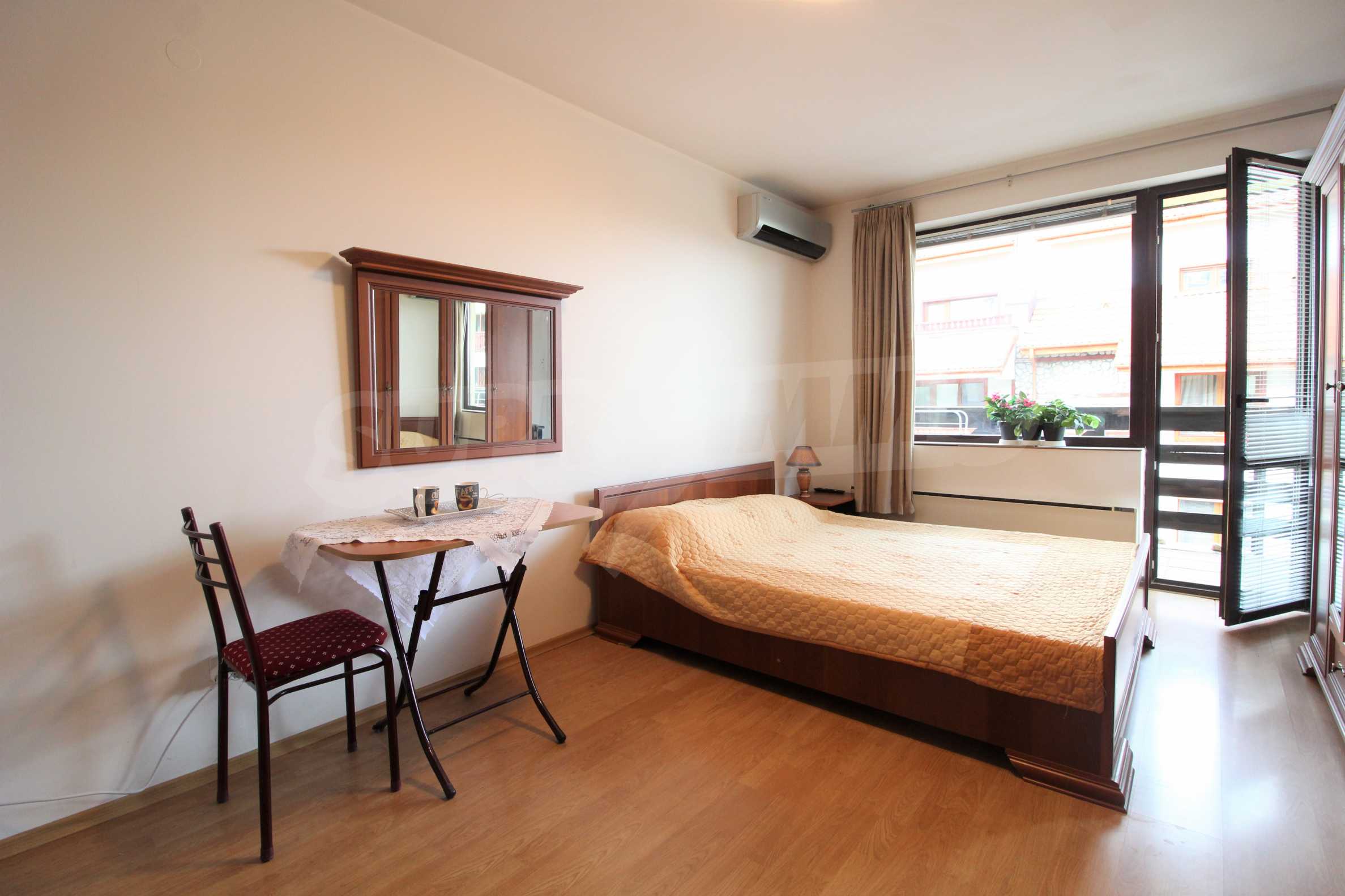 The studio has a total area of 45 m2. and consists of an entrance hall, a small kitchen, a bedroom with a double bed, a terrace. The bathroom is fully equipped and has a toilet, shower, sink, mirror. The apartment is fully finished, furnished and ready to move in.