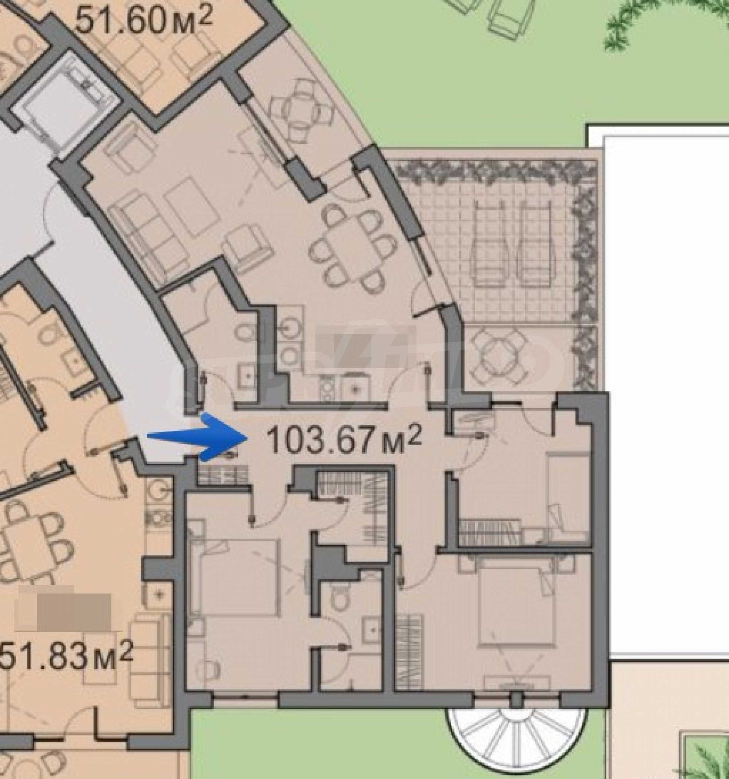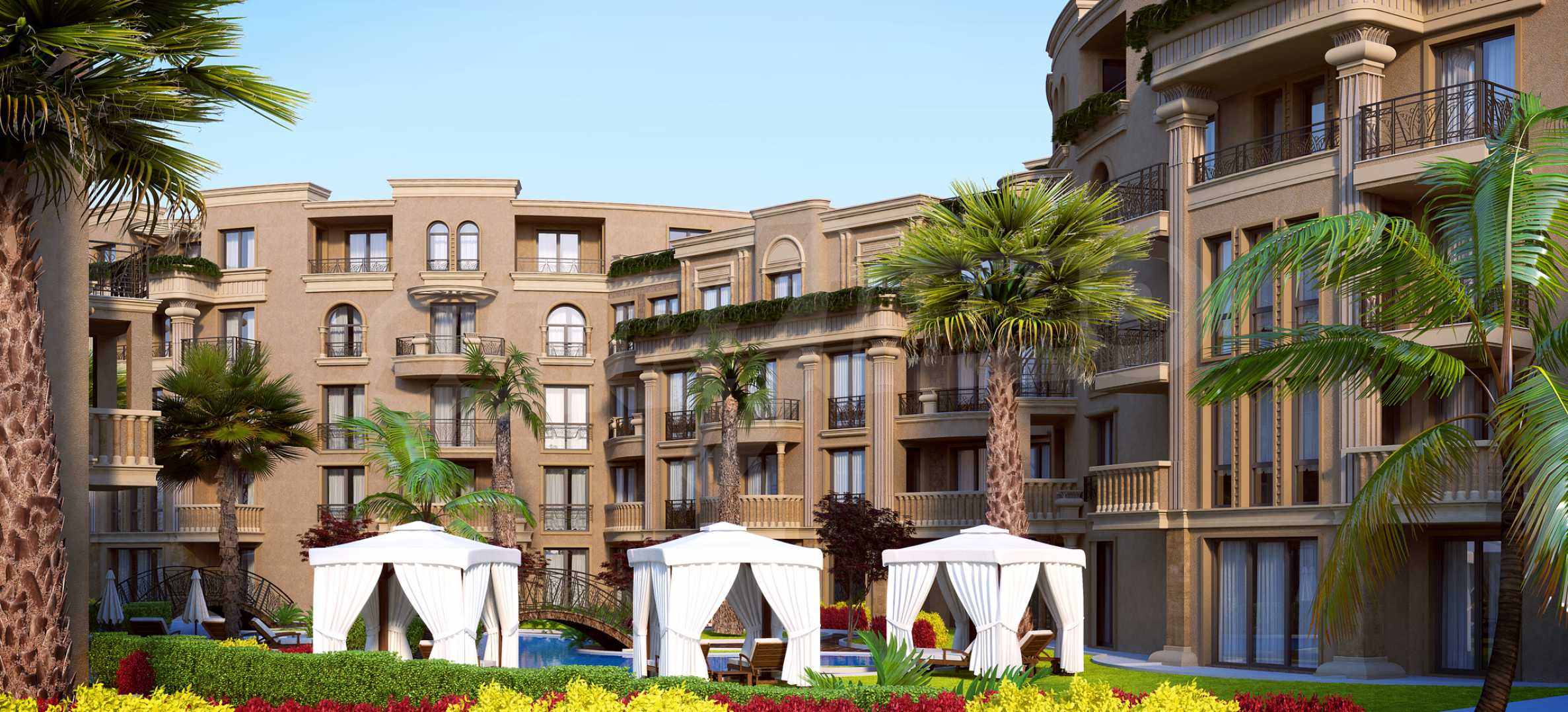 The architecture follows the sophisticated line of the already built and put into operation complexes of the famous construction and investment company, with over 20 years of successful market experience. The buildings will stand out with warm sandy shades on the facades and high columns, cornices and openwork railings, with a measured proportion of every detail. The complex provides parking, children's pool, playground, restaurant, massage area, sauna.